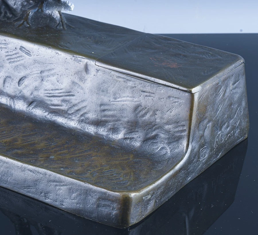 The inkwell is signed F. Gornik (Frederick Gornik 1877–1943), known for his detailed wildlife sculptures. The foundry mark “AR” stands for Arthur Rubenstein, the foundry where this piece was cast.