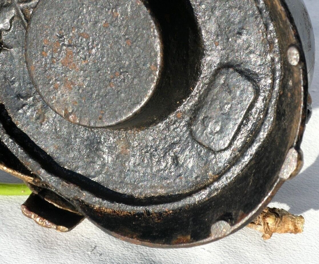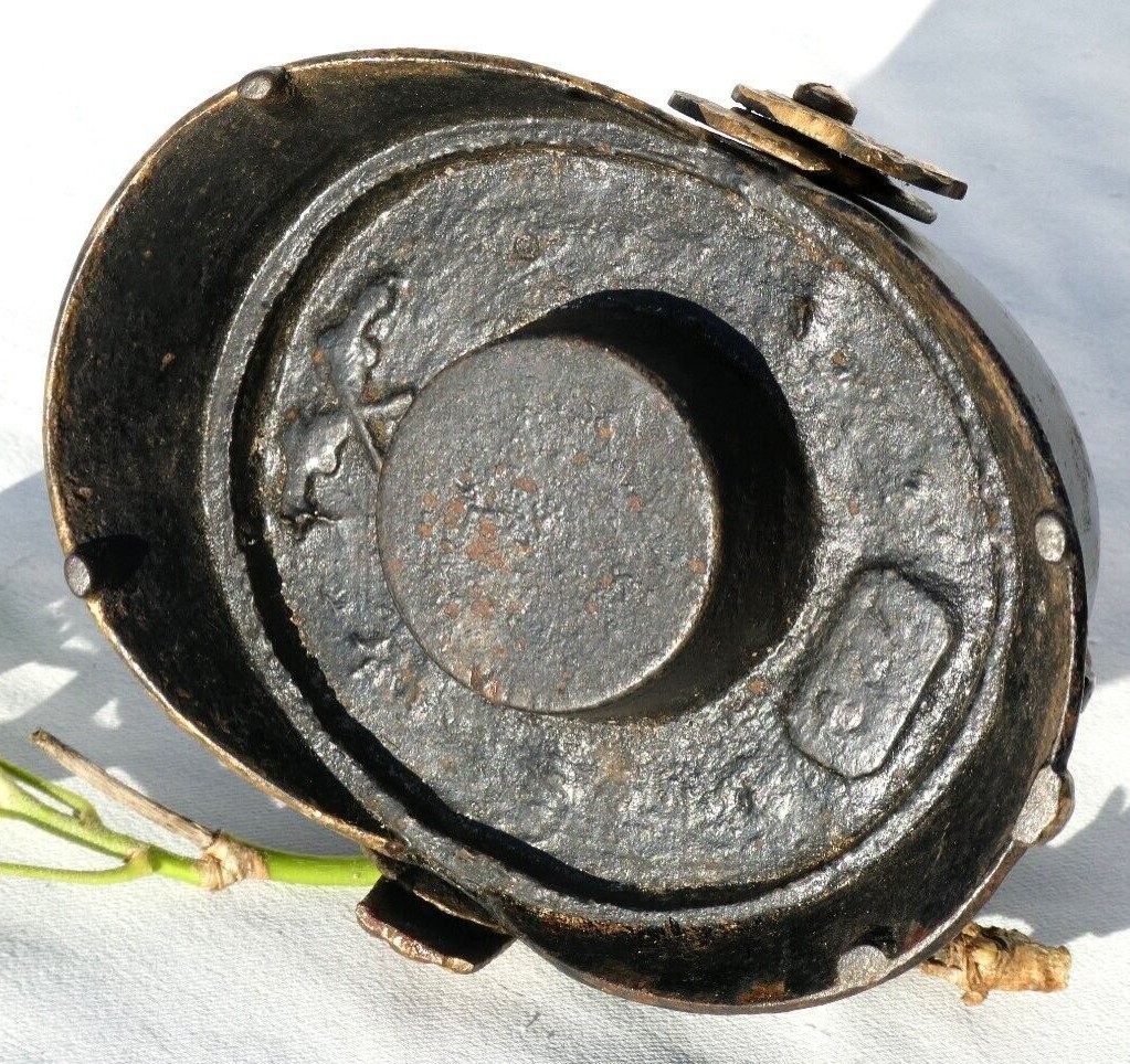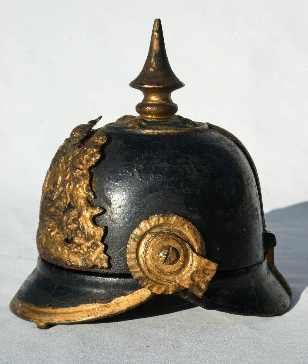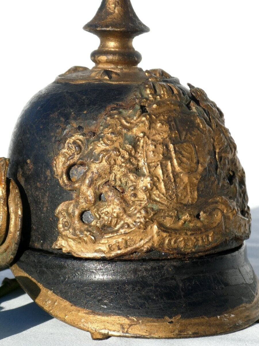 An inkwell in the form of a German pickelhaube helmet. The original design, adopted by Prussia in 1842, eventually became the standard headgear for the Imperial German Army from the mid-1800s through the outbreak of World War I. Each German state had its own distinctive helmet plate. The gilded brass plate on this inkwell is the Bavarian version. It has the Bavarian State coat of arms supported by two lions. Above it, the State motto, “In Treue Fest” (In Loyalty Steadfast) is inscribed. The helmet is hinged and opens to access a glass inkwell. The base is signed with crossed pistols.