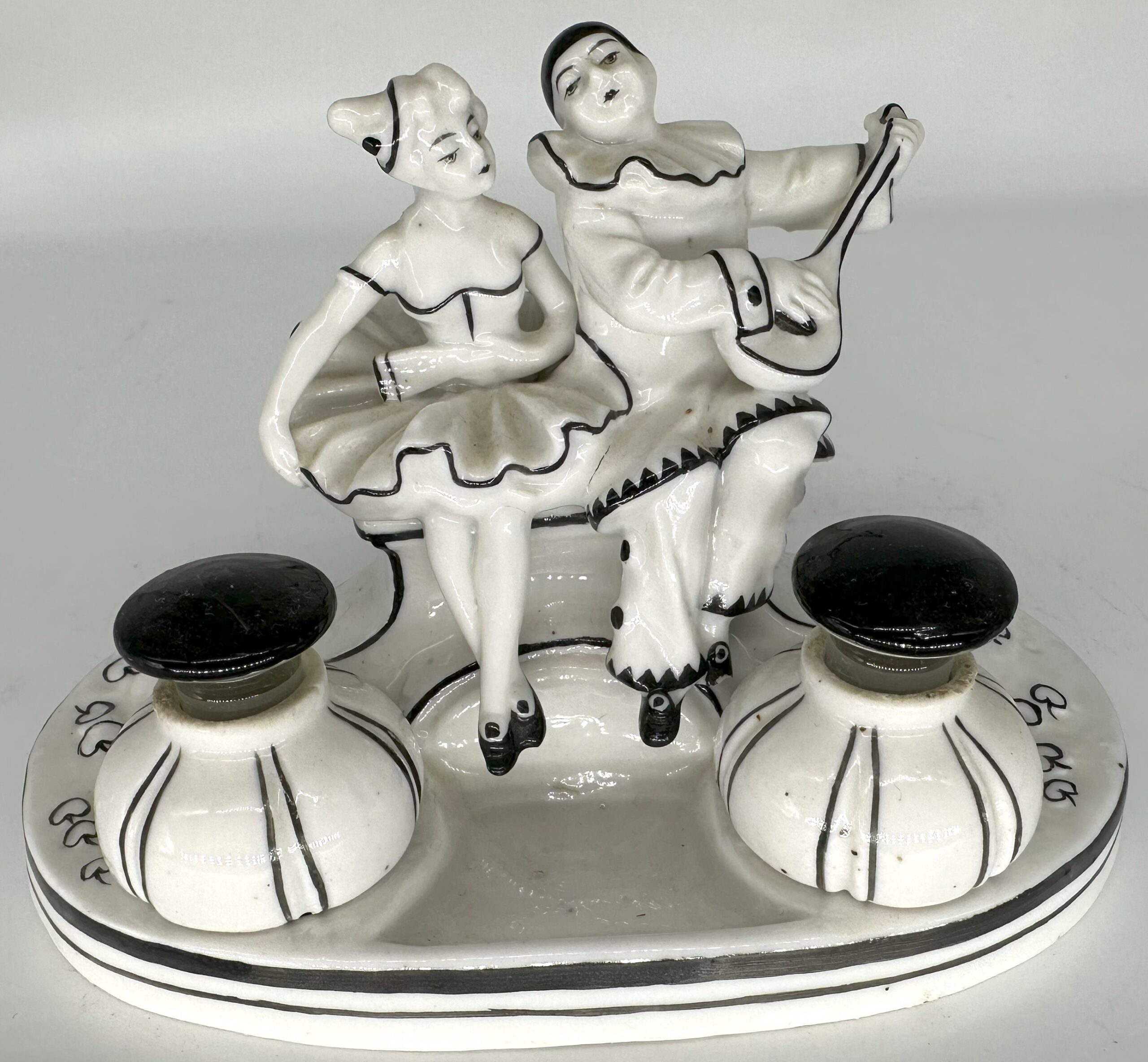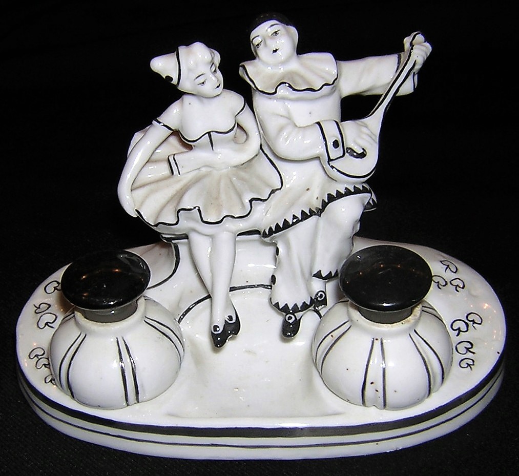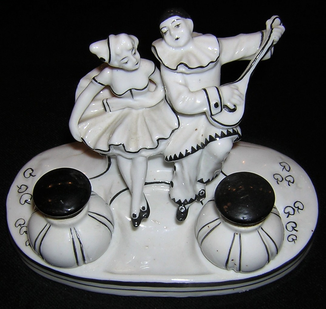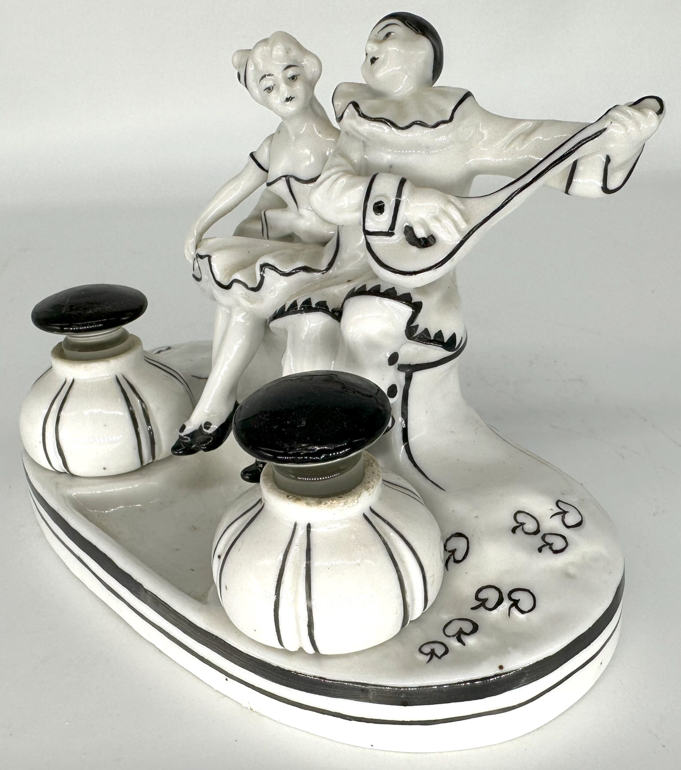 Pierrot sits with his love interest, Columbine, playing the lute. Two inkwells with glass stopper lids rest in the porcelain base. I am unable to identify the mark on the underside: the letters AB underneath a crown.