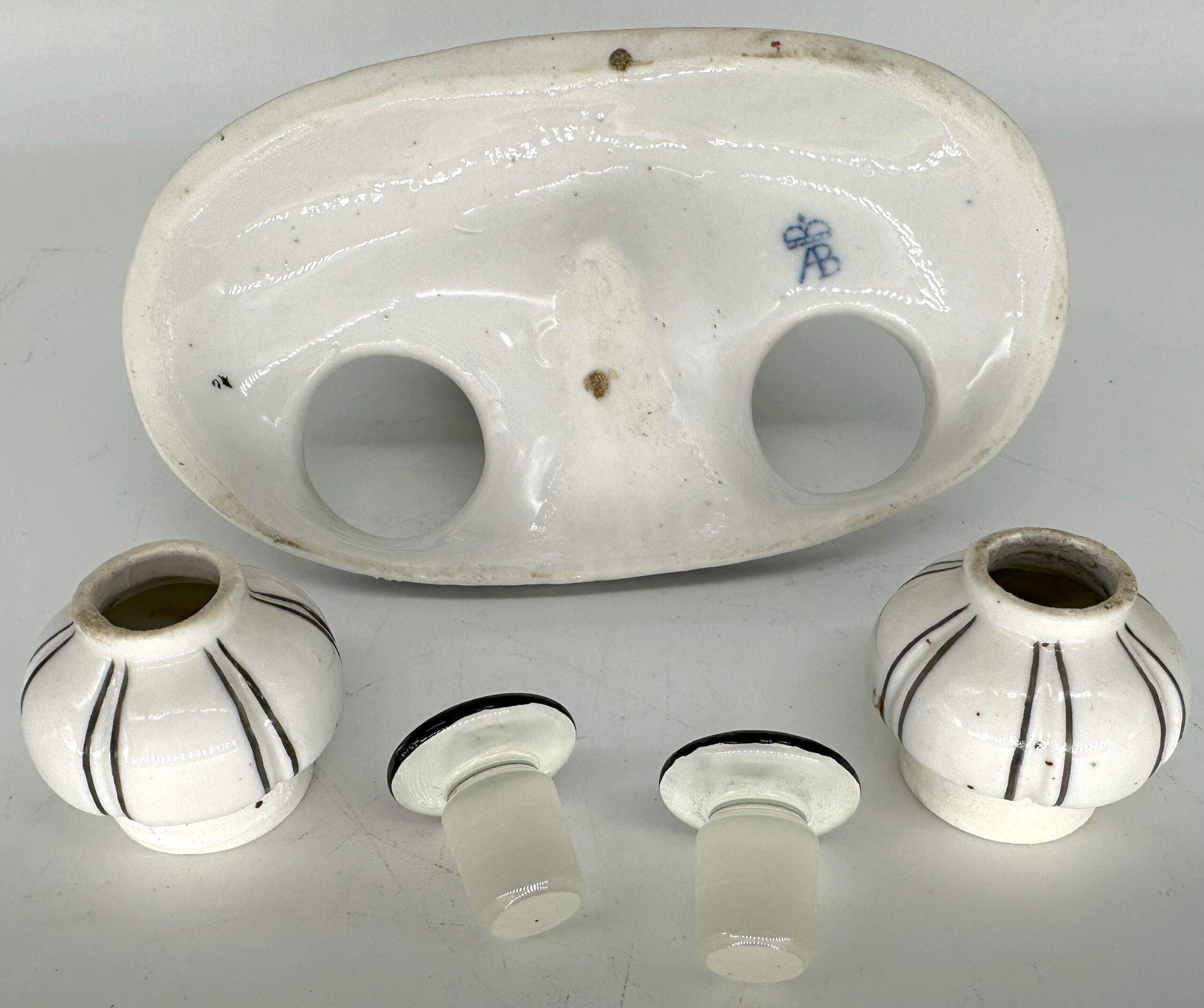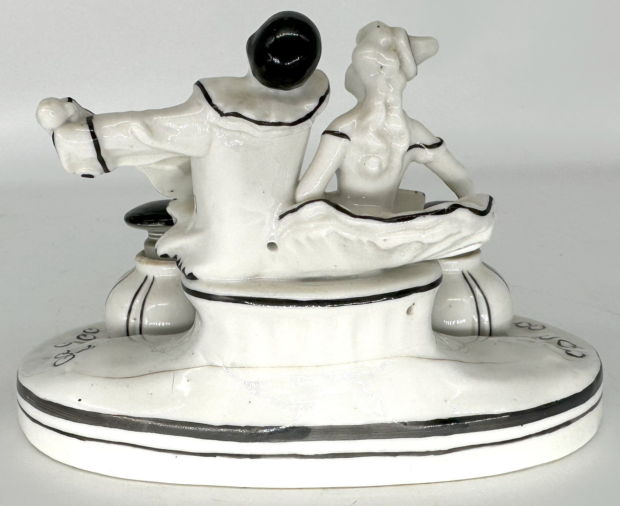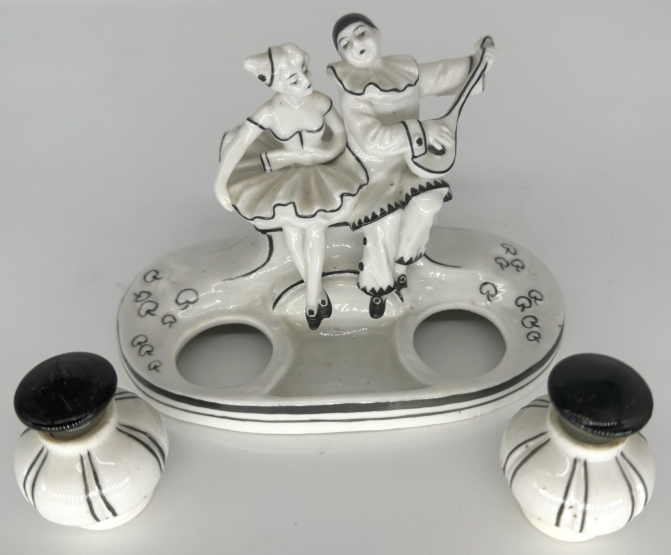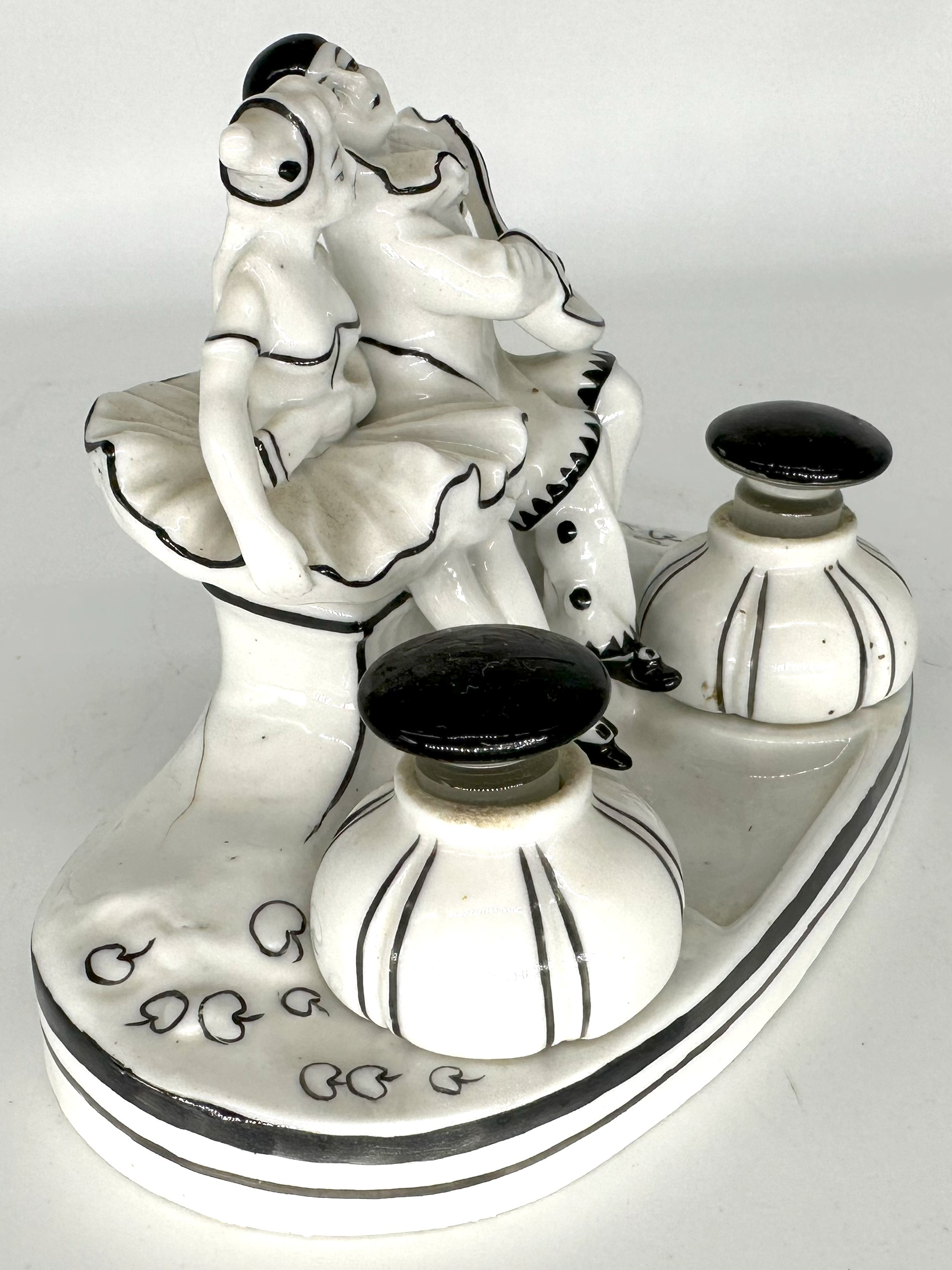 Pierrot sits with his love interest, Columbine, playing the lute. Two inkwells with glass stopper lids rest in the porcelain base. I am unable to identify the mark on the underside: the letters AB underneath a crown.