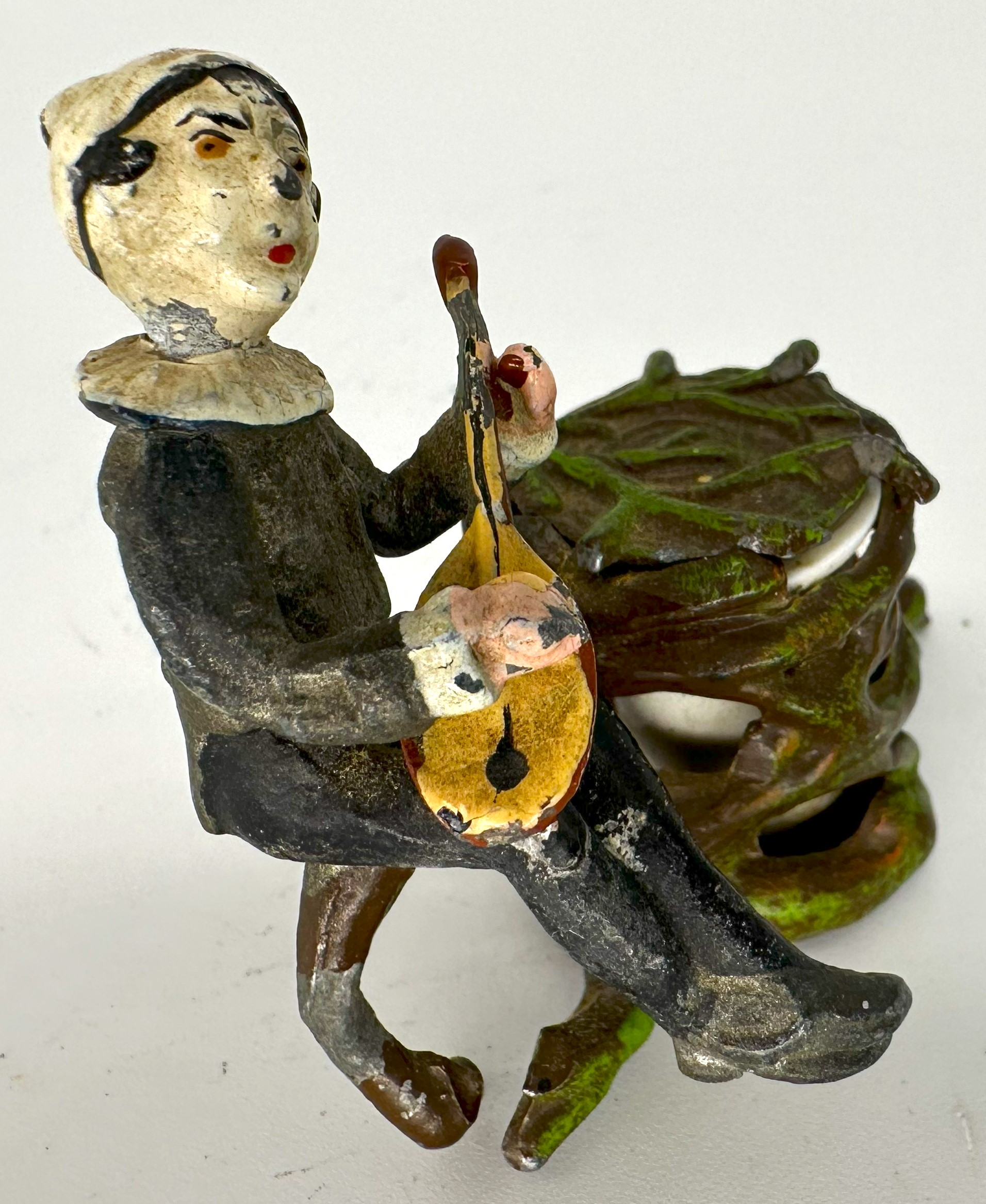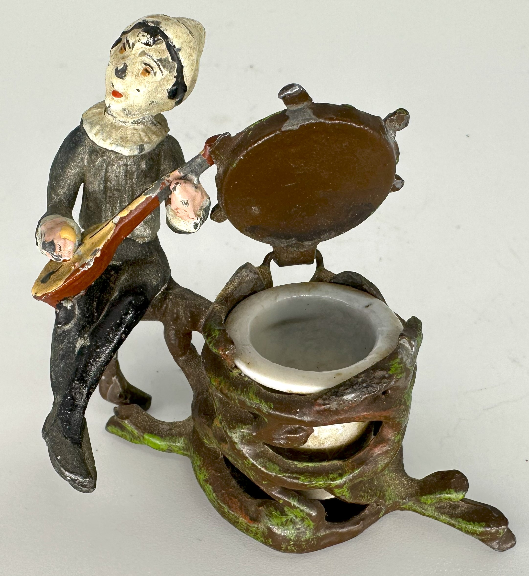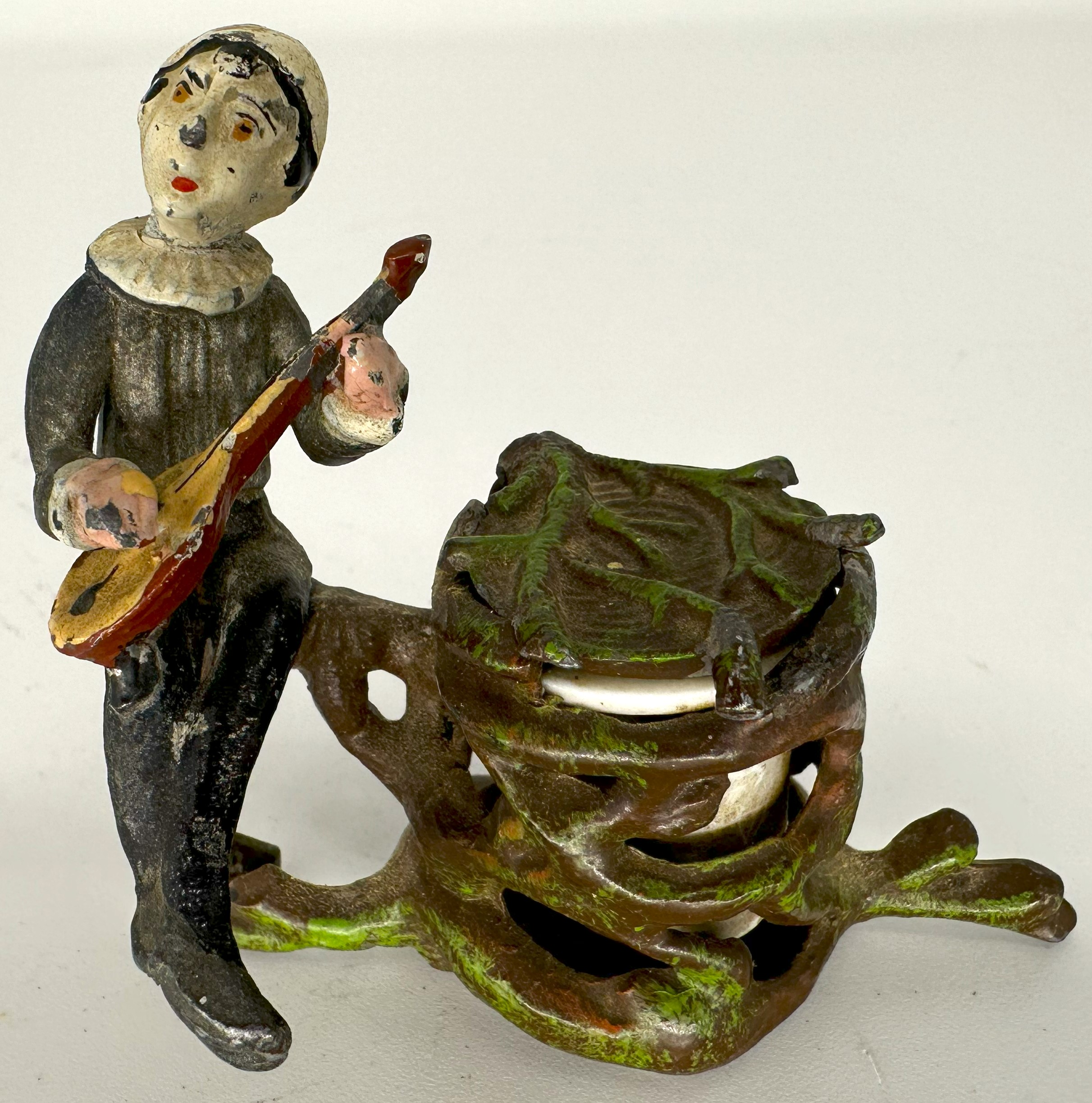 This cold-painted metal inkwell features a minstrel (Pierrot) sitting on a vine covered stump (inkwell) playing his lute.
