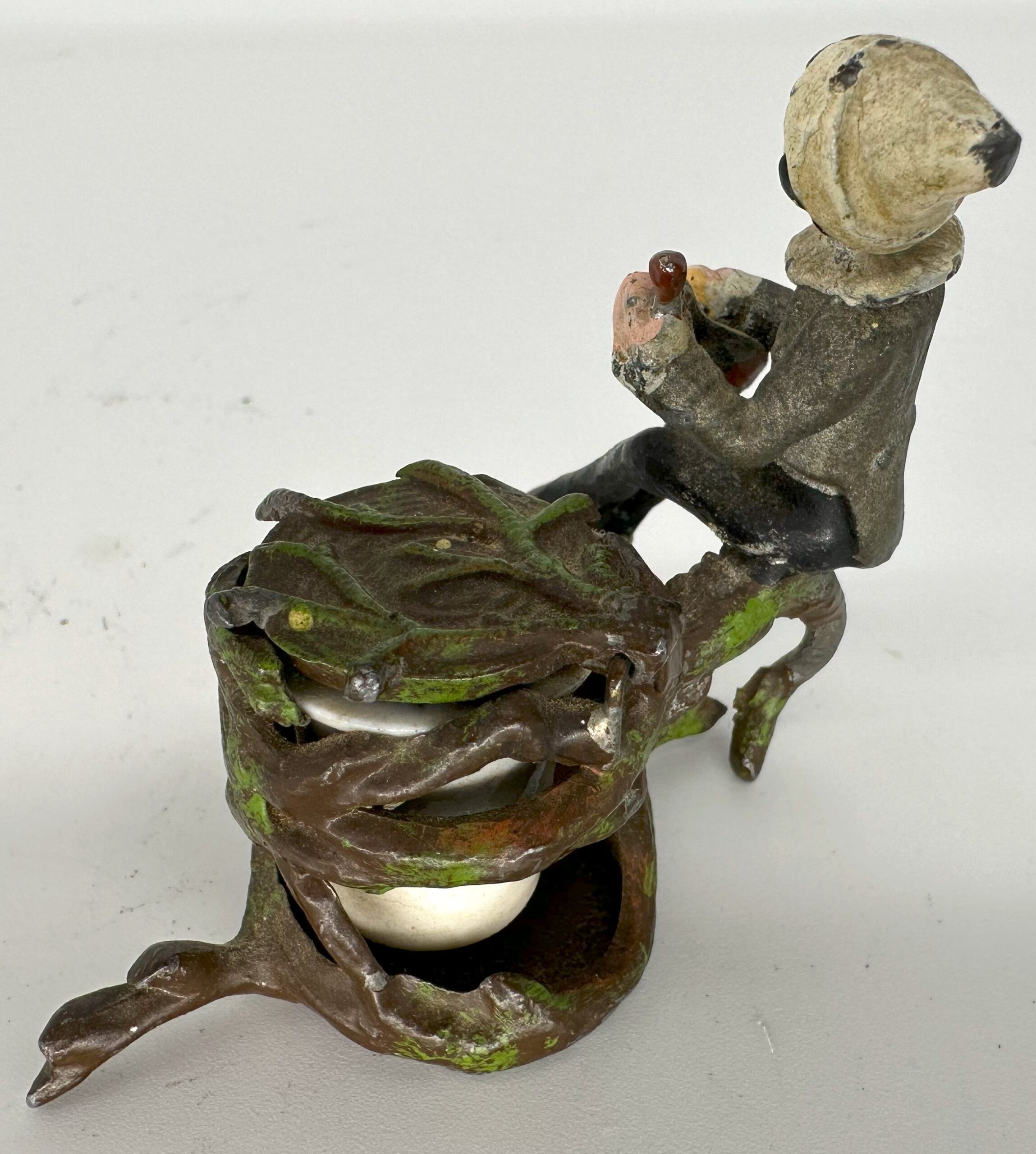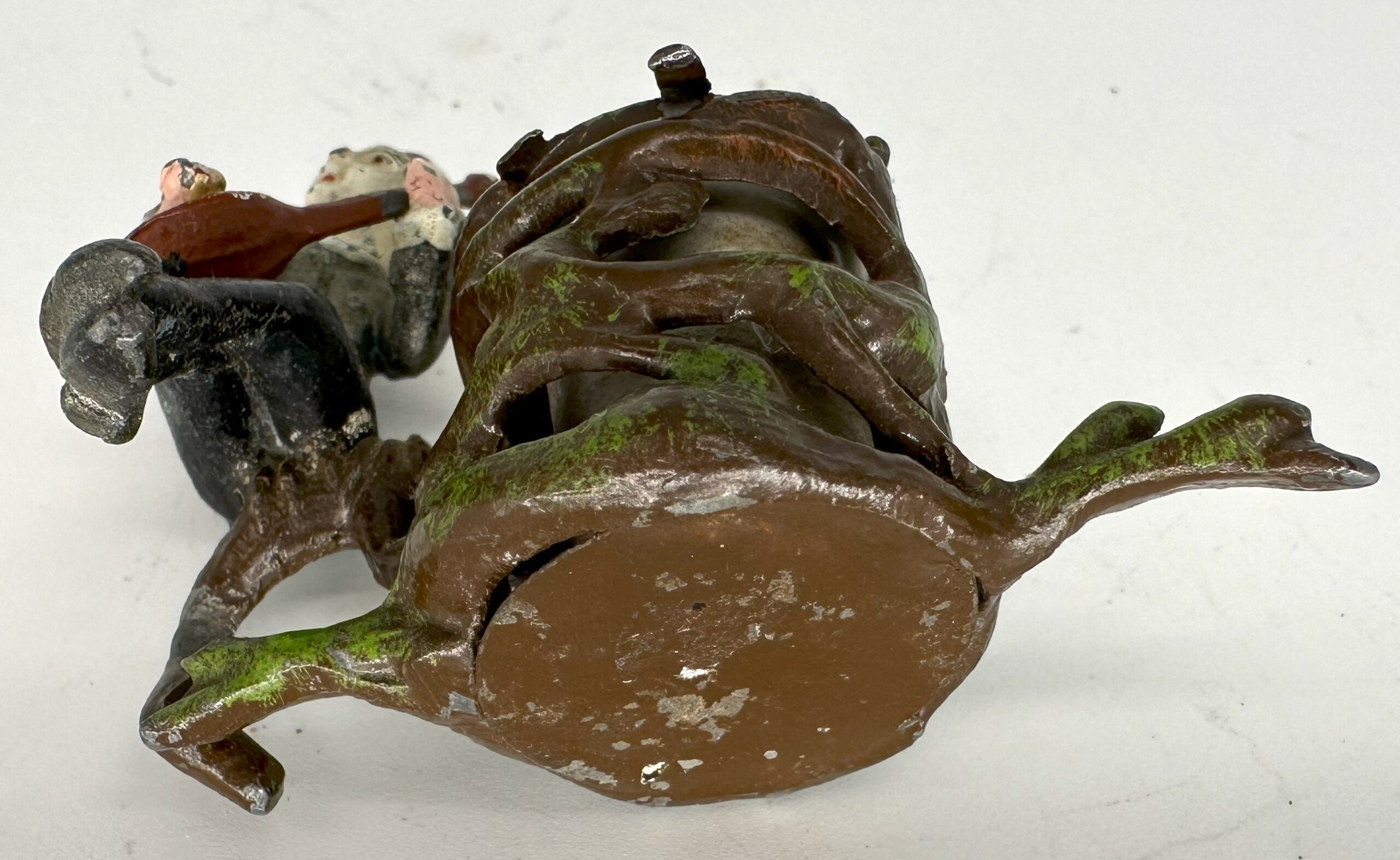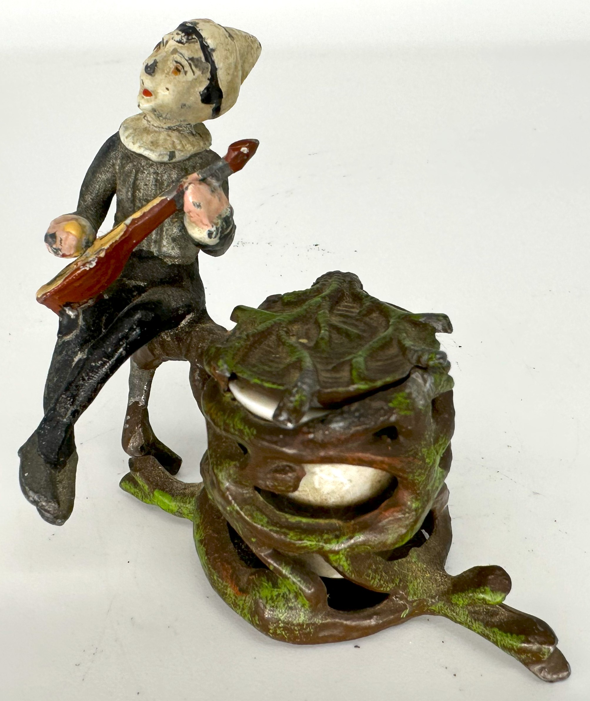 This cold-painted metal inkwell features a minstrel (Pierrot) sitting on a vine covered stump (inkwell) playing his lute.