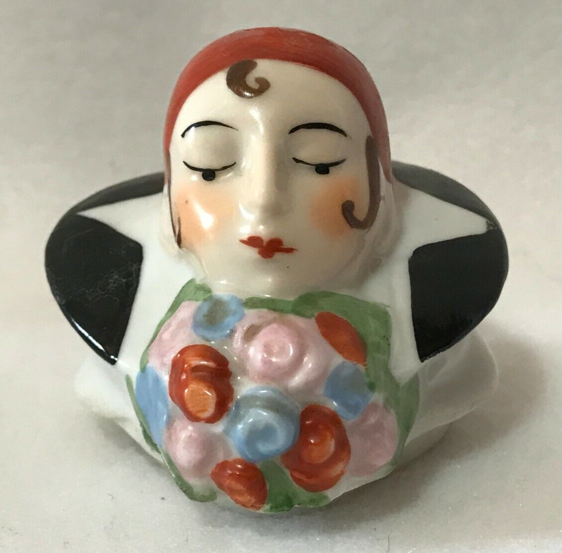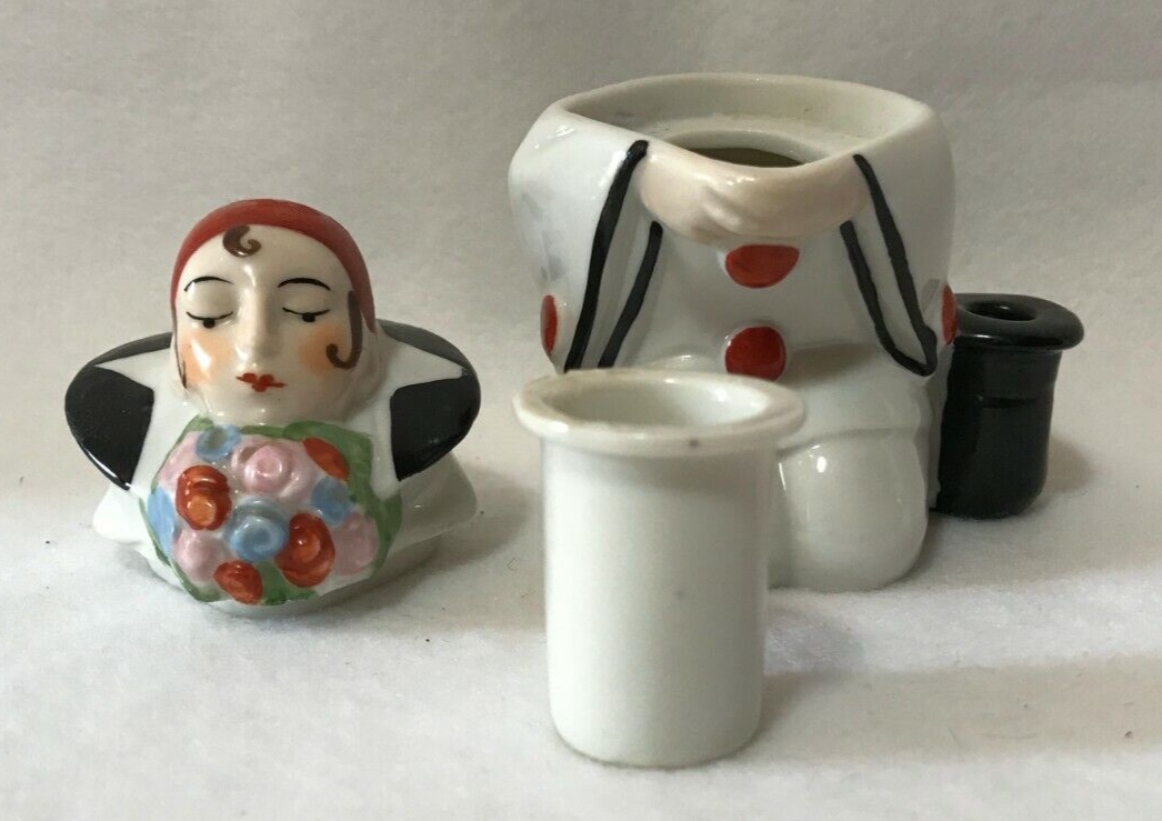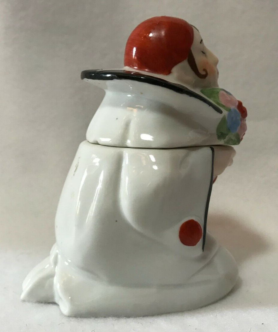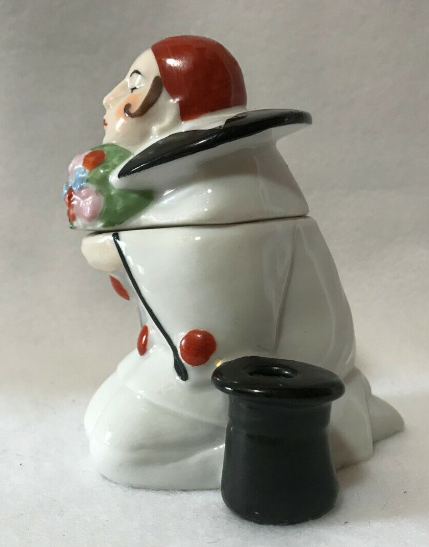 This porcelain inkwell depicts a Pierette figure (a female Pierrot?) – a classic character from 17th century Italian comedy. Pierette is kneeling and holds a bouquet of flowers. The top lifts off to access the inkwell. The black top hat is a pen holder.