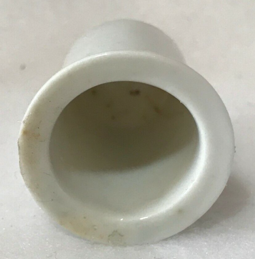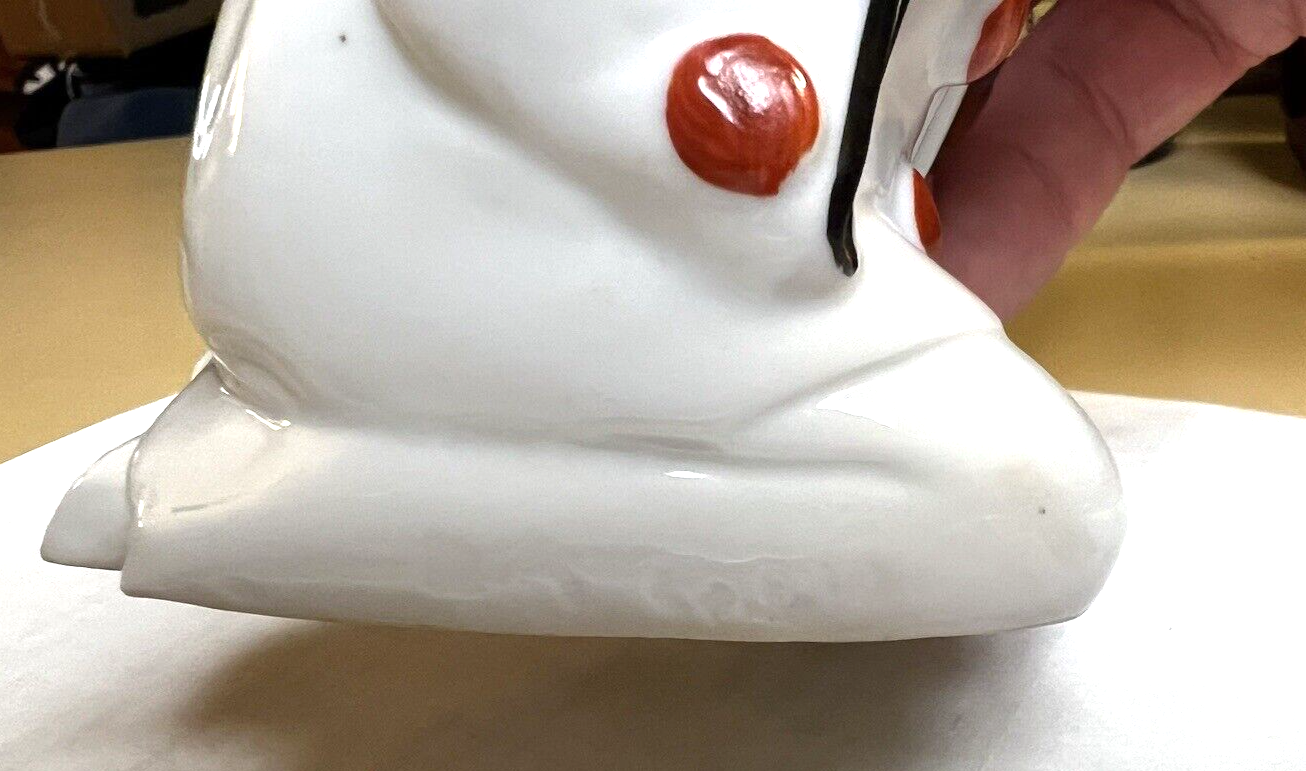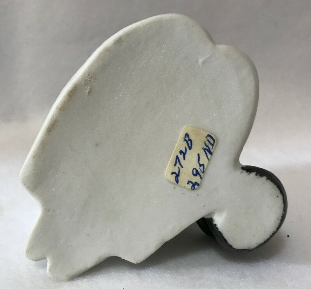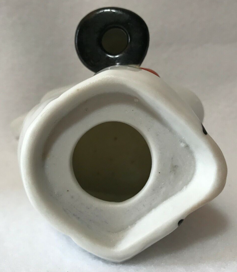 This porcelain inkwell depicts a Pierette figure (a female Pierrot?) – a classic character from 17th century Italian comedy. Pierette is kneeling and holds a bouquet of flowers. The top lifts off to access the inkwell. The black top hat is a pen holder.