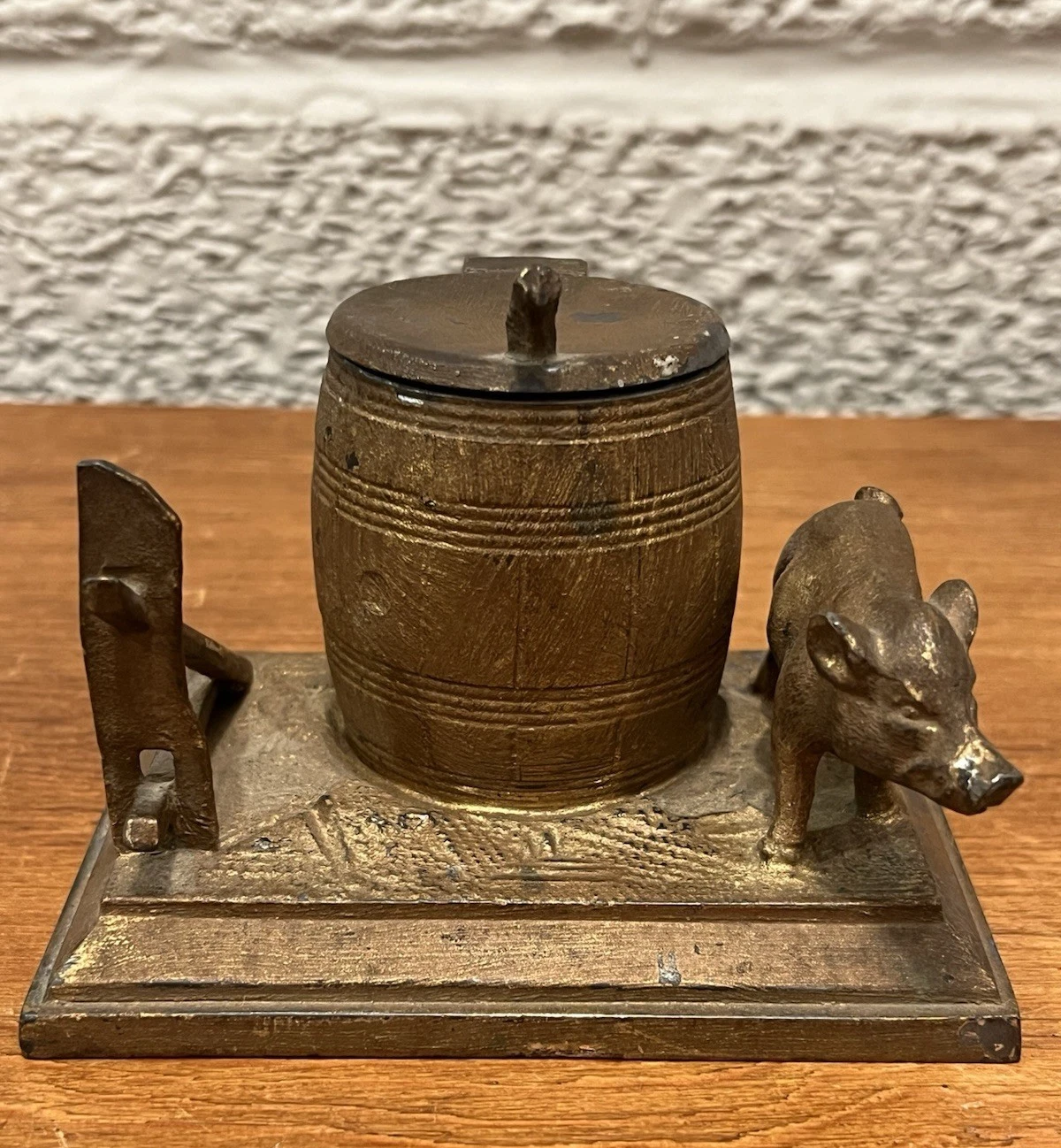 - Subject: A realistic pig stands next to a large barrel. The barrel itself serves as the inkwell; the lid is hinged to reveal the ink reservoir (the insert is missing).