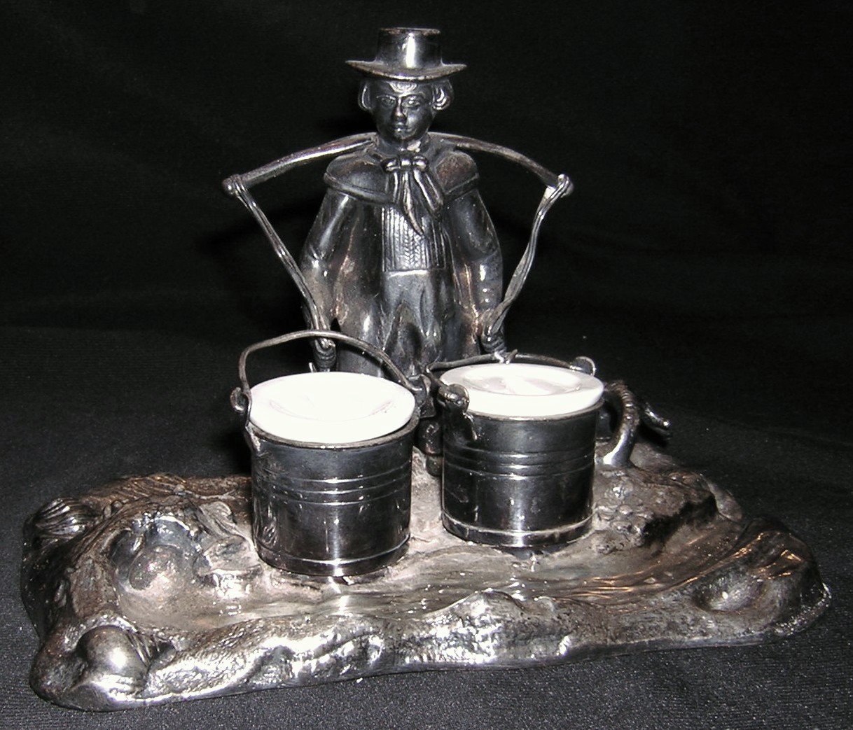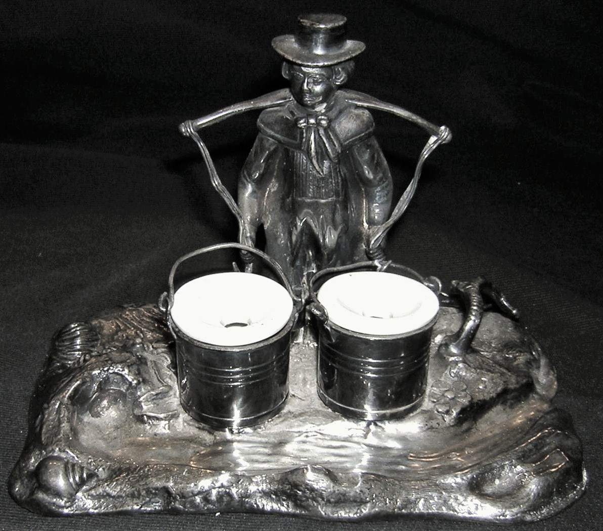 Silverplated inkstand depicts a pilgrim type man, near a stream (pen channel) hauling two buckets (inkwells) of water with a shoulder yoke.