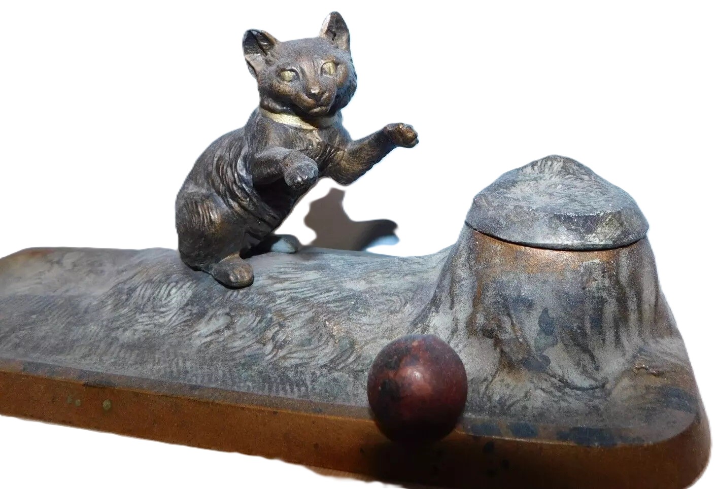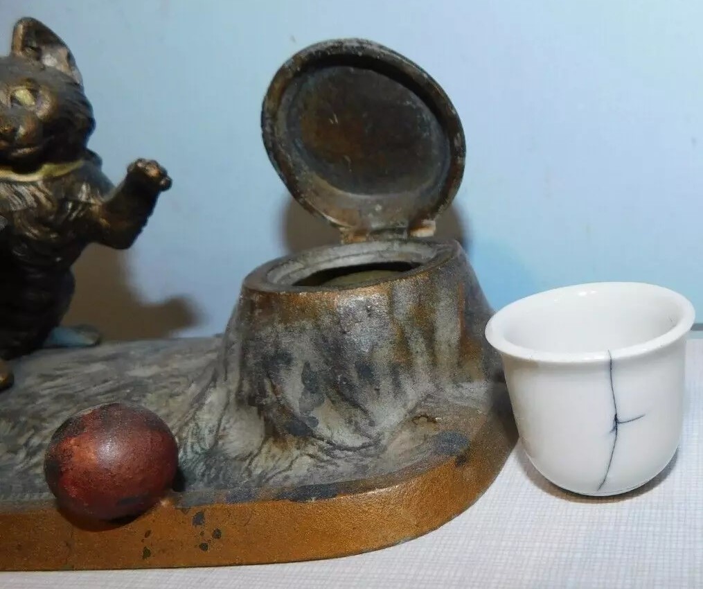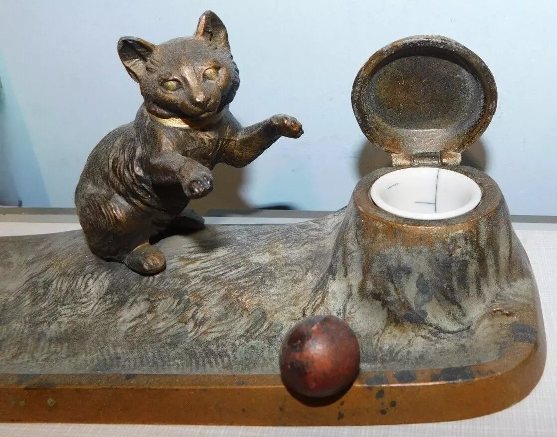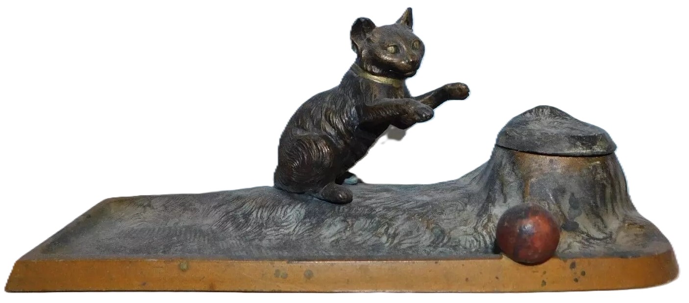 This inkstand features a playful cat interacting with a ball. The cat is positioned on its hind legs, with one paw raised as if batting at the ball. The cat and ball are situated next to a tree stump, which serves as the inkwell. The top of the stump is hinged, allowing it to open and reveal the inkwell inside. The inkstand is made of spelter metal, which is a zinc alloy, and it has a bronze finish. The underside of the inkstand is marked “AUSTRIA”.