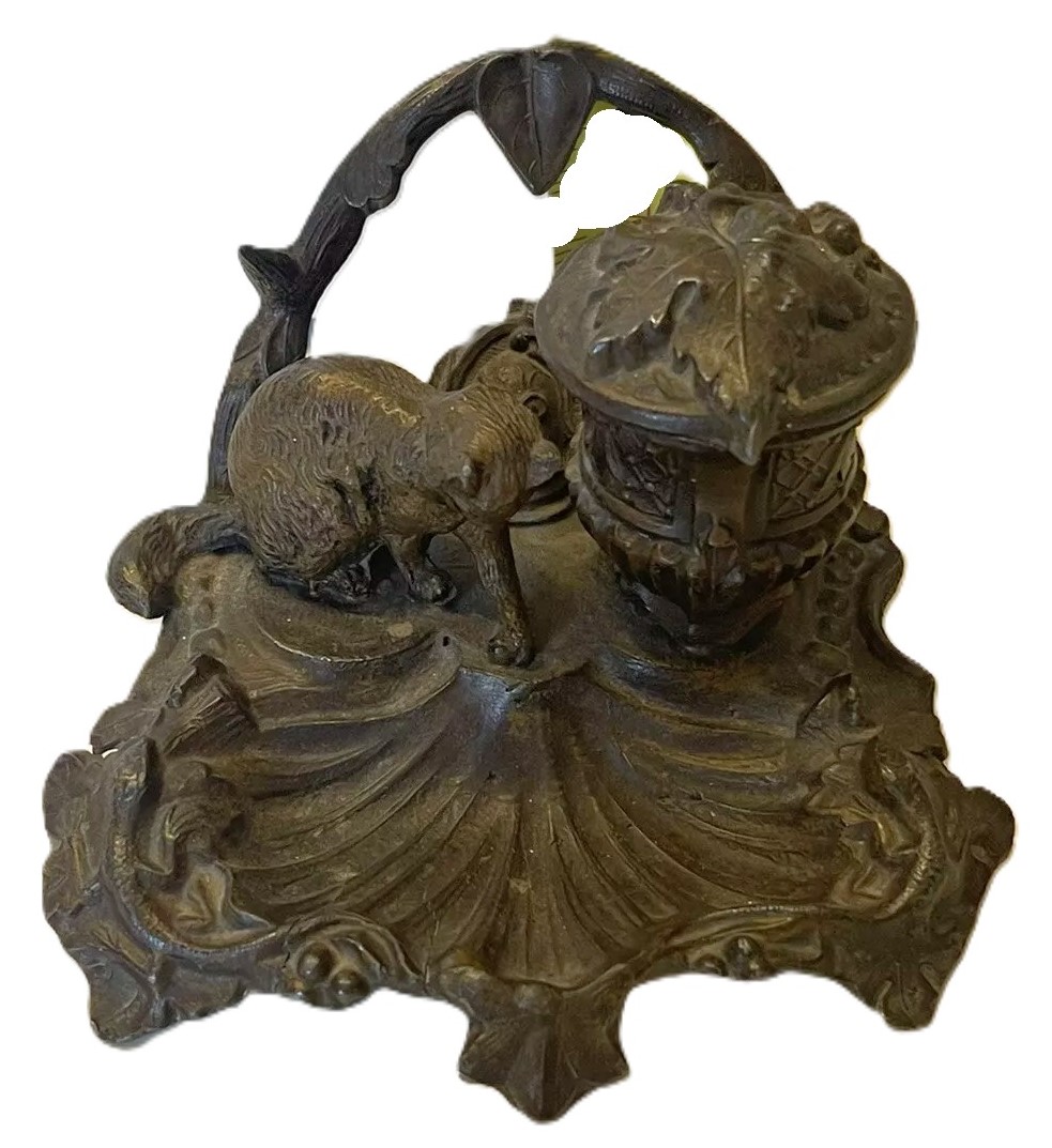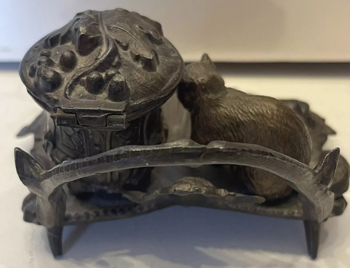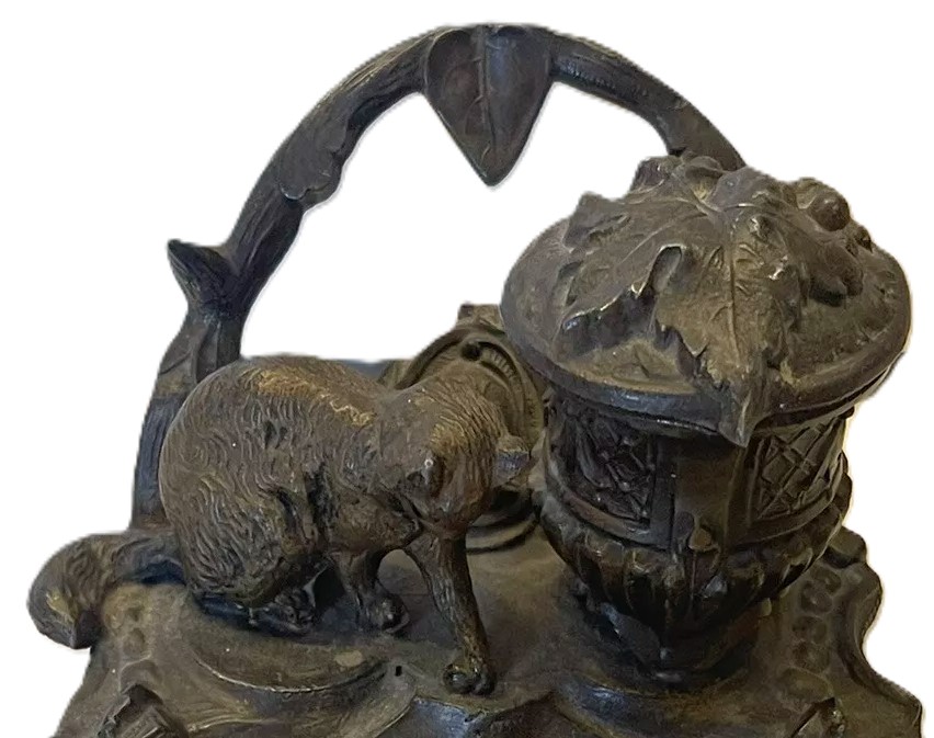 This inkstand features a sculpted cat figure in a playful or crouching position. The base of the inkstand serves as a pen tray. The hinged lid covering the inkwell is decorated with a leaf and berries. The underside is marked with “A.B.” and “221”.