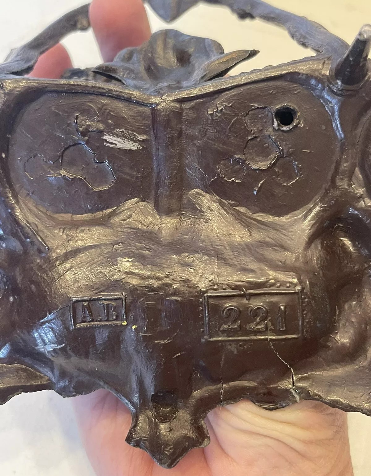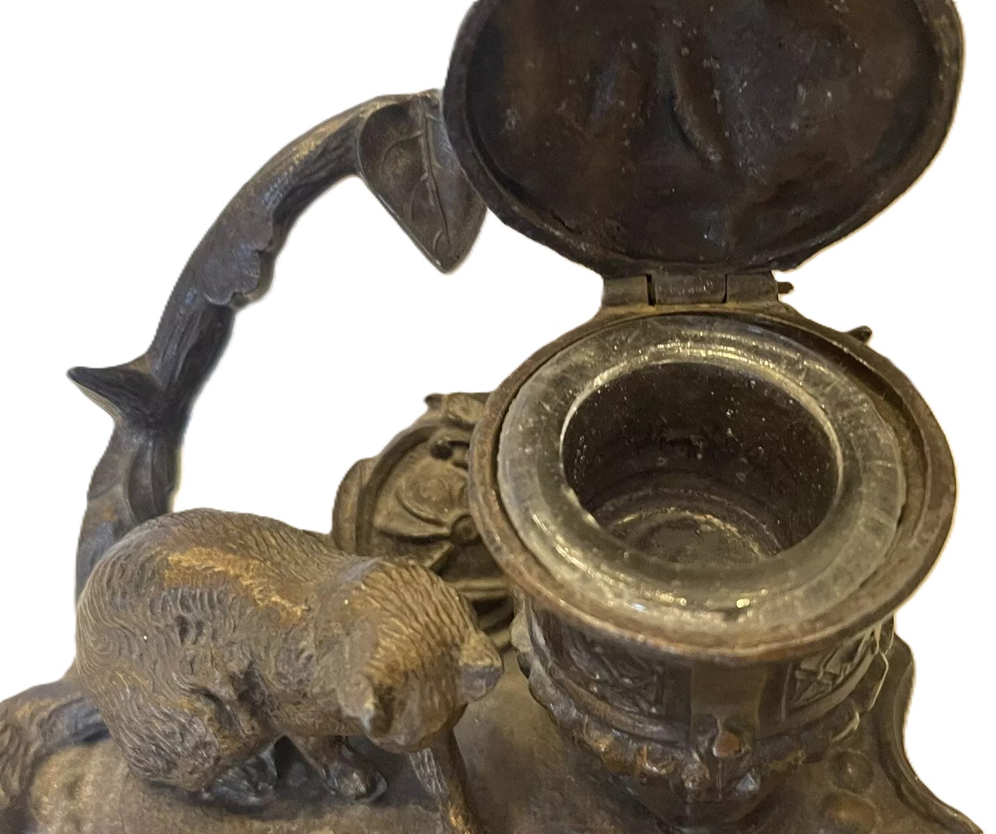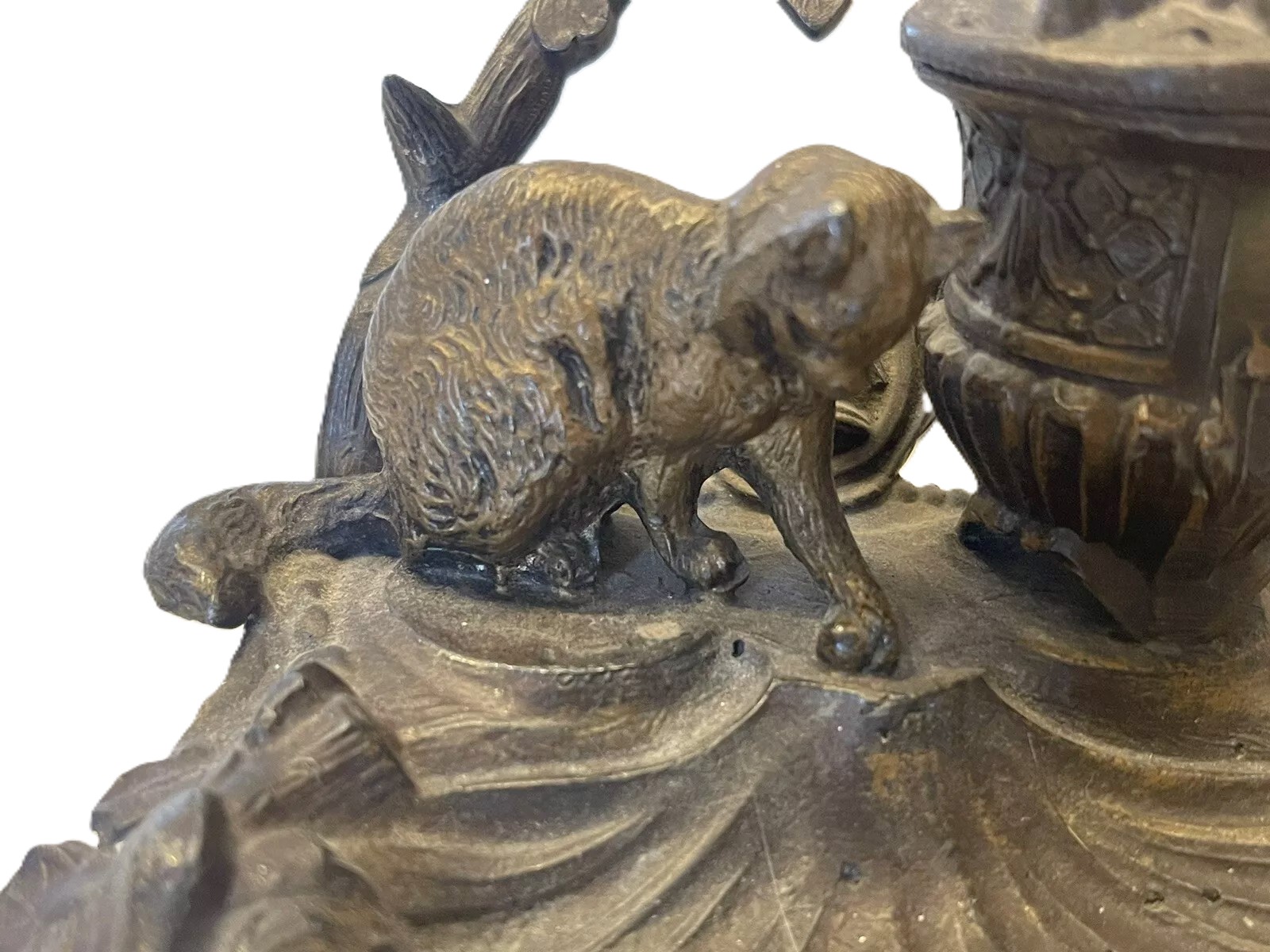 This inkstand features a sculpted cat figure in a playful or crouching position. The base of the inkstand serves as a pen tray. The hinged lid covering the inkwell is decorated with a leaf and berries. The underside is marked with “A.B.” and “221”.