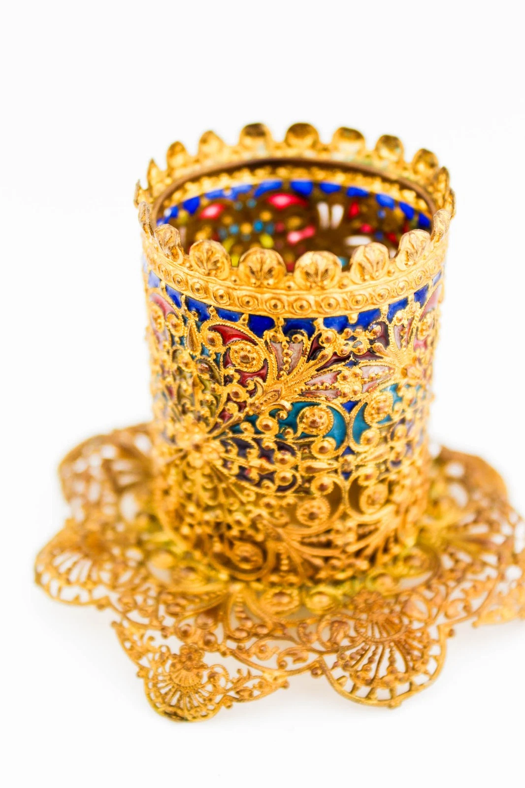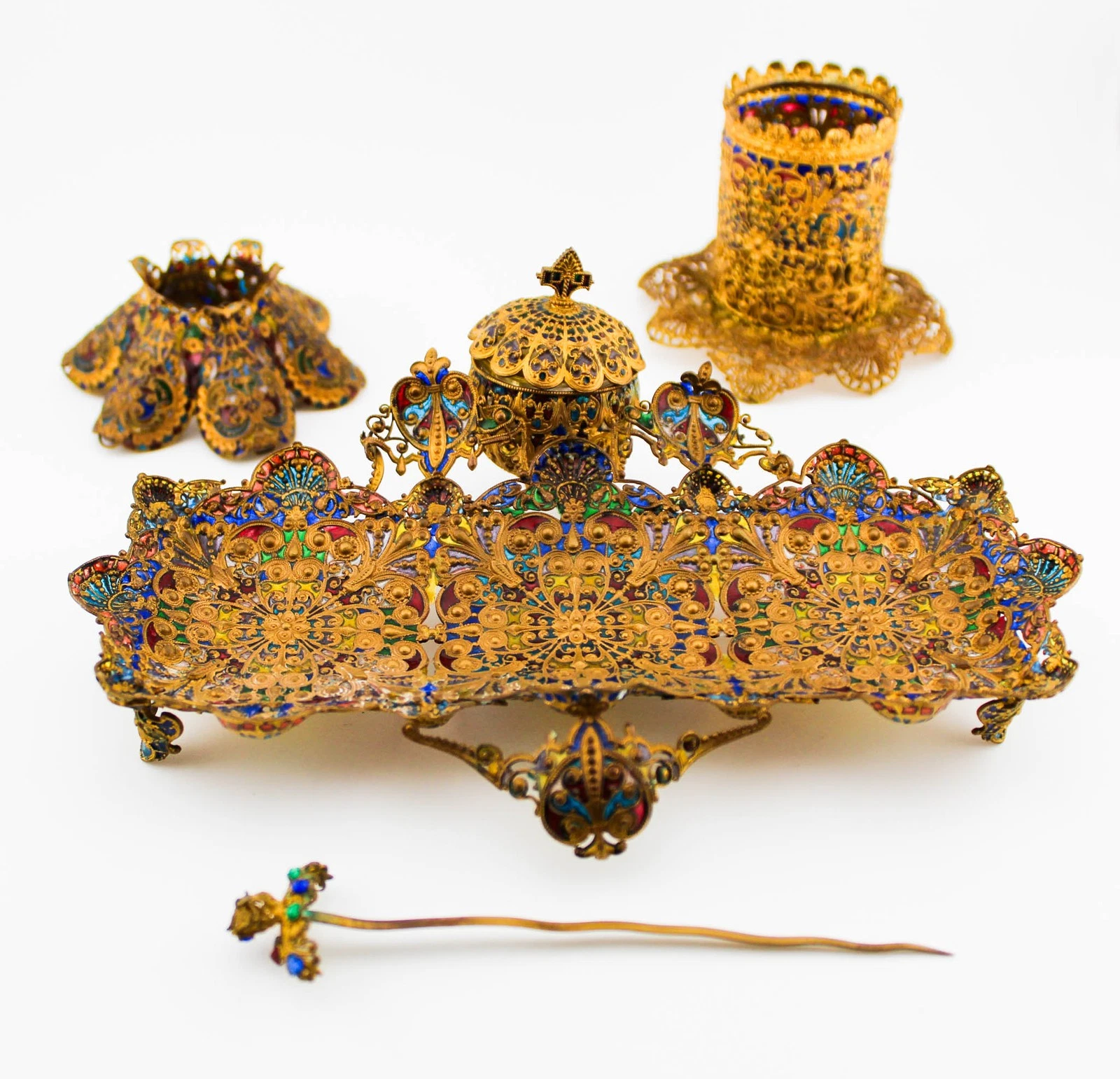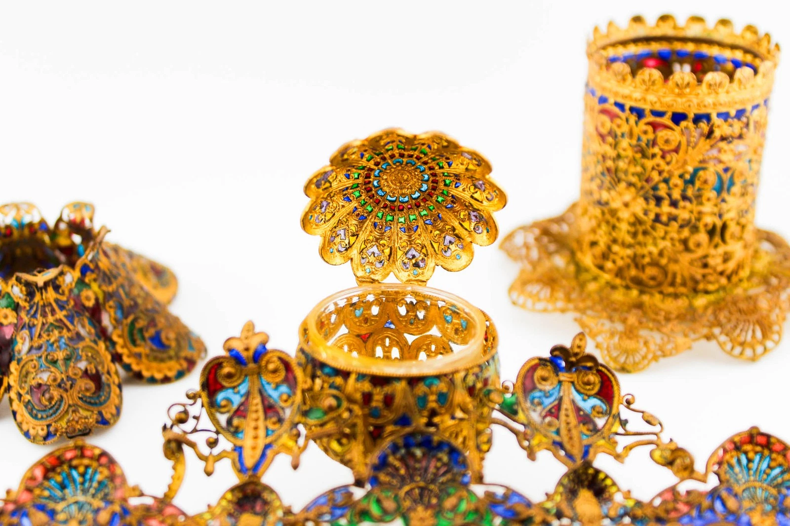 • The Framework: The pieces are made of gilt silver (silver washed in gold) or high-quality brass/bronze filigree.