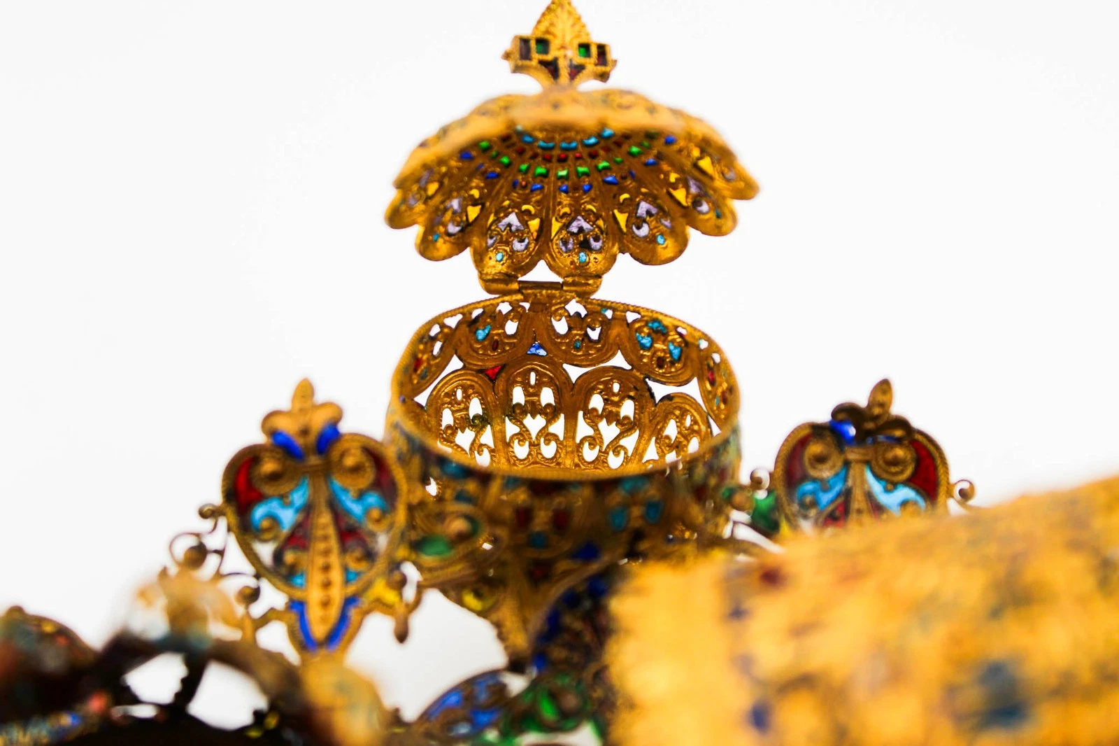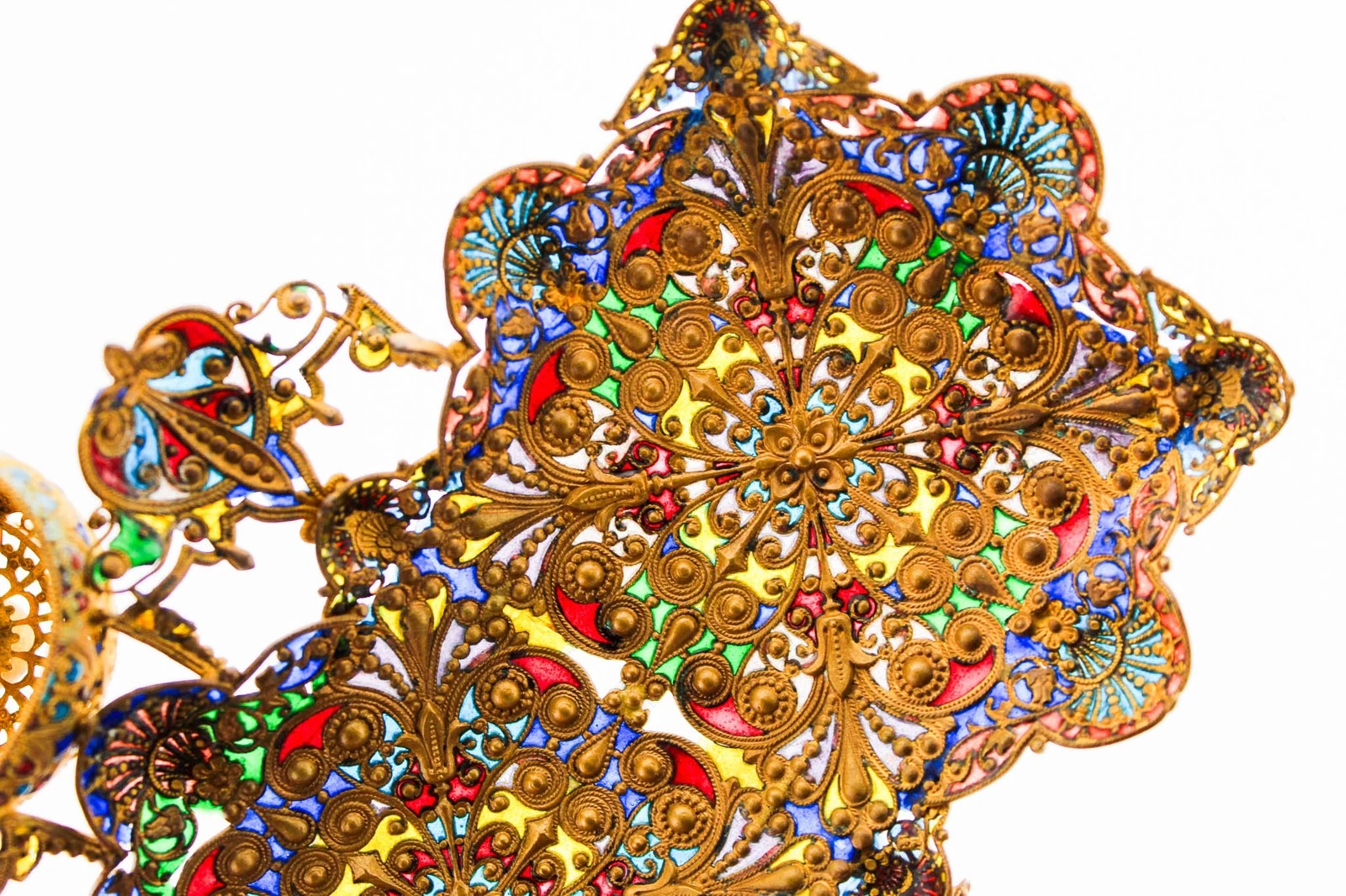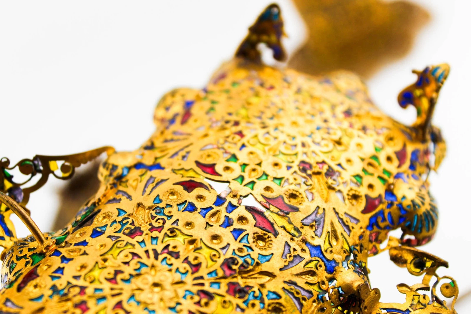 • The Effect: When held to the light, it looks like a miniature stained-glass window. The “gemstones” you see are actually translucent glass pastes fired into the metal framework.