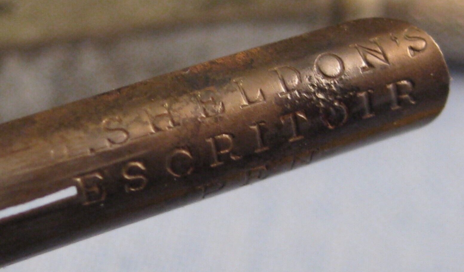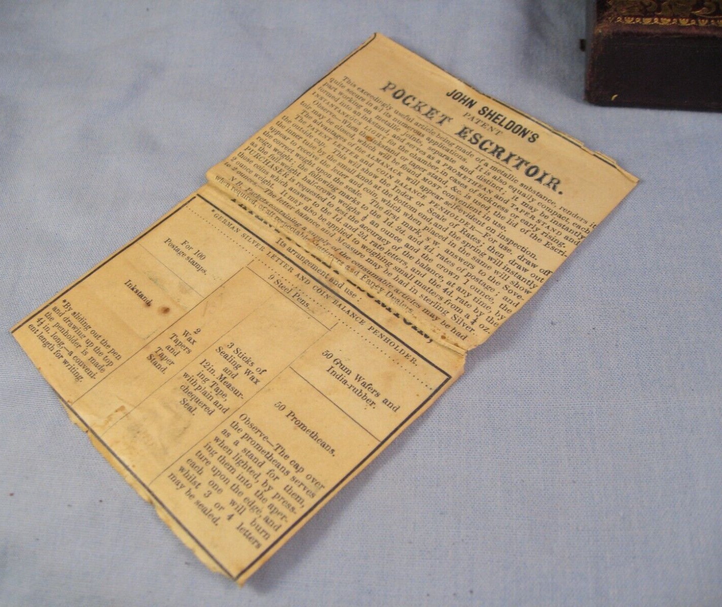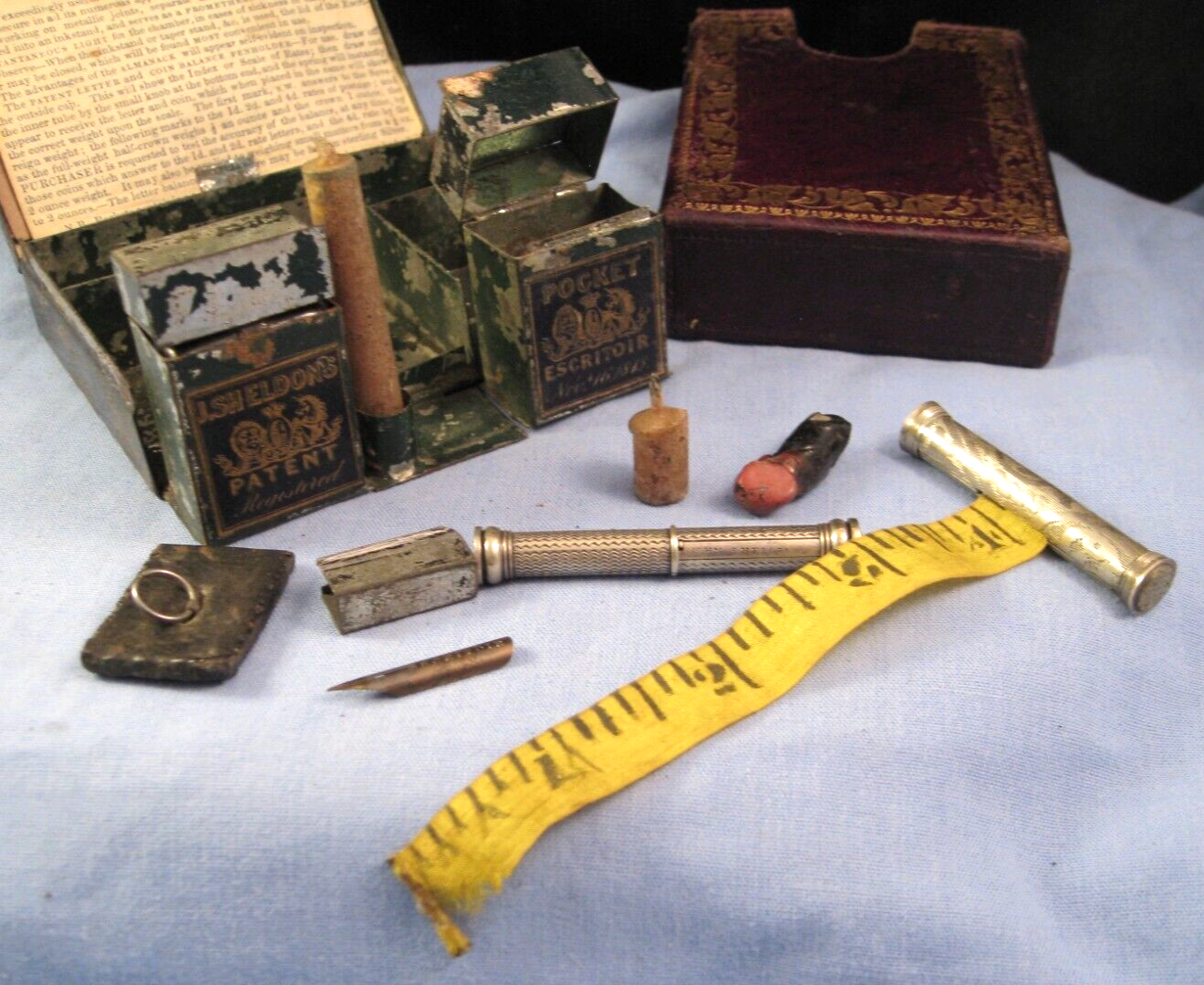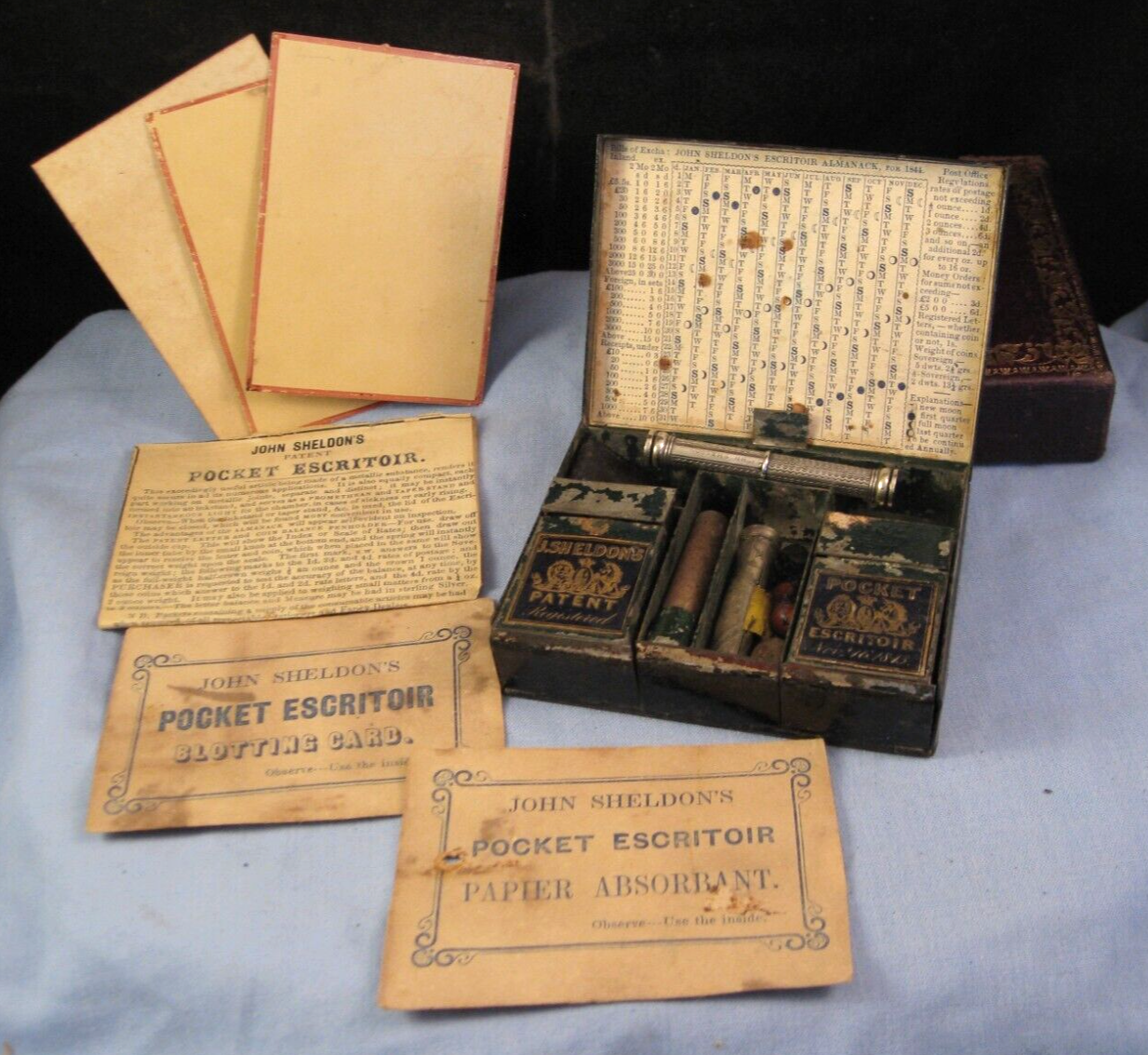 Sheldon is most known for portable compendiums with multiple tools. This “bijou version” has the original gilt leather sleeve encasing a box with a black japanned finish and gilt label on the lid advertising “John Sheldon Patent Escritoir” along with the Royal Patent crest. Inside are the original labels for ‘John Sheldon’s Patent Pocket Escritoir, registered Nov 16, 1843’. It has the original double ended seal and tape measure, the original letter & sovereign coin balance, an original pen “John Sheldon” pen nib, and the original paperwork. When the lid of the box is lifted, the two boxes can be brought forward. The left one is an inkwell with a glass bottle inside and a stopper under the lid. The other is for string, wax, or vestas. It has a candle socket and candle which folds down for use.