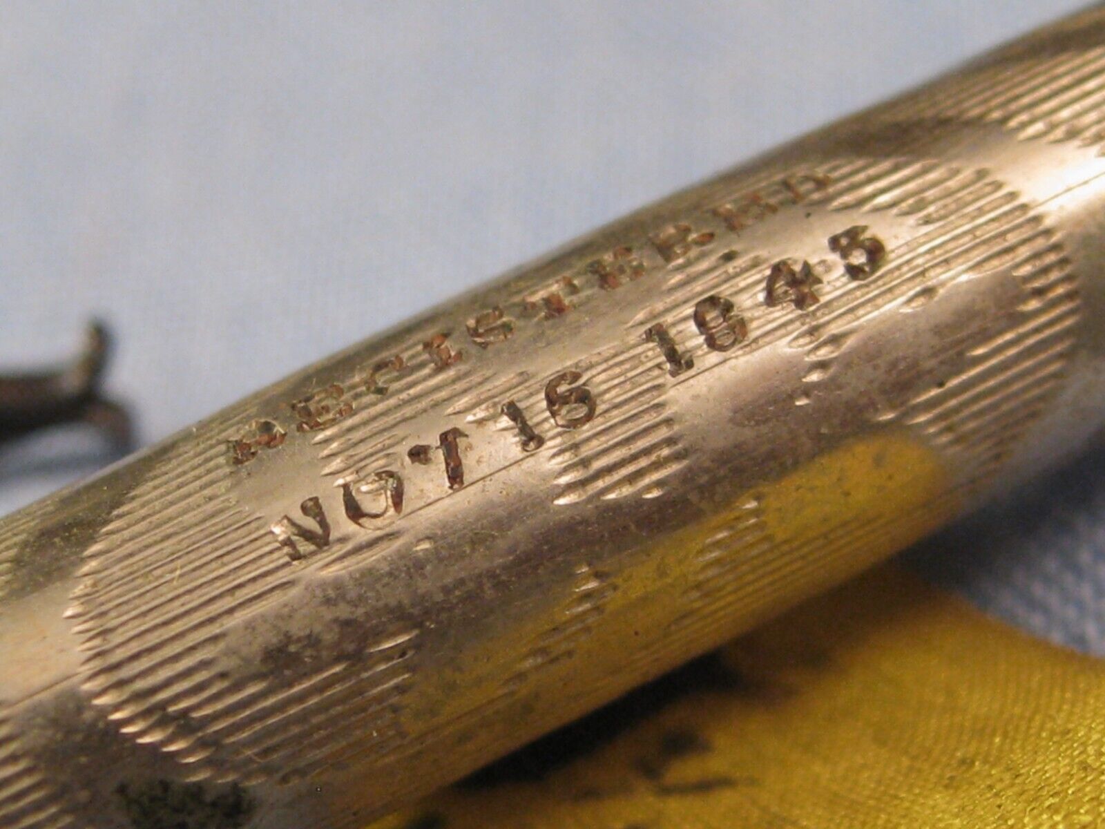 Behind the front sections are smaller sections for storing stamps, and includes a weight to keep the stamps down, and storage space for wafers and quills etc. Sitting above the back section is the Sheldon letter and coin balance. When you pull the two sections apart it reveals postal scales inside. The scales have a clip that is housed inside the scales and flips out when the inner scale is pulled down. When one clips a letter, it pulls down and gives you a reading. Instead of weight in ounces against Pence(d), this measures Grams against Grains. This version of the scale balance was made for the French and Belgium market. Sheldon also made for the Indian, German and American markets. Included is a pocket tape measure dated November 16, 1843. Tucked behind the clip under the lid are the instructions including an Almanack for 1844 with Bills of Exchange, rates of postage, coin weights and moon phases, and blotting cards.