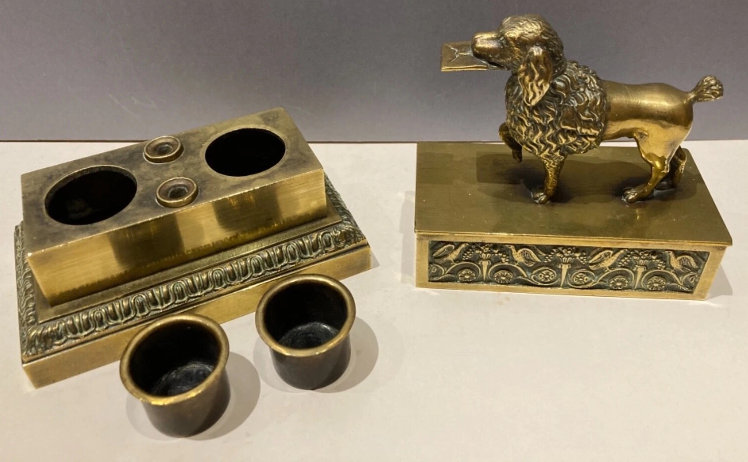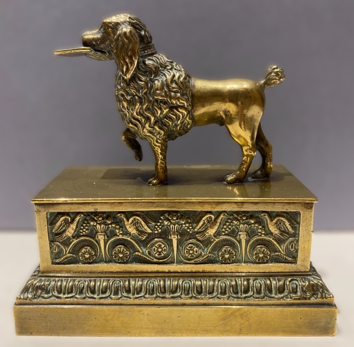 • Poodle Figure: The inkstand is surmounted by a finely cast figure of a standing poodle. The dog is sculpted with a stylized haircut typical of the era, and it is holding a letter in its mouth.