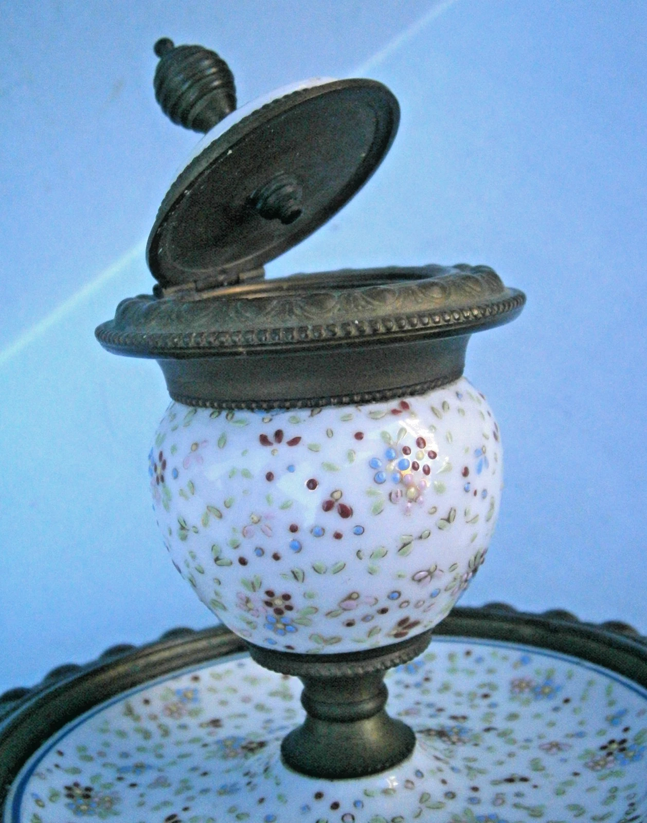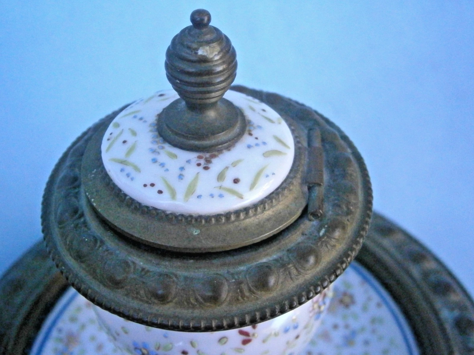 - The Finial: The lid is crowned with a tiered, ribbed bronze finial.