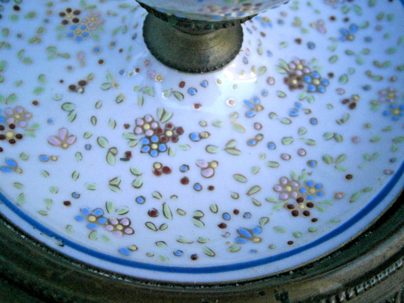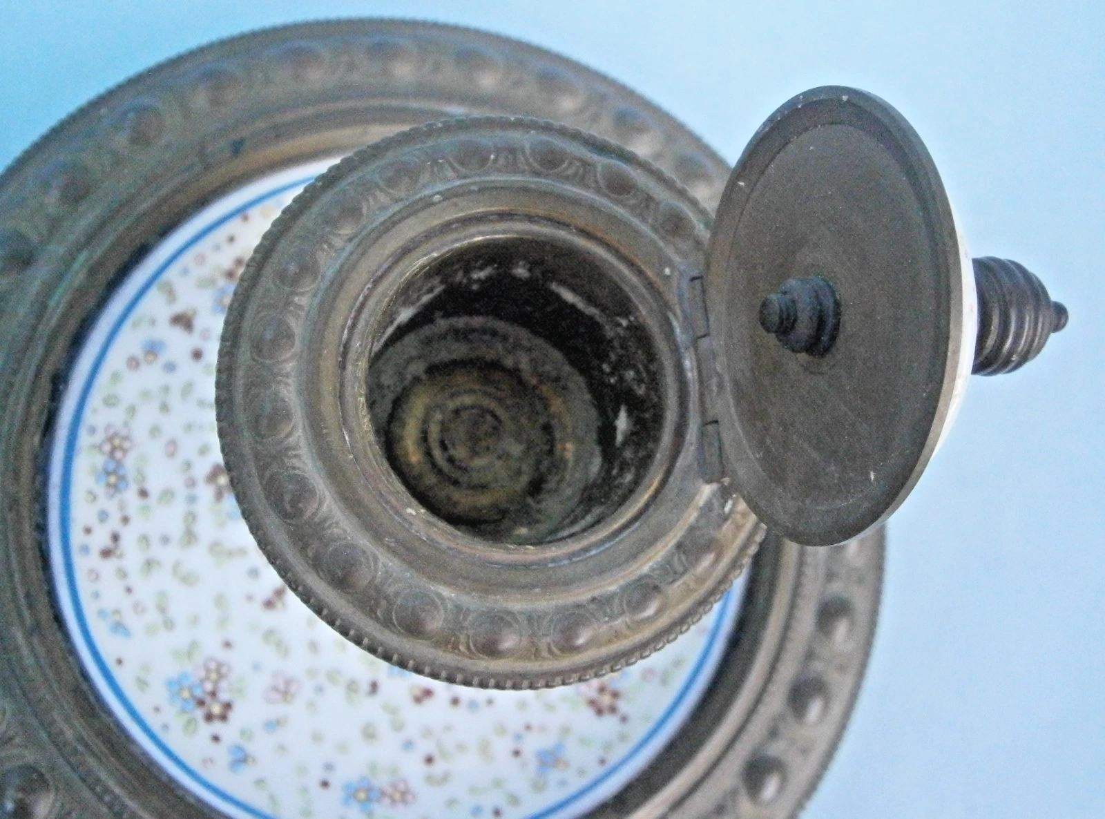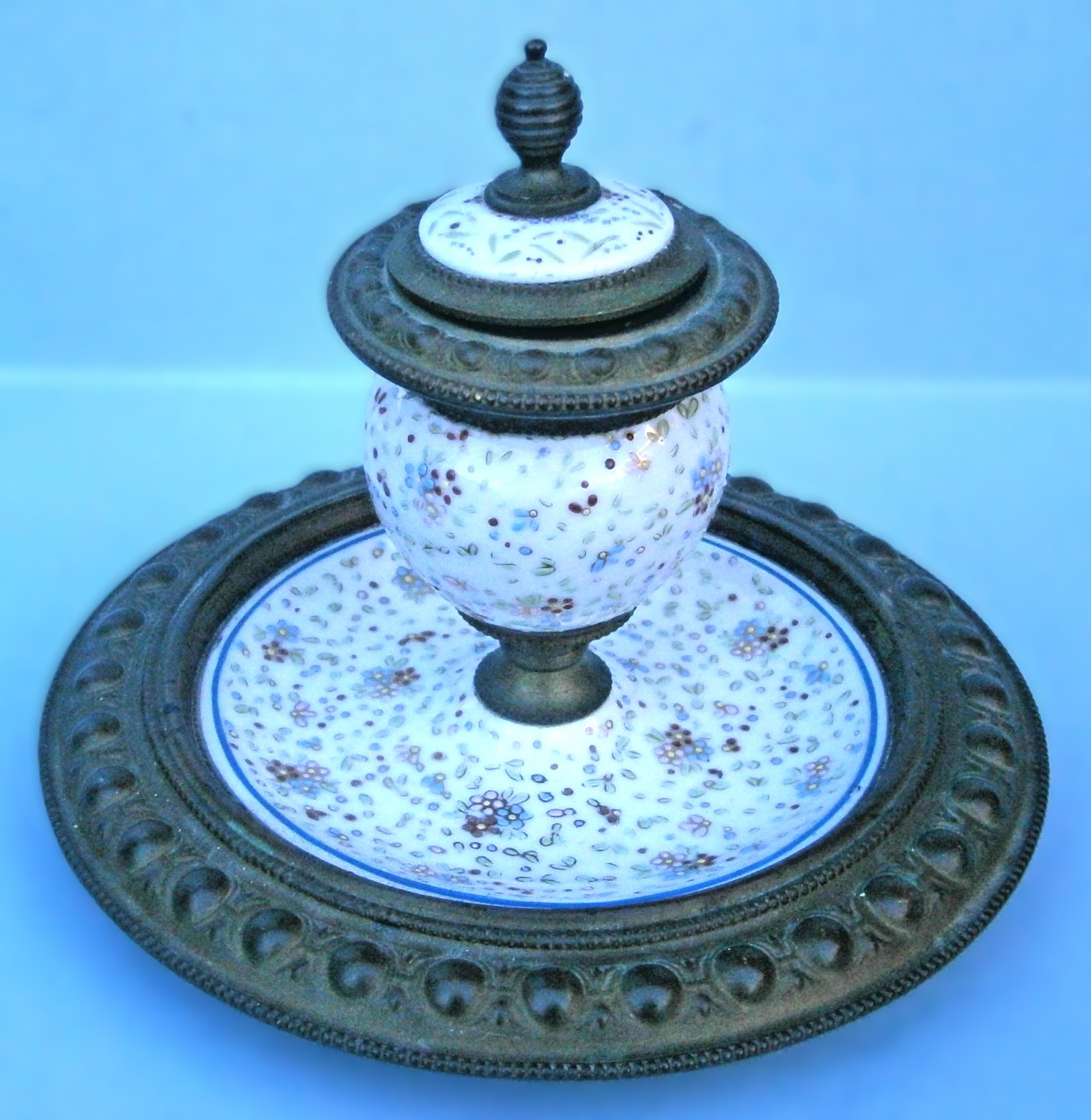 - The Saucer Base: The inkstand consists of a wide porcelain saucer integrated into a heavy, decorative bronze rim. The rim features a chased repeating “bead and reel” pattern.