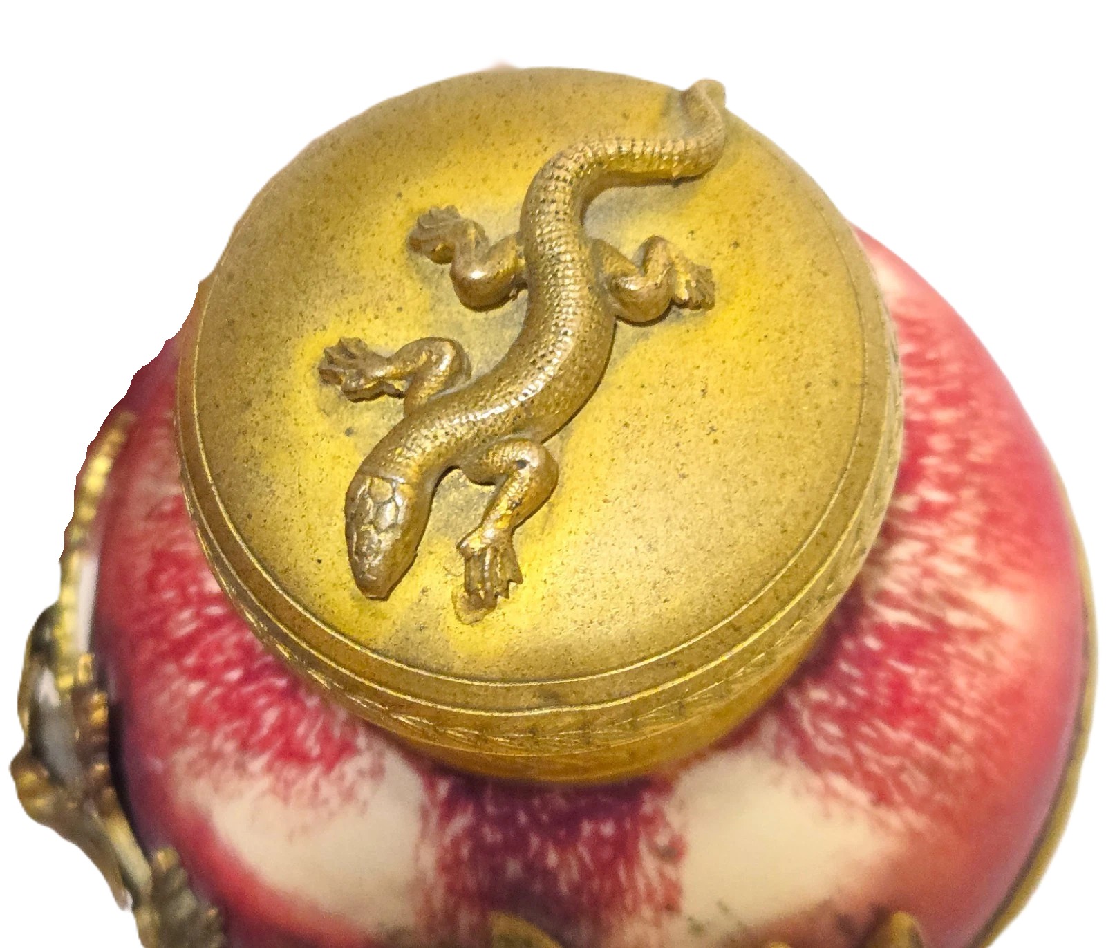 - Lid and Hinges: A hinged metal collar is fitted to the rim of the porcelain. This holds the gilt bronze lid. The most prominent feature is the realistic, highly detailed finial placed atop the lid. Given the artistic and symbolic context of French Art Nouveau and Belle Époque decoration (the likely period), this creature, with its elongated body and limbs, is often interchangeably represented as a salamander or a lizard. The salamander is a powerful symbol in European mythology and heraldry, often associated with fire, and its presence provides a dynamic and eye-catching handle for the lid.