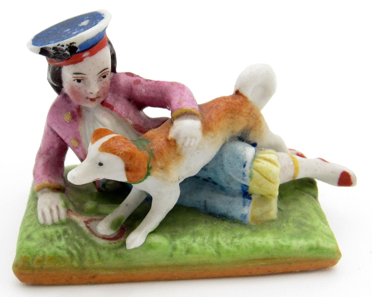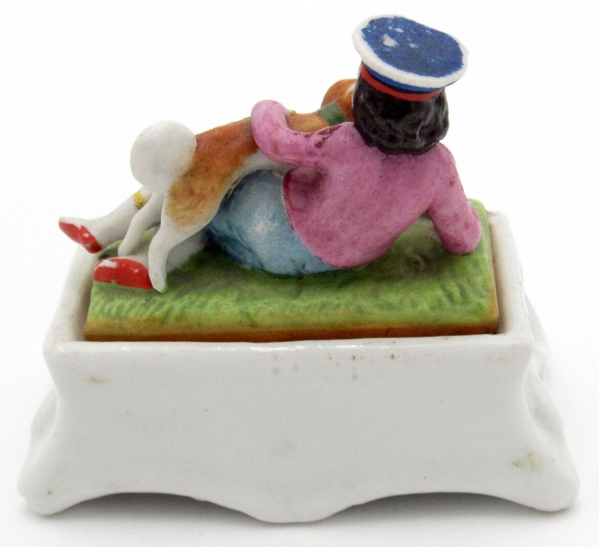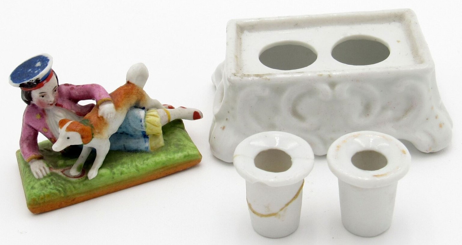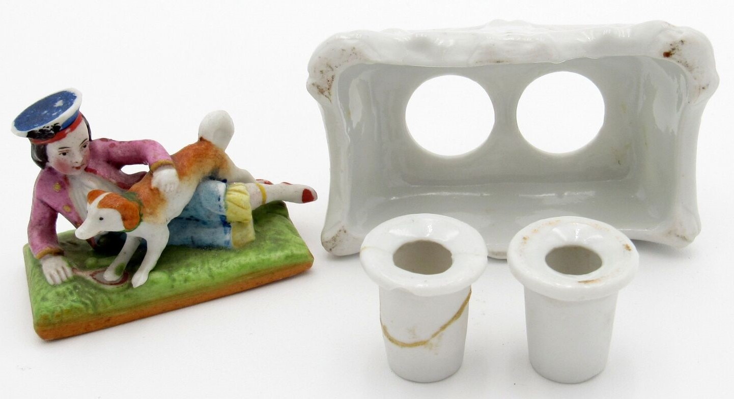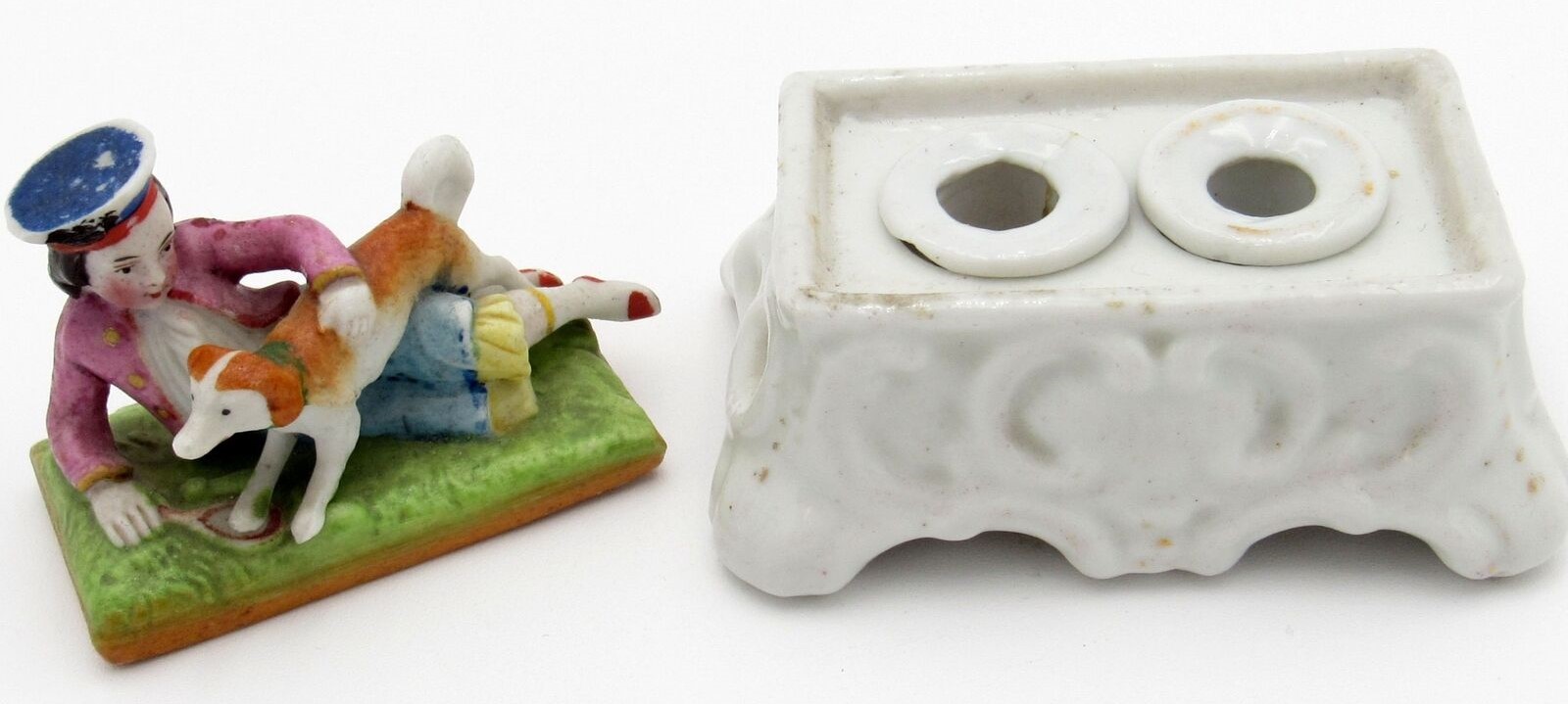 Hand painted porcelain double inkwell featuring a boy playing with his dog.