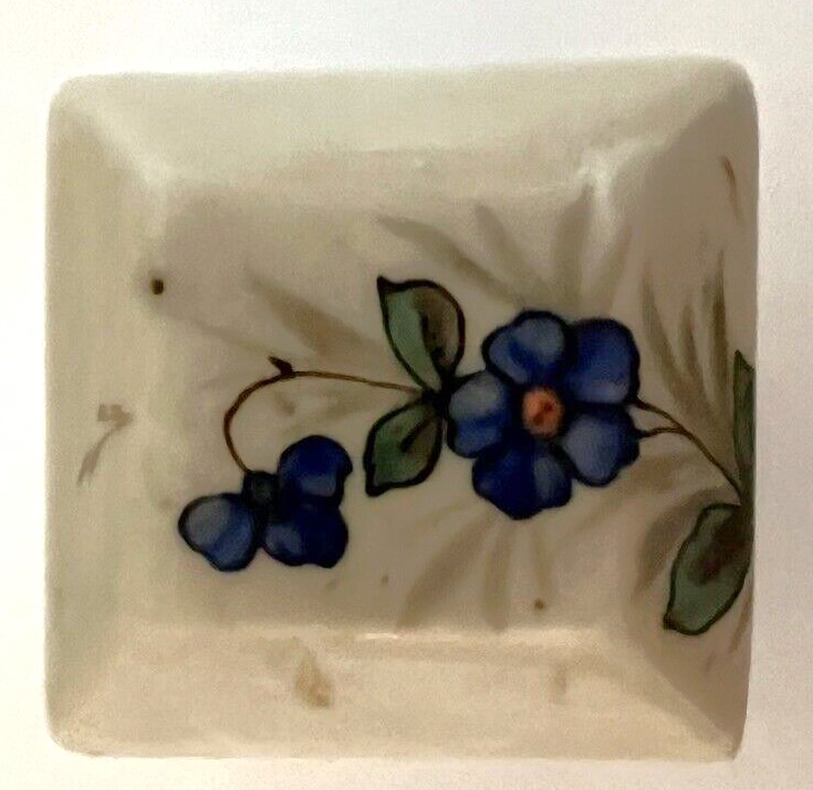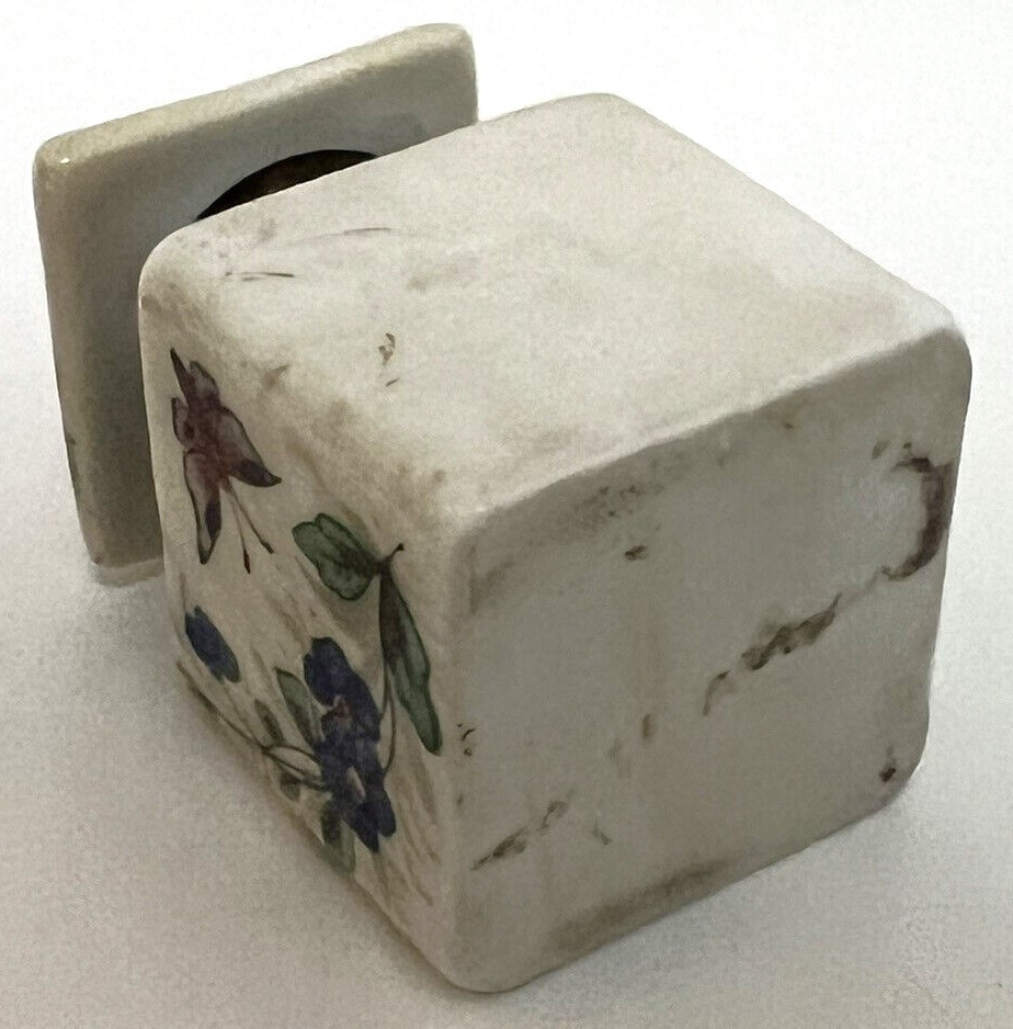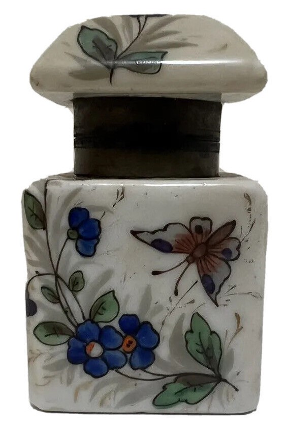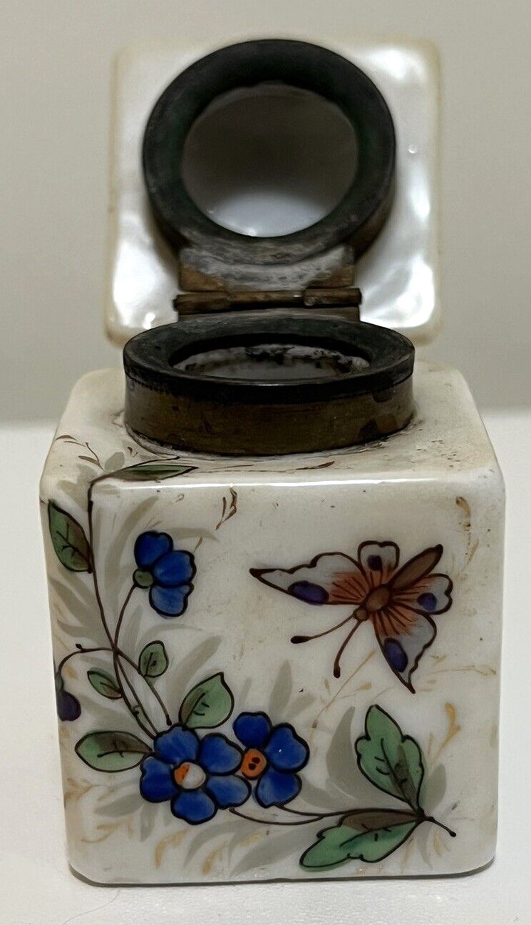 Hand-painted porcelain inkwell with hinged lid featuring a floral and butterfly design.