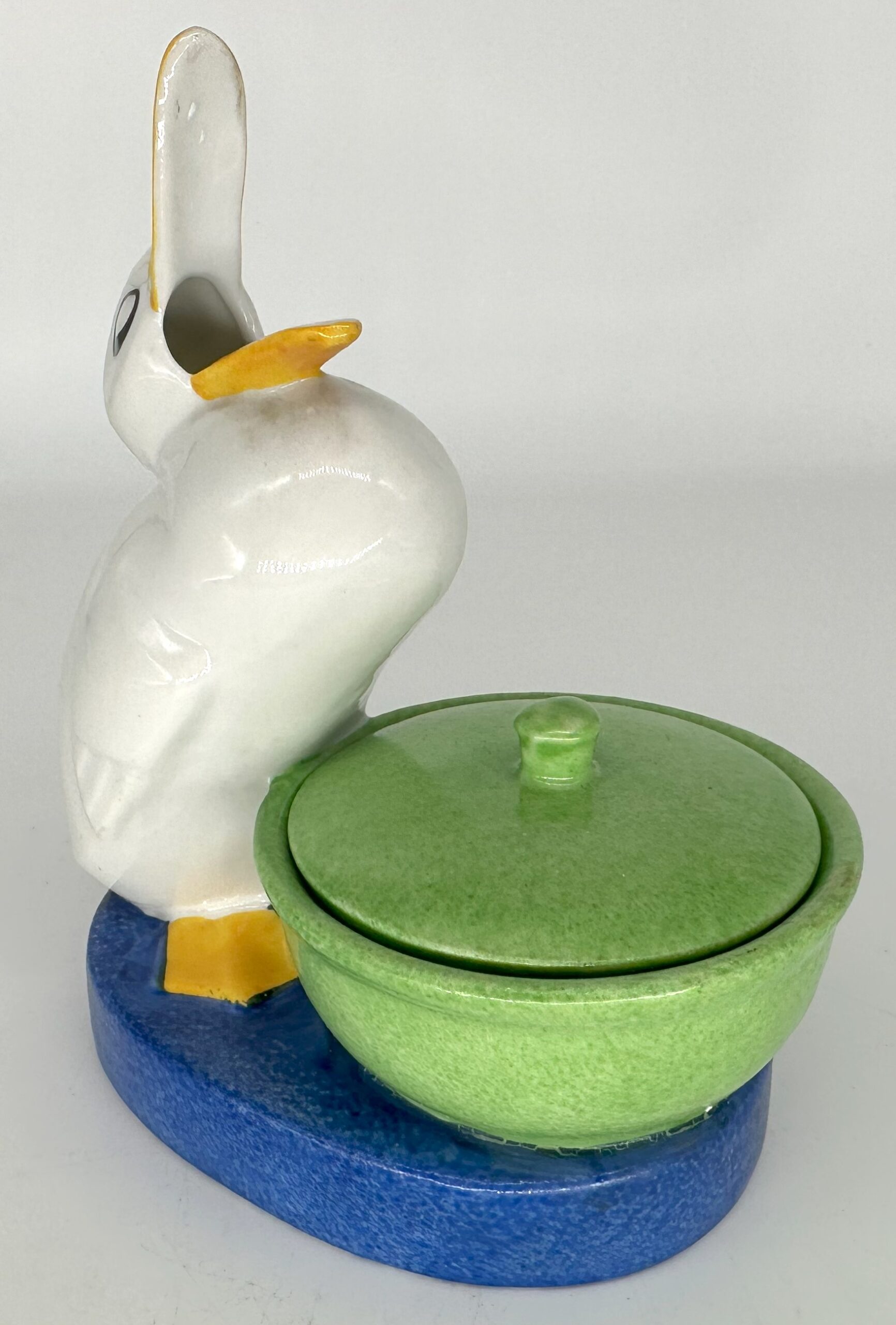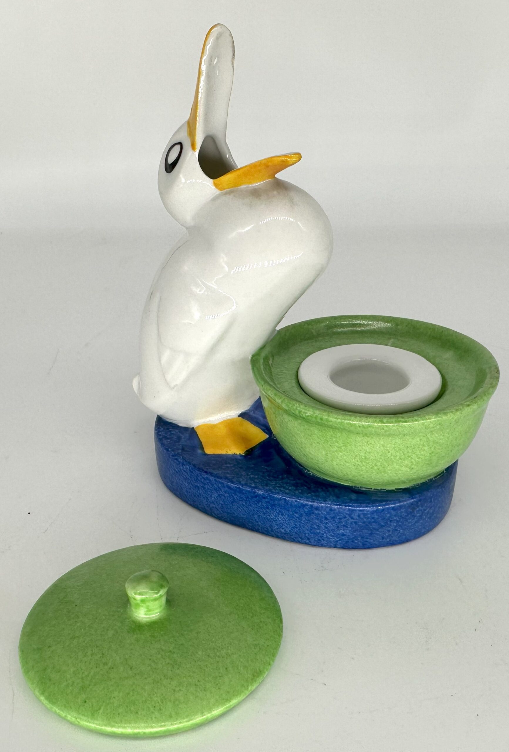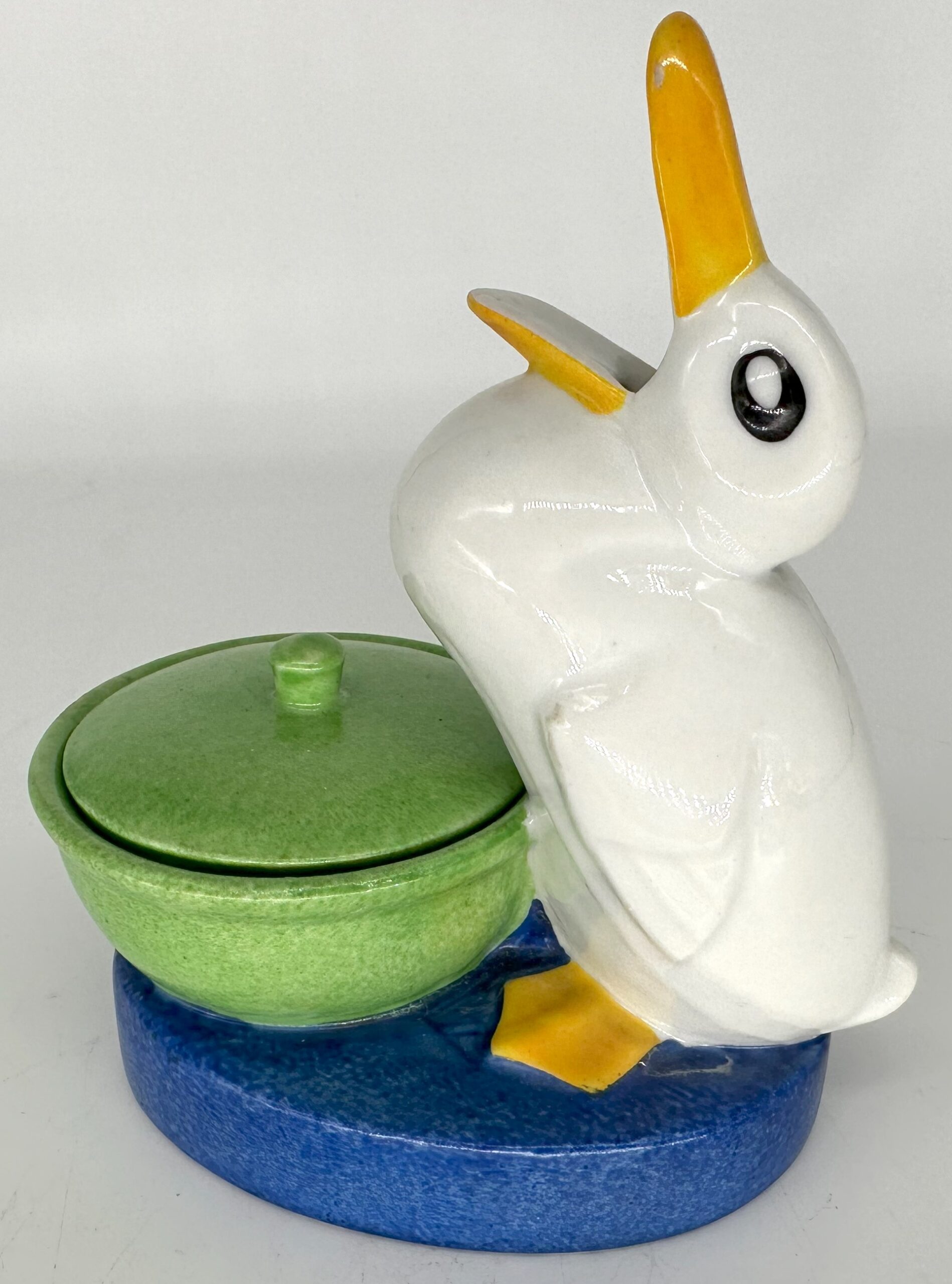 Sitting before a green inkwell with lid, this duck has his bill wide open to hold a pen. The bottom is stamped and marked “Creation Paris France” and “Made in France”. With its bright colors and playful look, this inkwell may have been made for children to use.