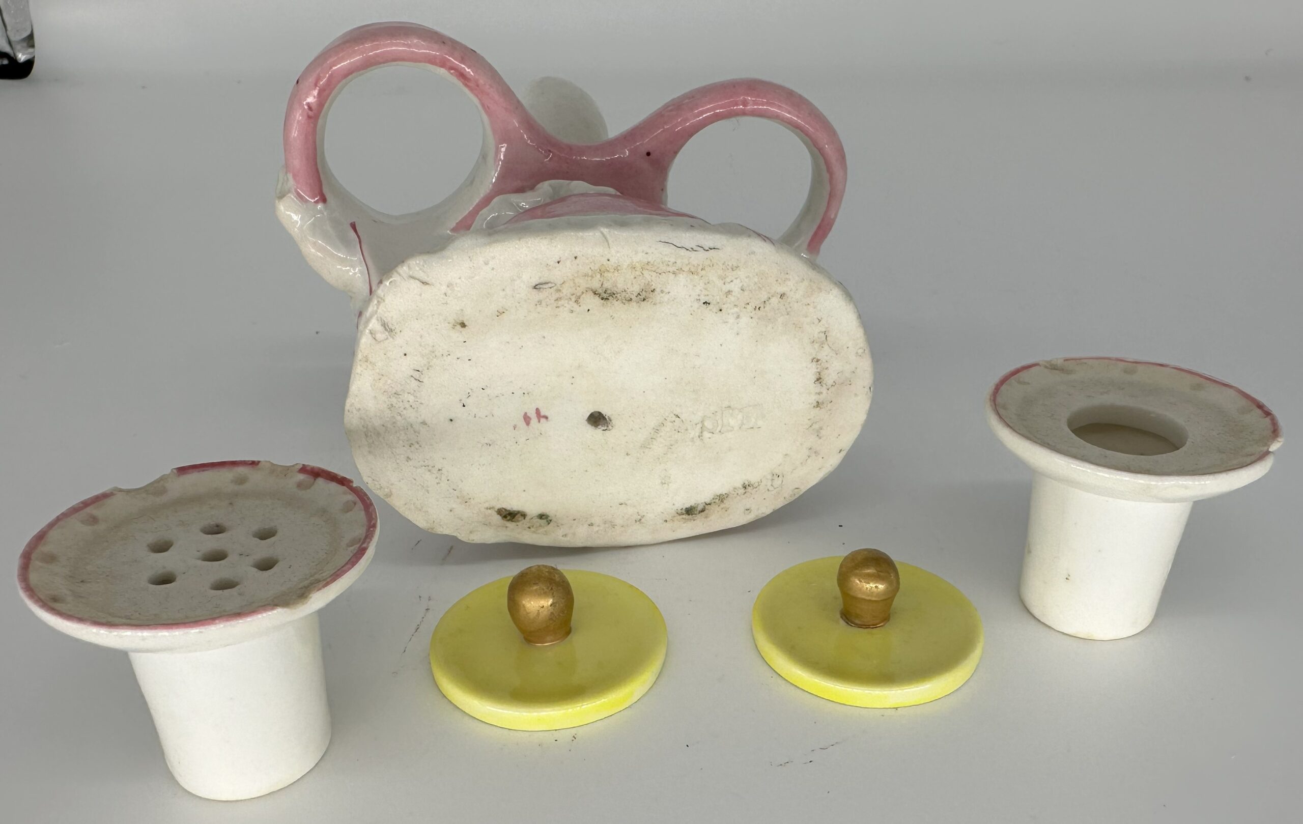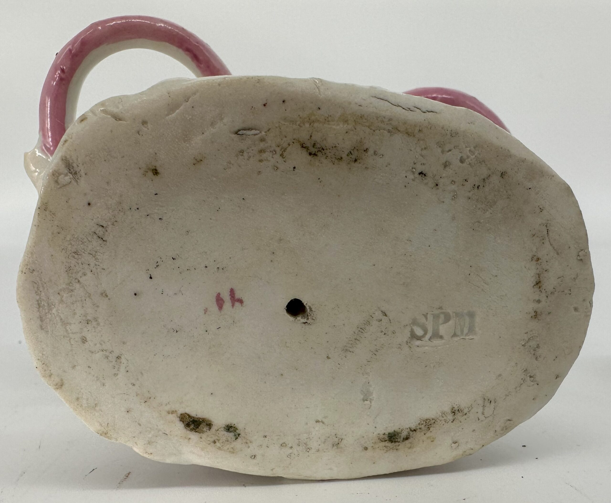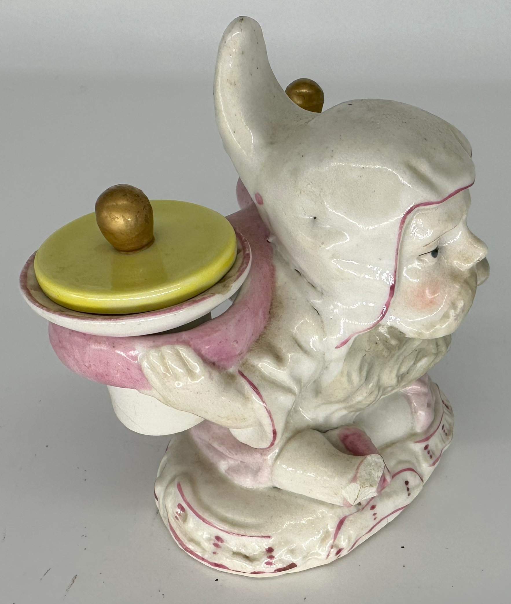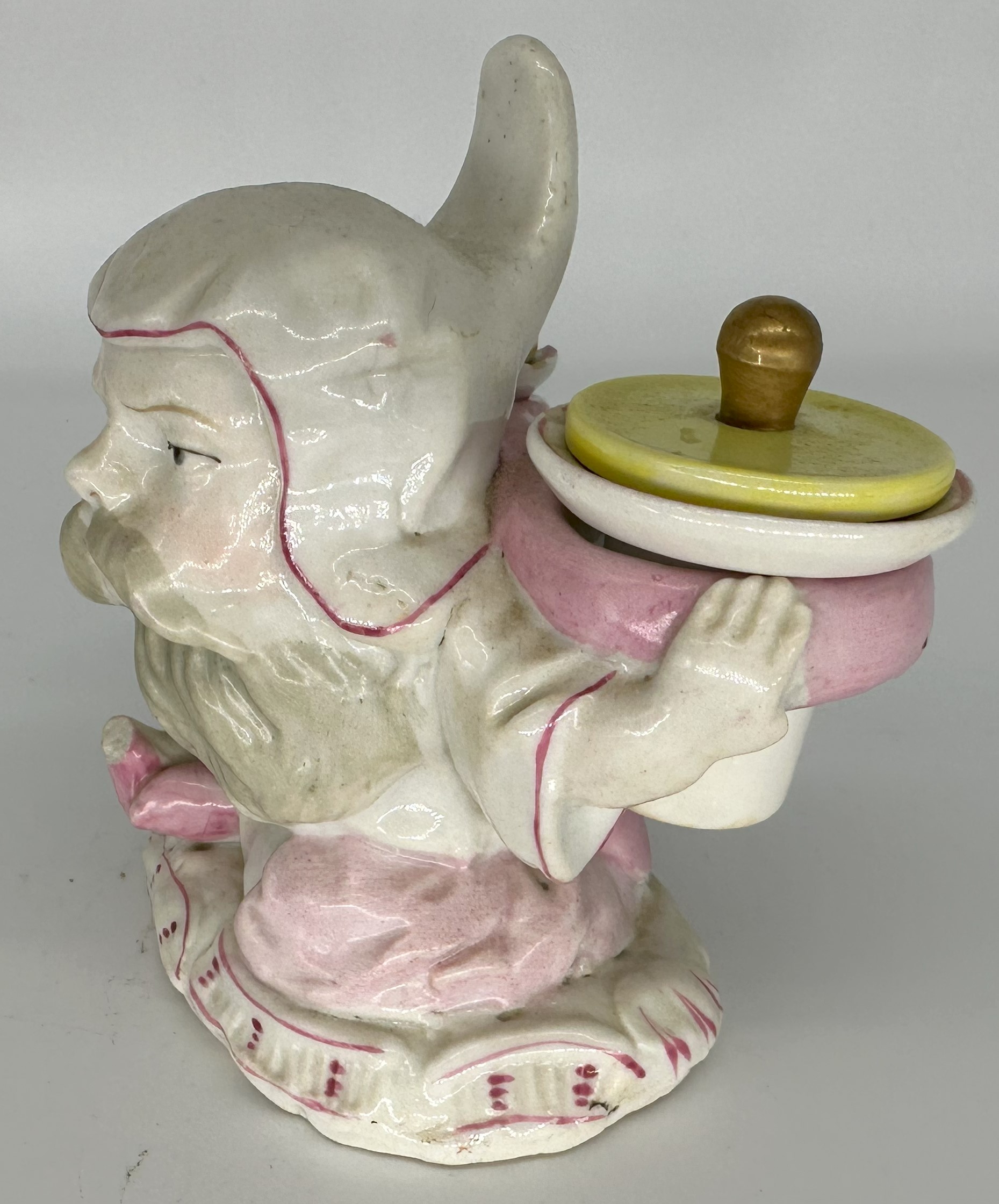 This porcelain dwarf (gnome) carries a heavy load on his back – an inkwell and a sander. The yellow lids are unattached. The piece is marked “SPM” which may be for Schmeisser Porzellan Manufaktur.
