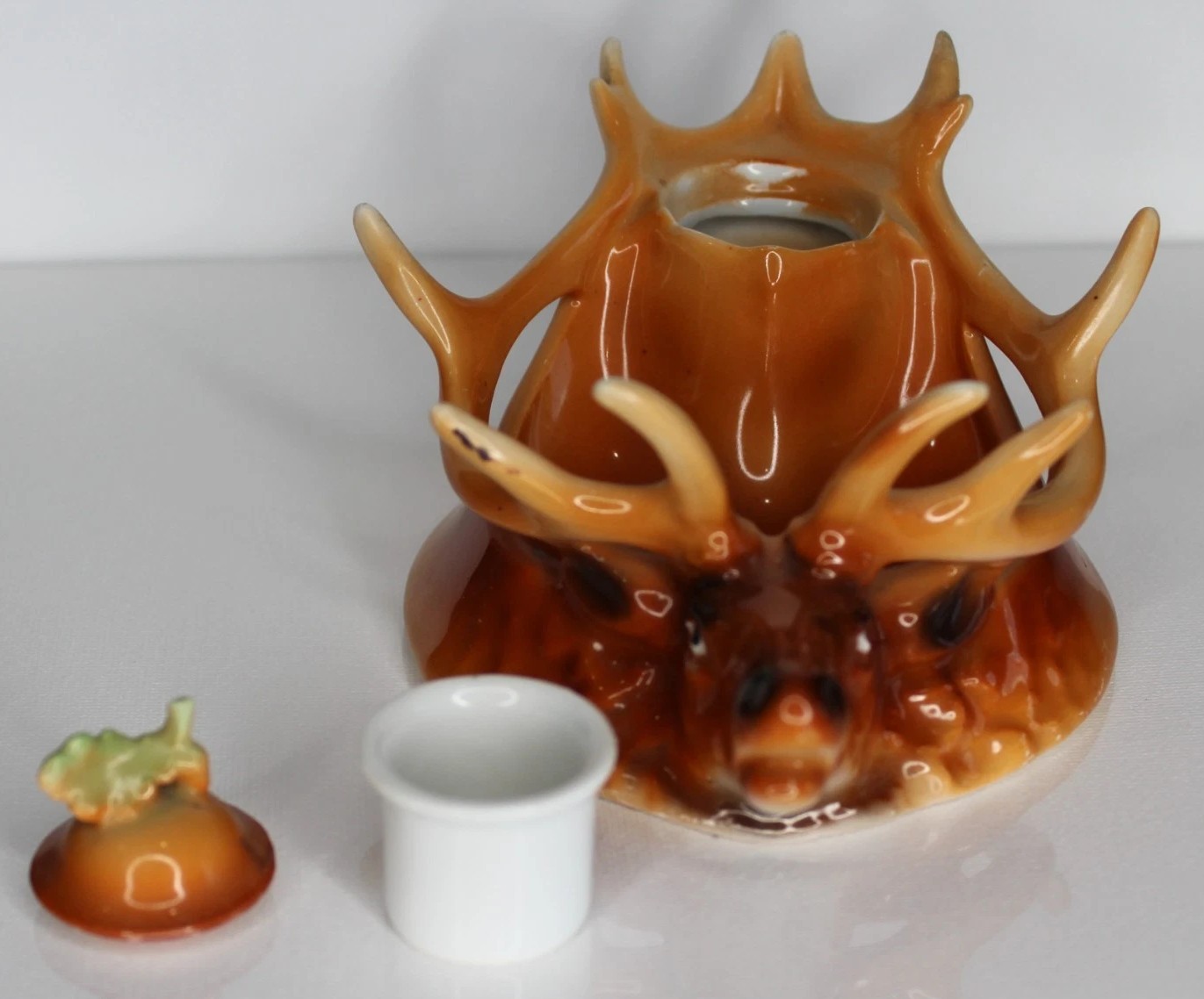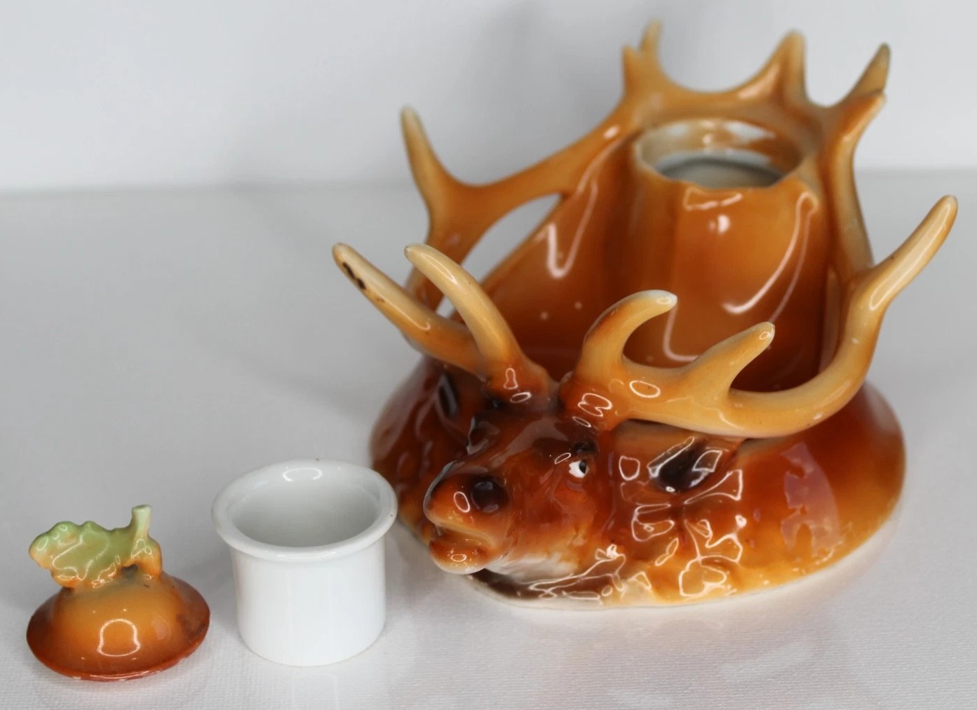 This porcelain inkstand is in the form of an elk’s or stag’s head, rendered in naturalistic colors with a smooth, glazed finish. The animal’s antlers serve a dual purpose as a convenient pen holder. The inkwell is integrated into a tree stump positioned behind the elk. The lid of the inkwell is a separate piece sculpted with a small green branch with leaves as a finial, which lifts to access the inkpot inside the stump.