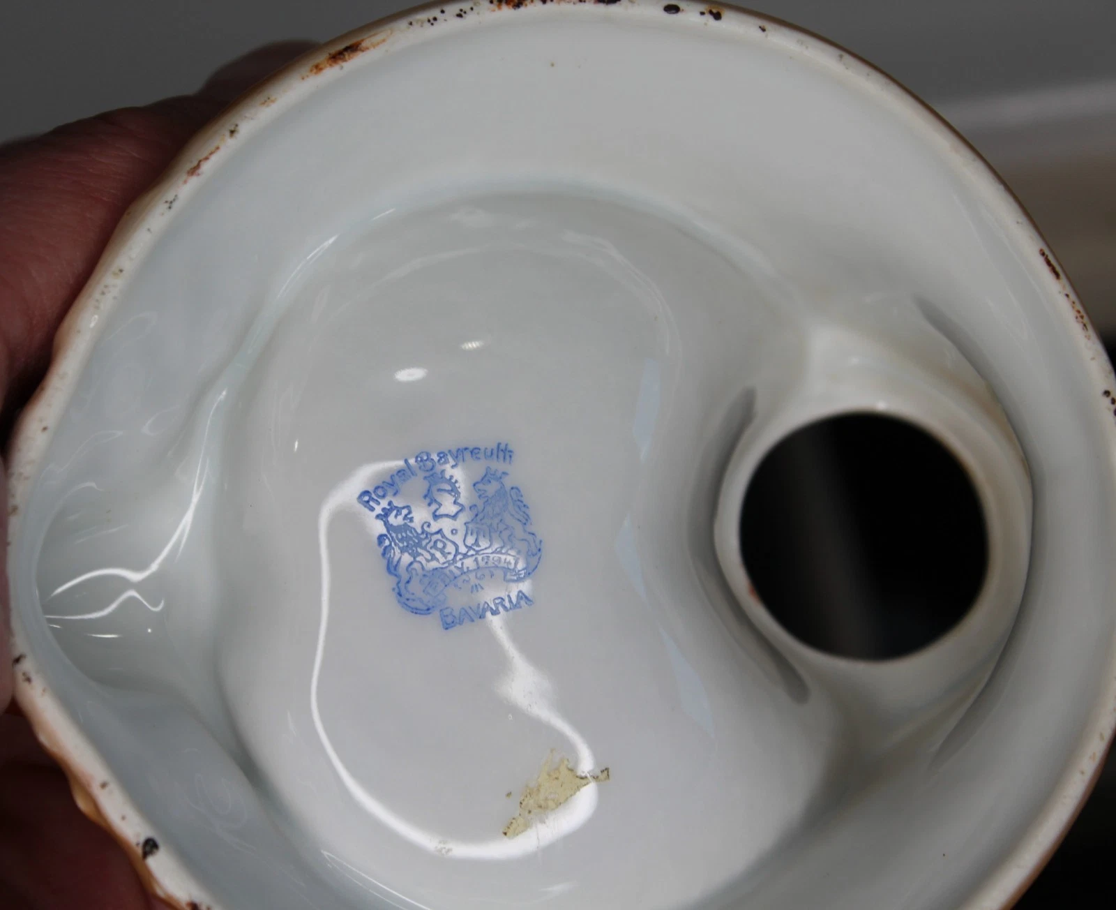 The mark on the bottom of the piece, Royal Bayreuth, belongs to a famous porcelain factory located in Bavaria, Germany. The company, originally founded in 1794, adopted the name “Royal Bayreuth” around 1885, when it became known for its decorative and often unconventional porcelain.