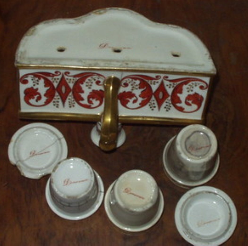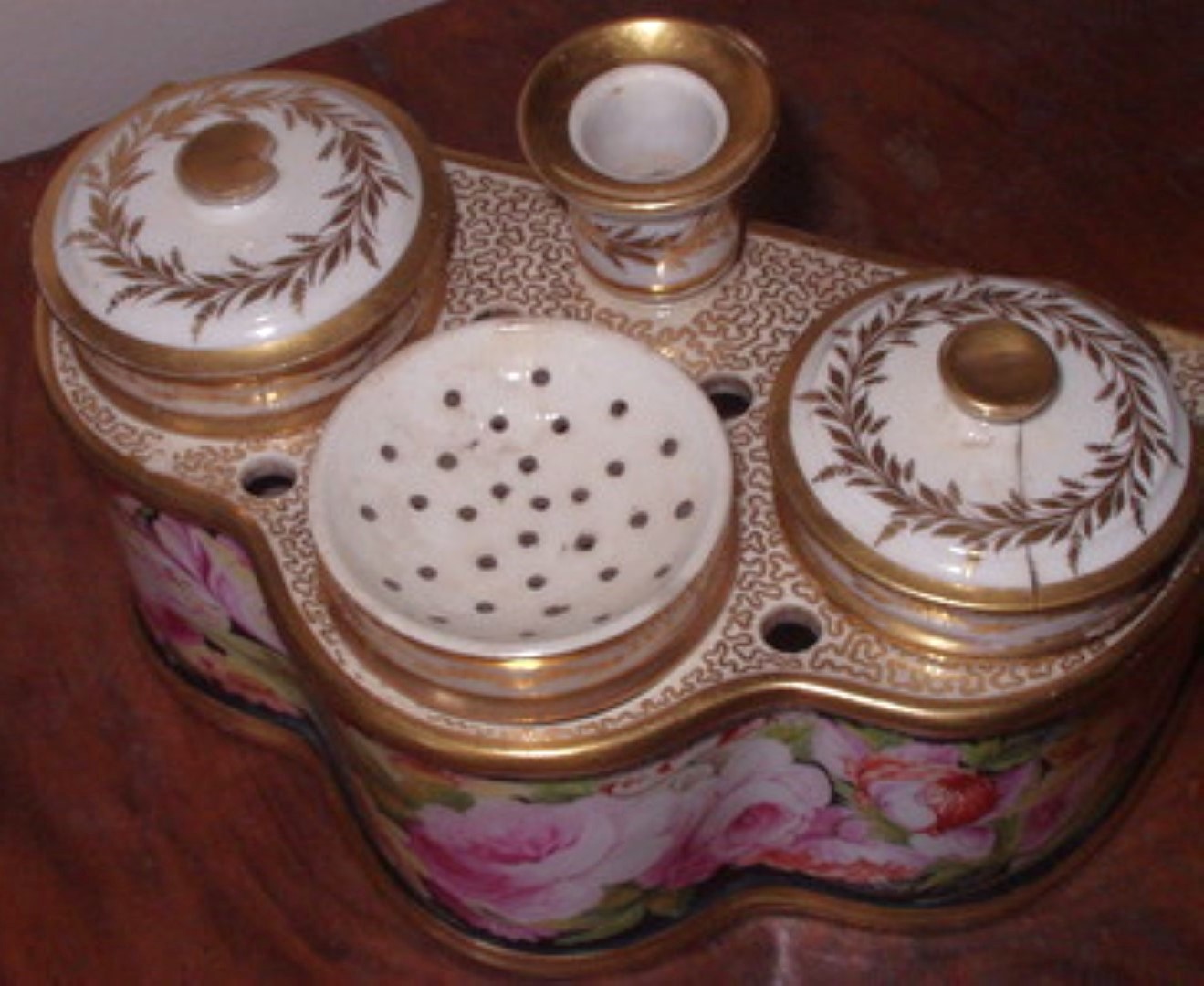 This porcelain double inkstand, in addition to two inkwells, has a pounce pot, a candleholder, and a carrying handle. It is hand painted in gilt and colored enamels with fine flower (peony) painting on the main body. This inkstand was decorated and signed by James Donovan of Dublin. Pieces are marked in original free-hand script.