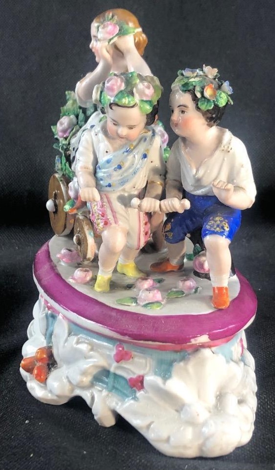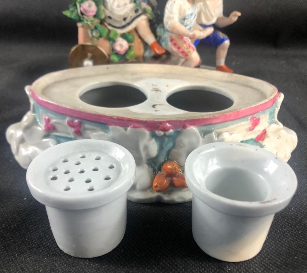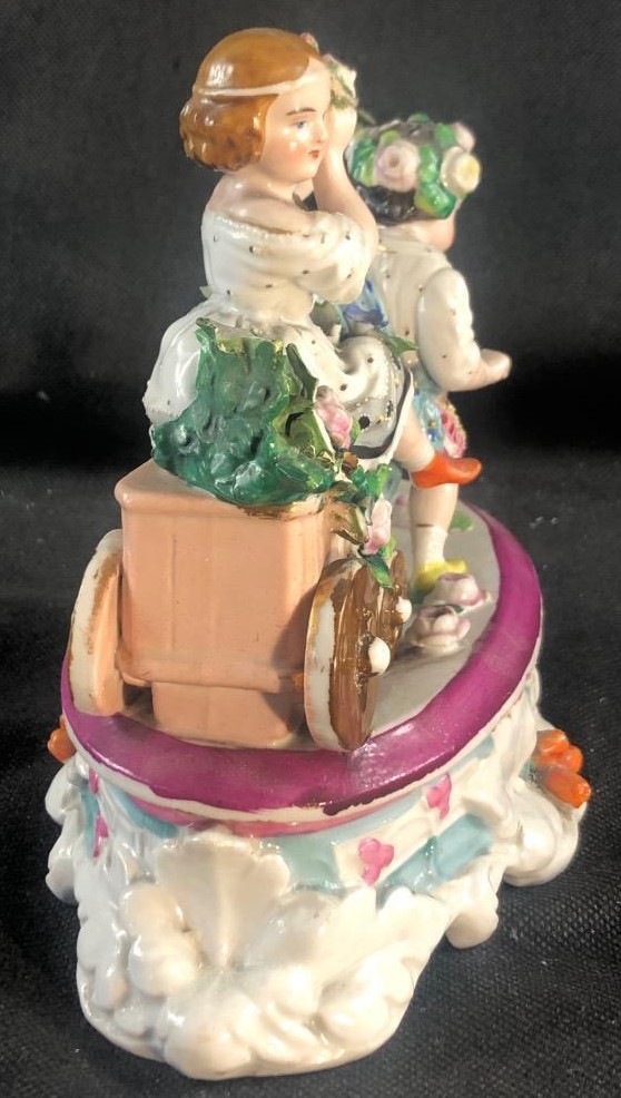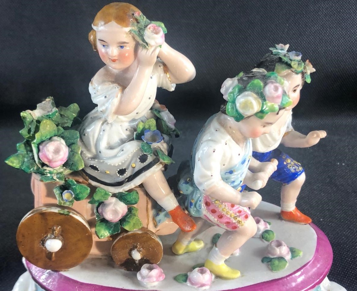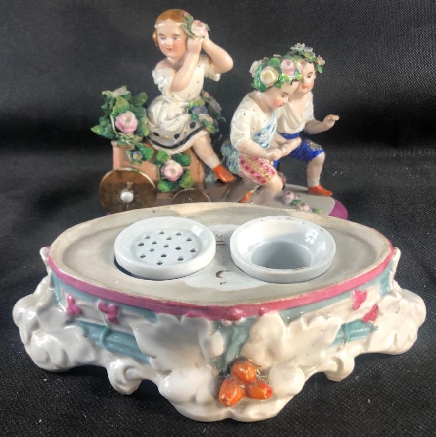 With flowers in their hair, two boys are pulling a cart which carries a girl who is adjusting the flowers in her hair. The cart has wheels and is adorned with green foliage and pink roses. The entire scene lifts off to access an inkwell and a sander resting in the oval-shaped base decorated with flowers.