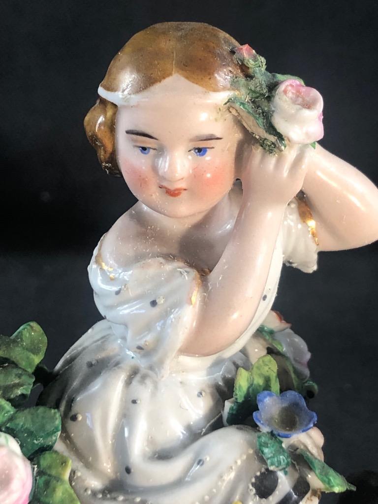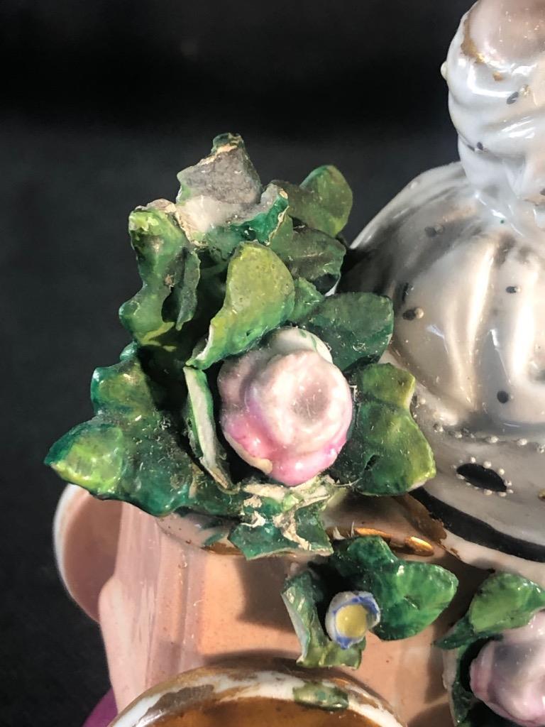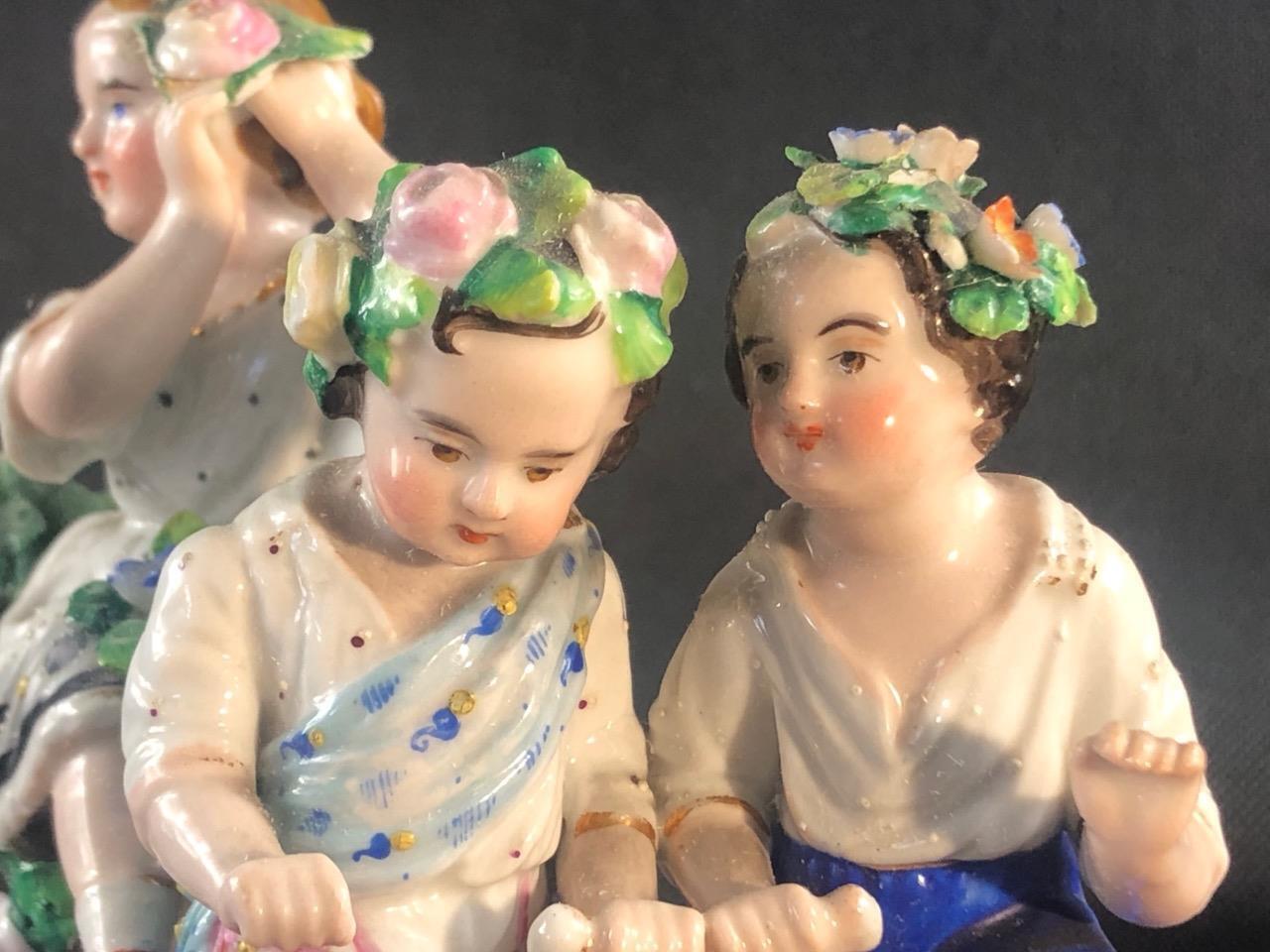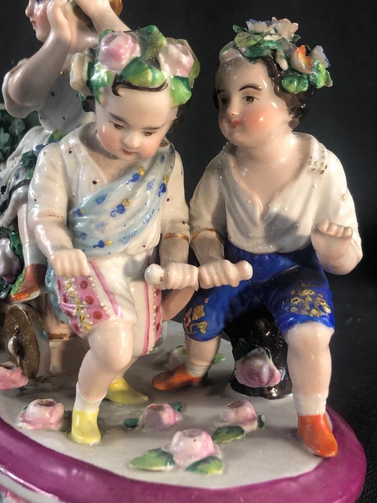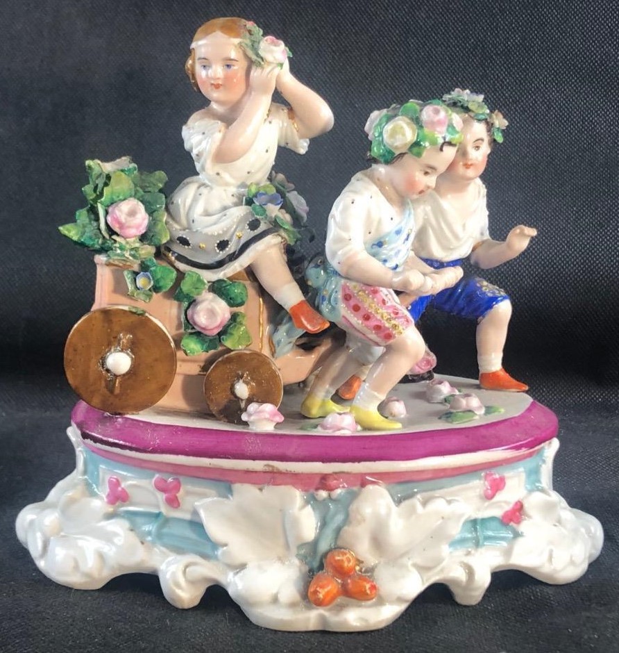 With flowers in their hair, two boys are pulling a cart which carries a girl who is adjusting the flowers in her hair. The cart has wheels and is adorned with green foliage and pink roses. The entire scene lifts off to access an inkwell and a sander resting in the oval-shaped base decorated with flowers.