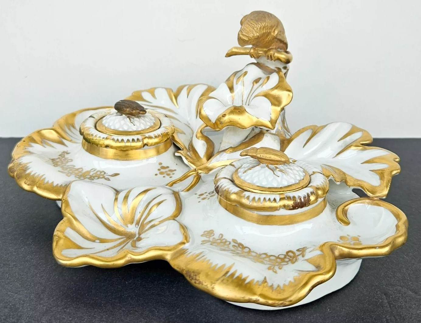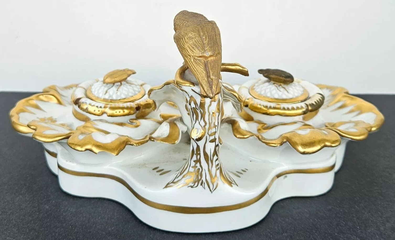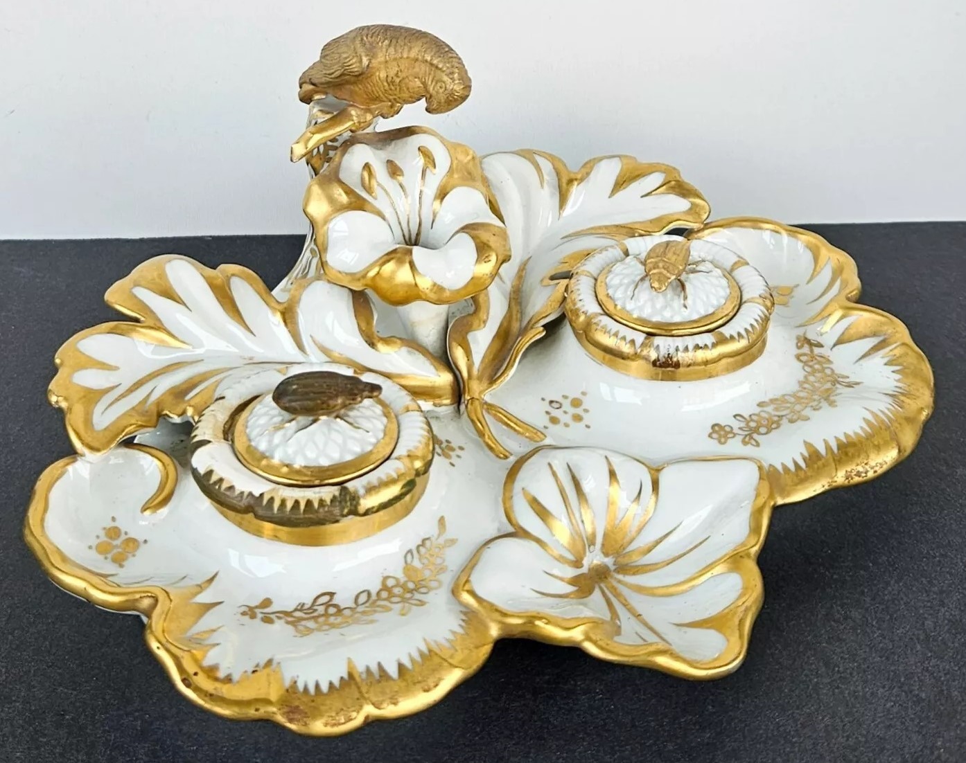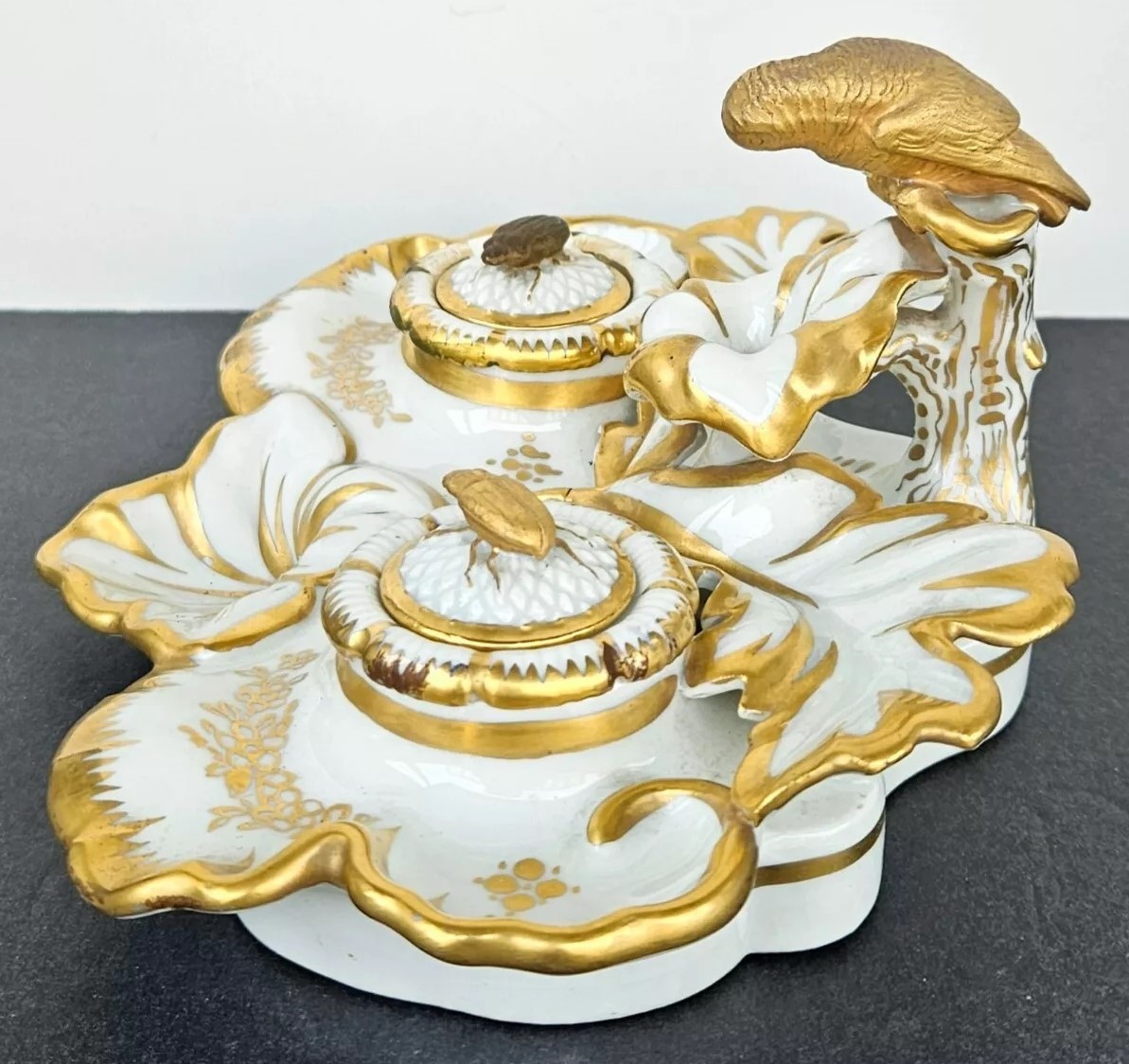 This inkstand features a gilt gold parrot perched elegantly, overseeing the entire piece. Included are an inkwell and a sander. Their lids are adorned with finials shaped like insects. The inkstand bears the Eagle Mark for TPM (Tielsch Porzellan Manufactur), which is one of the earliest marks used by the Altwasser Factory in Germany.