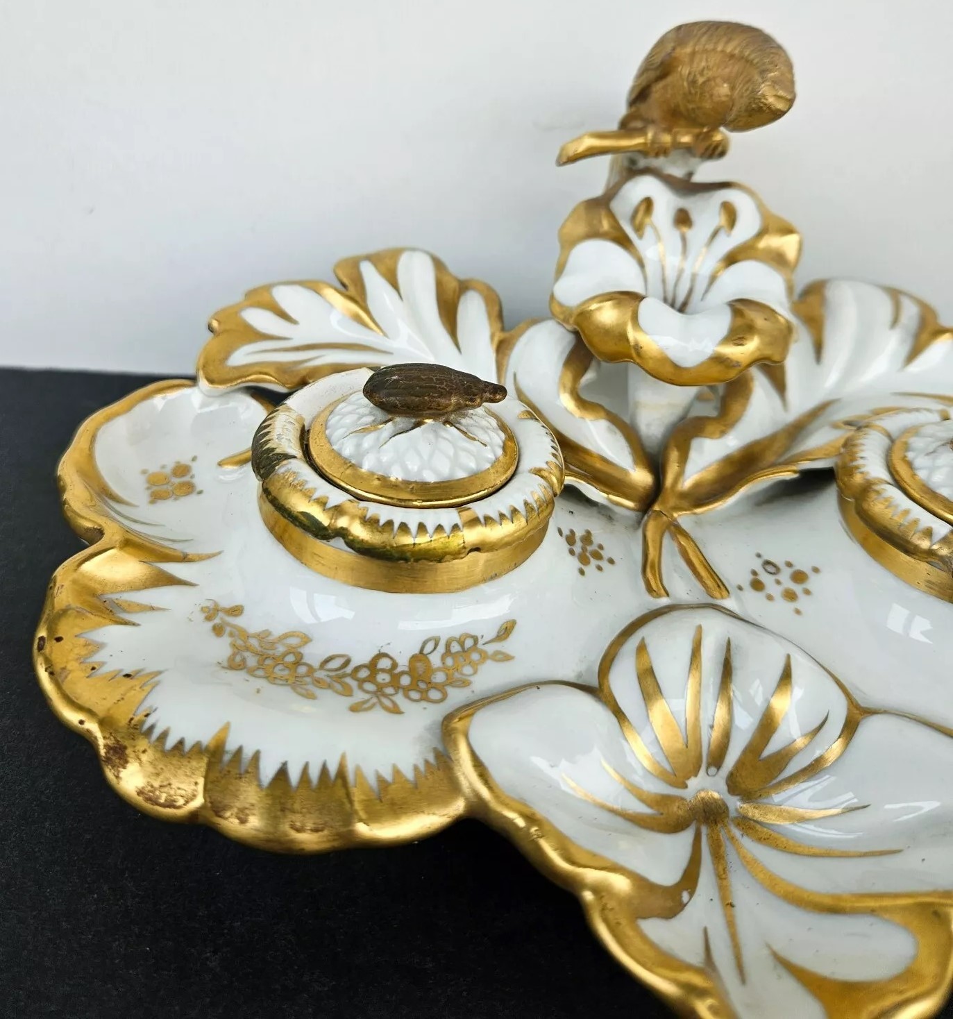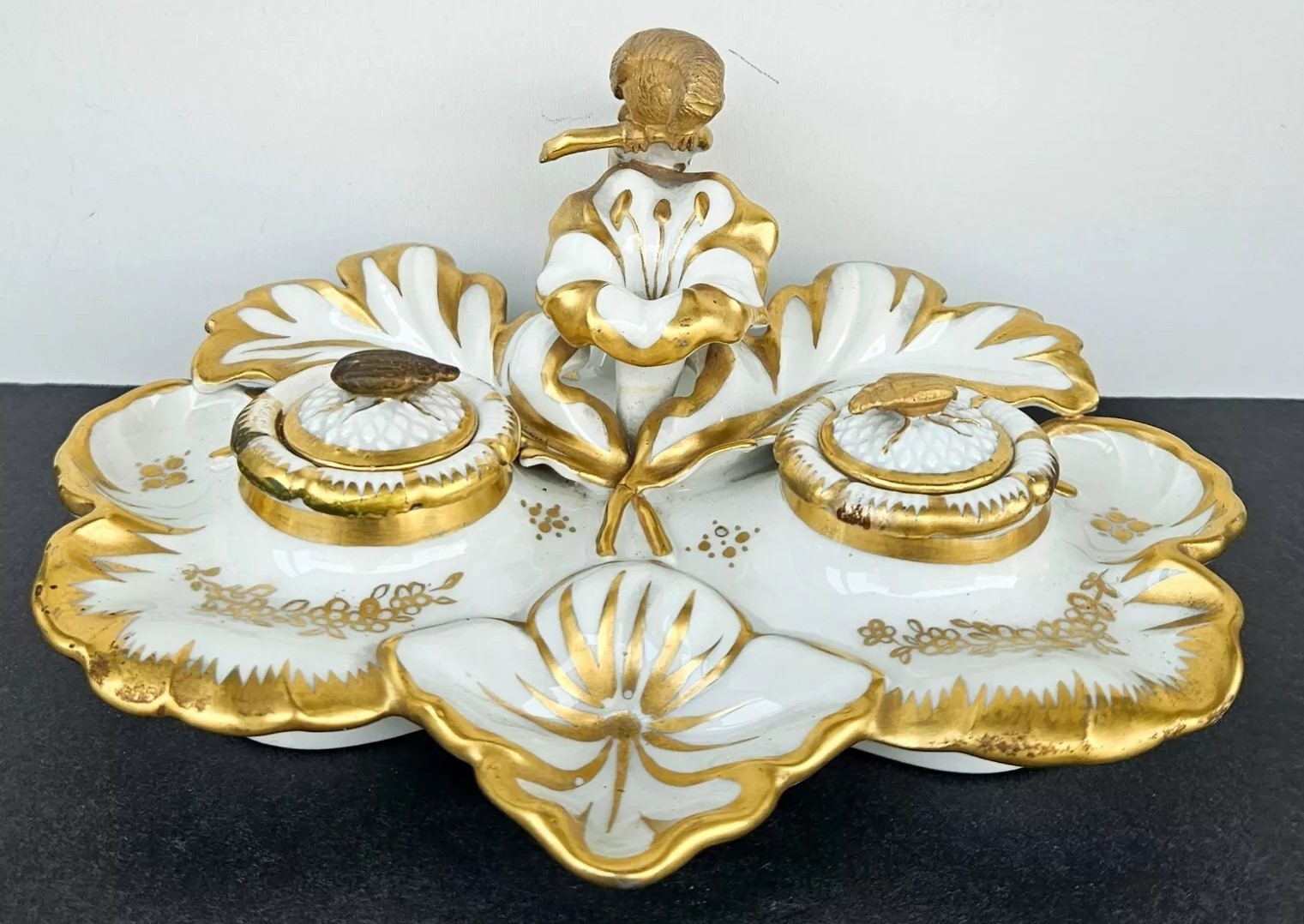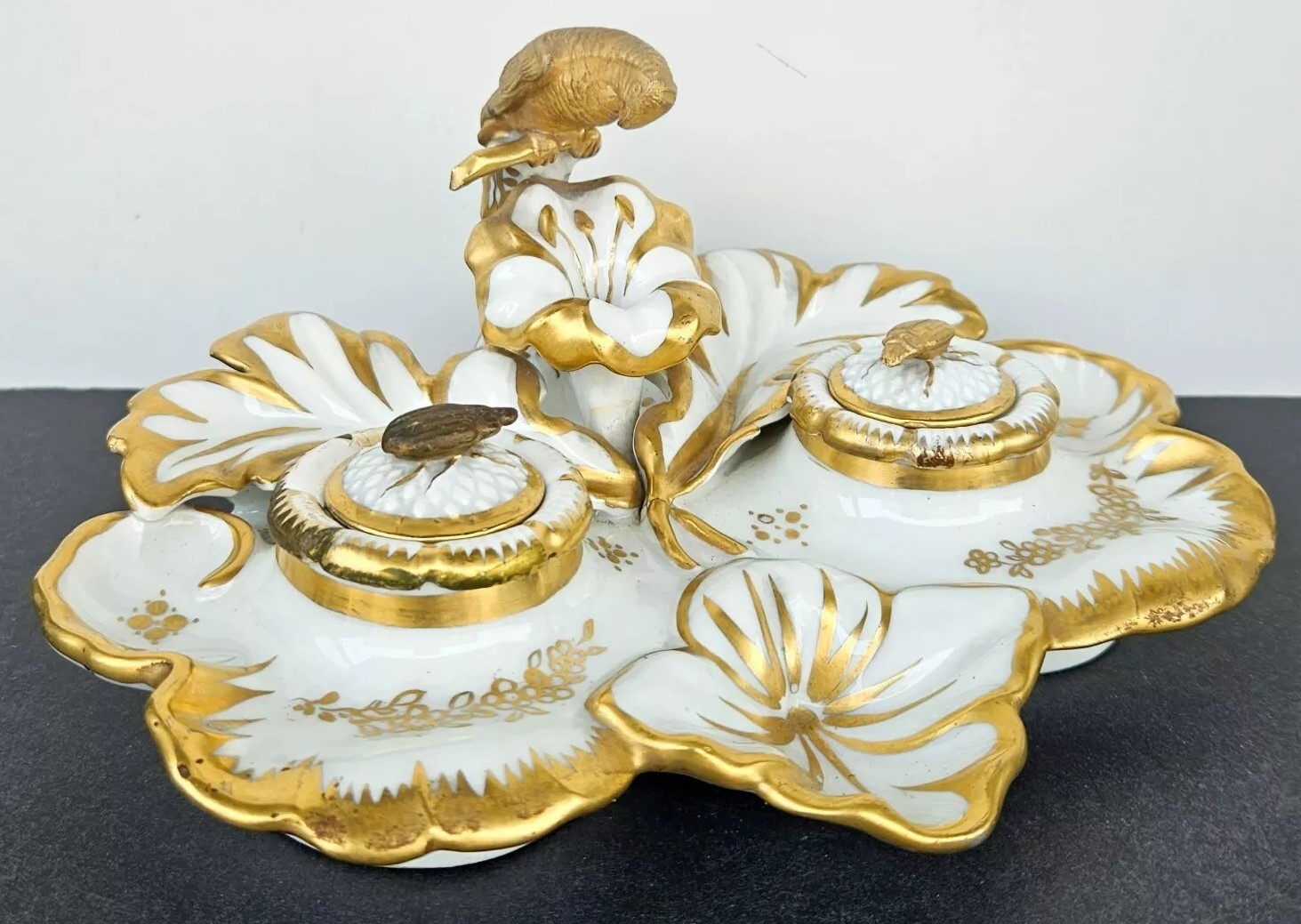 This inkstand features a gilt gold parrot perched elegantly, overseeing the entire piece. Included are an inkwell and a sander. Their lids are adorned with finials shaped like insects. The inkstand bears the Eagle Mark for TPM (Tielsch Porzellan Manufactur), which is one of the earliest marks used by the Altwasser Factory in Germany.