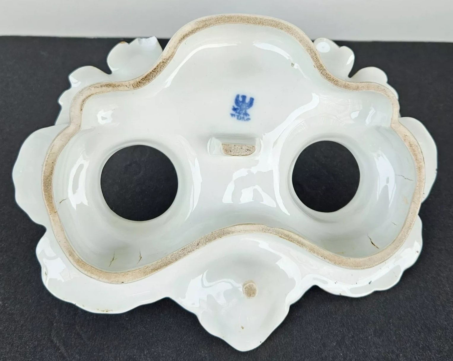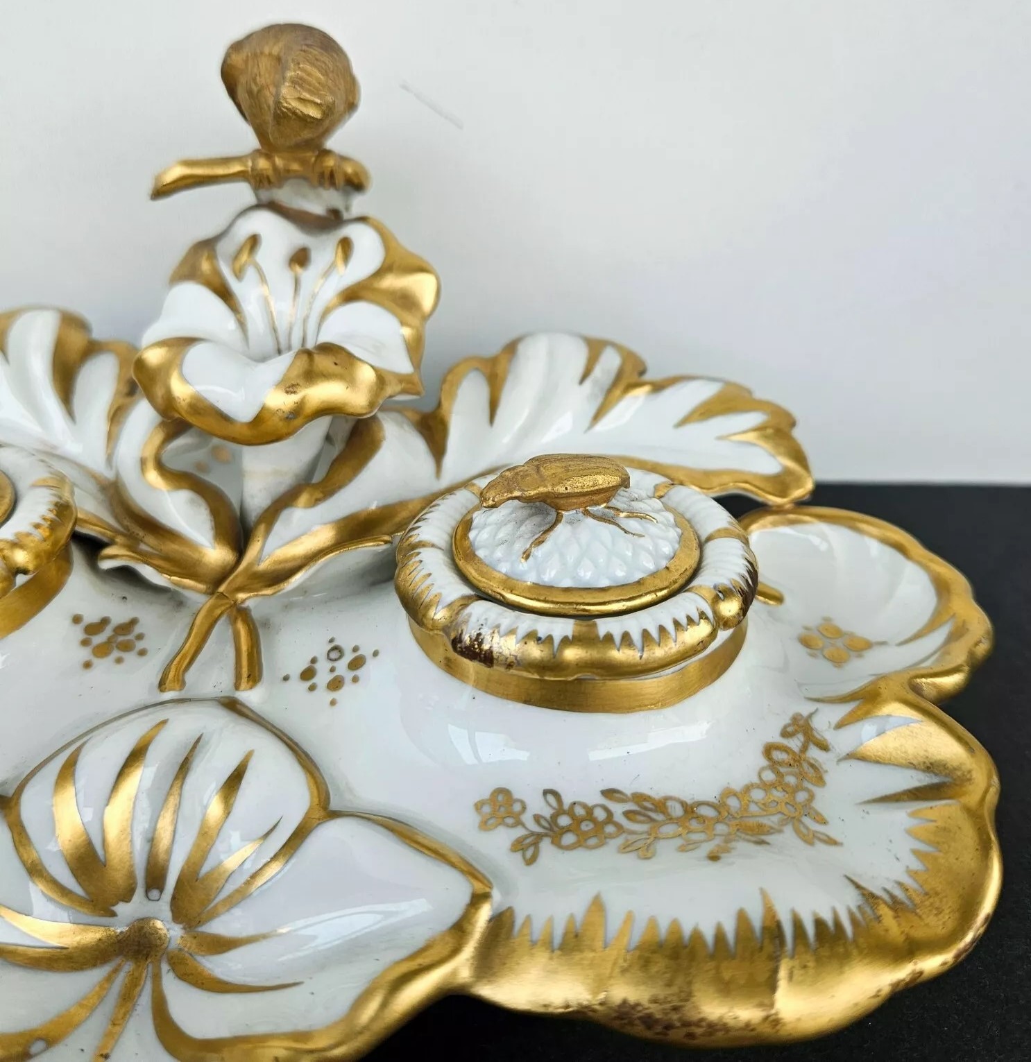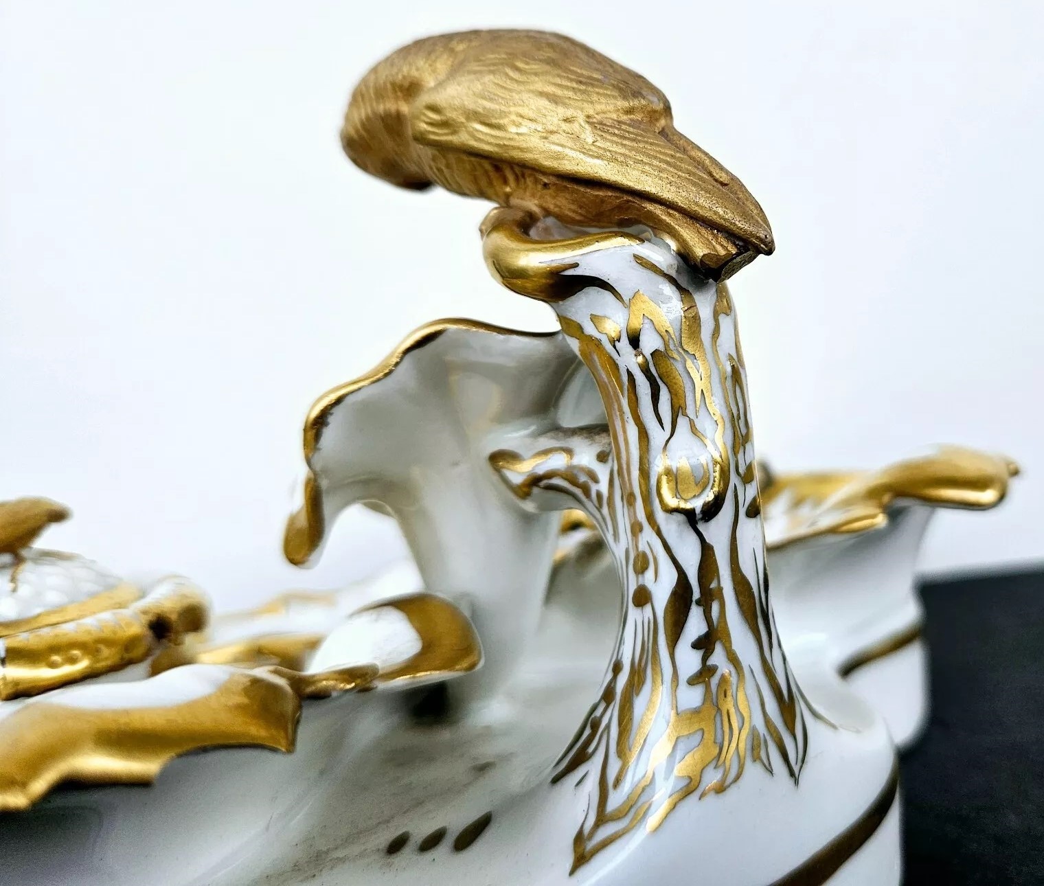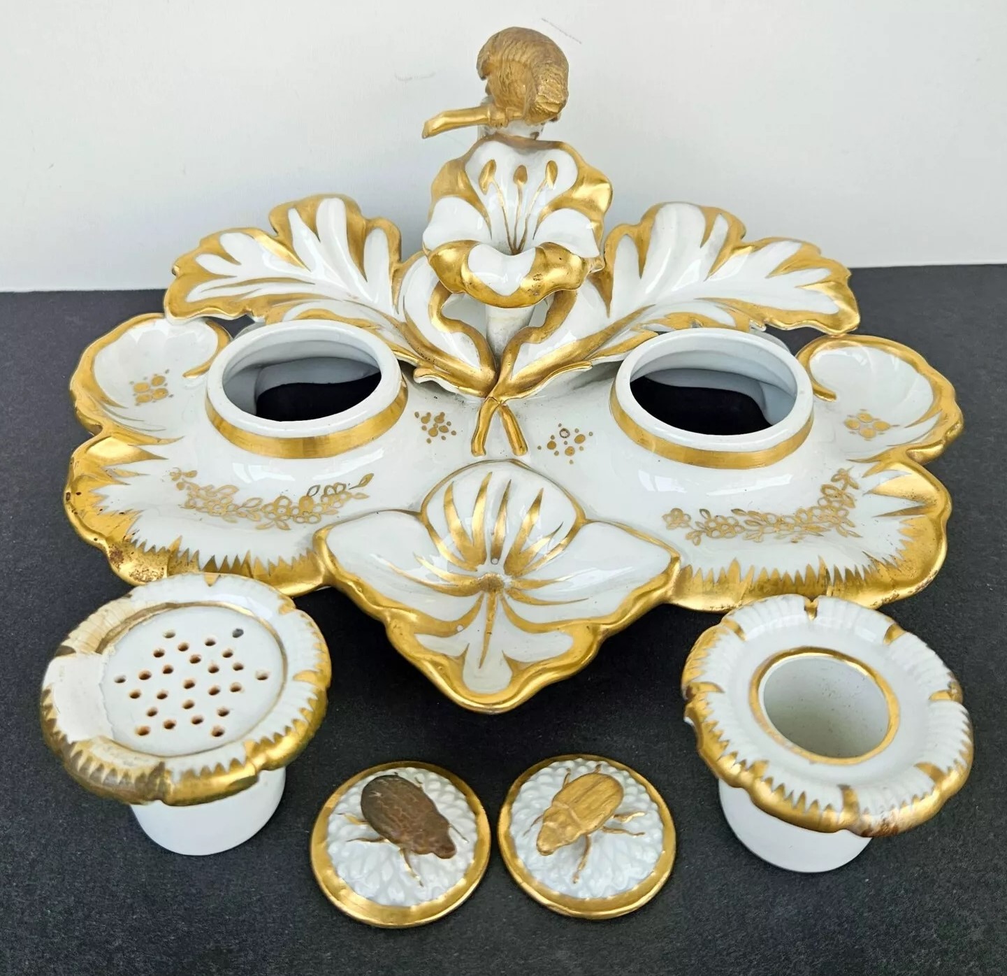 This inkstand features a gilt gold parrot perched elegantly, overseeing the entire piece. Included are an inkwell and a sander. Their lids are adorned with finials shaped like insects. The inkstand bears the Eagle Mark for TPM (Tielsch Porzellan Manufactur), which is one of the earliest marks used by the Altwasser Factory in Germany.