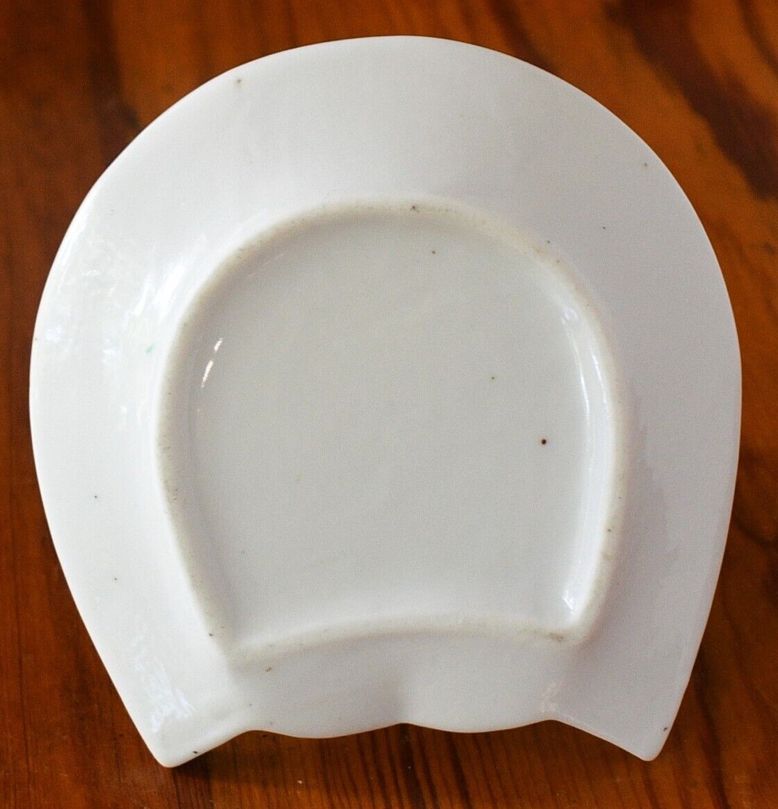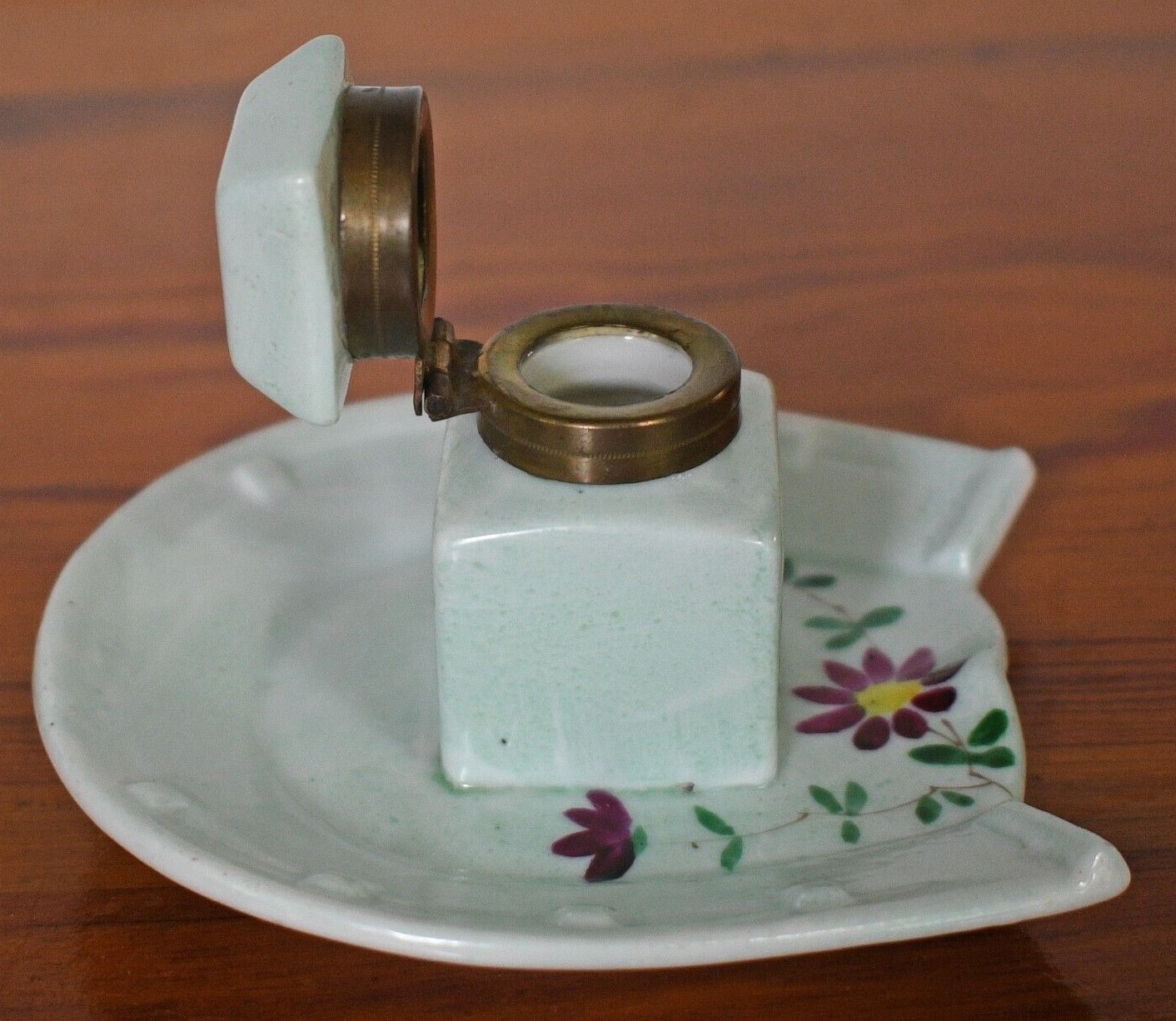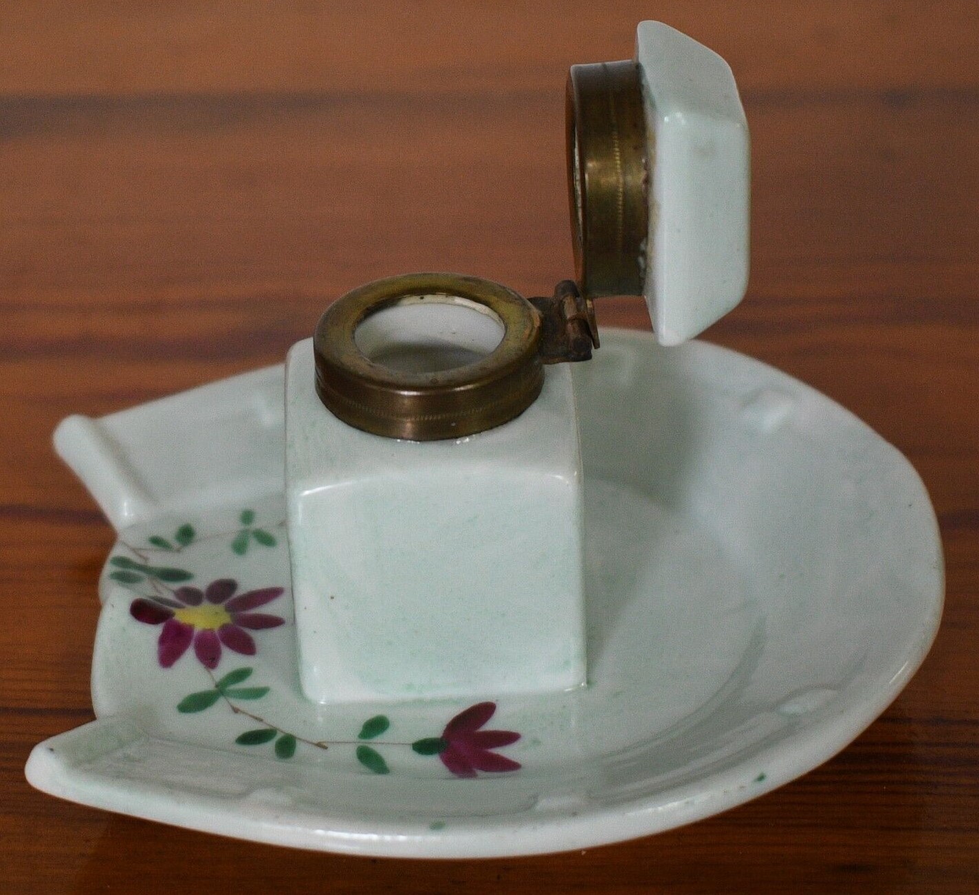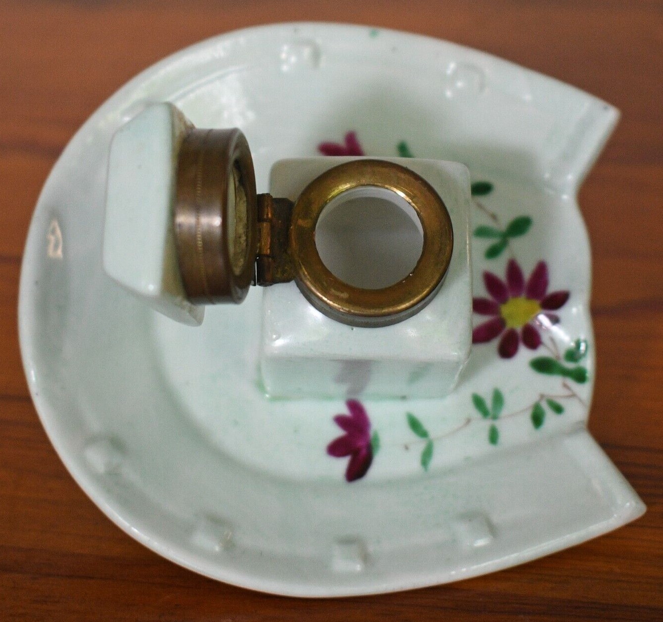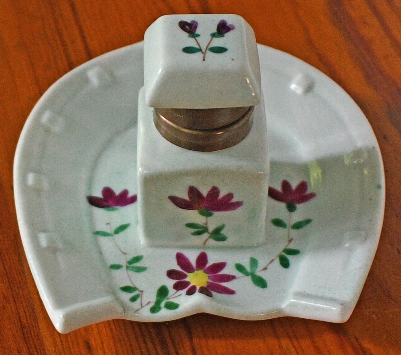 A porcelain inkwell with hand painted florals is attached to a horseshoe shaped base.
