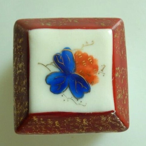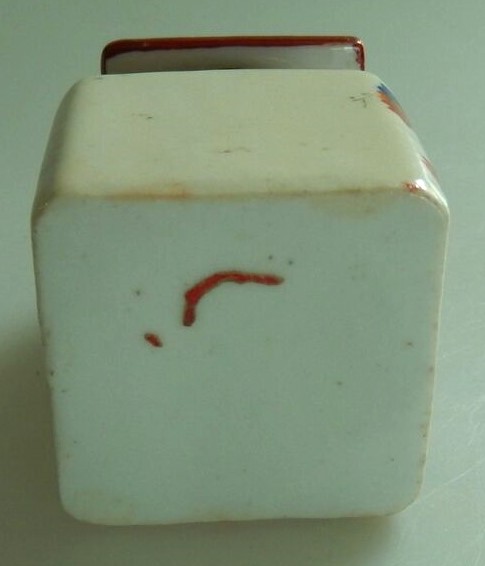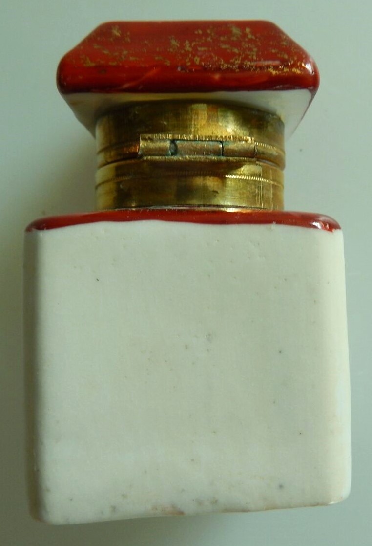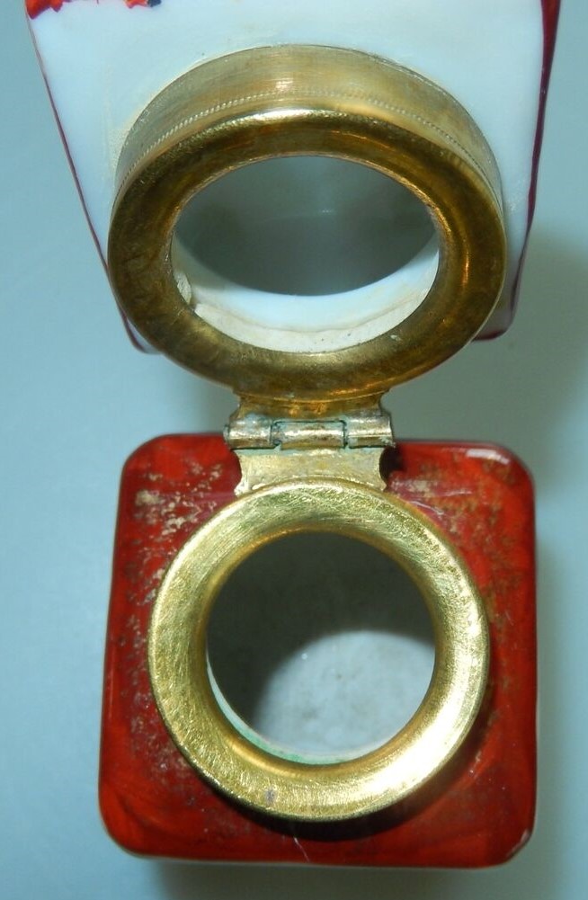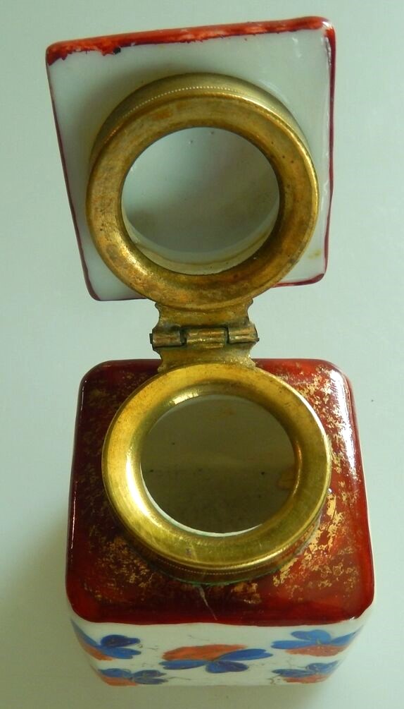 Porcelain inkwell with hand-painted flowers, hinged brass mounts, matching tapered square lid.
