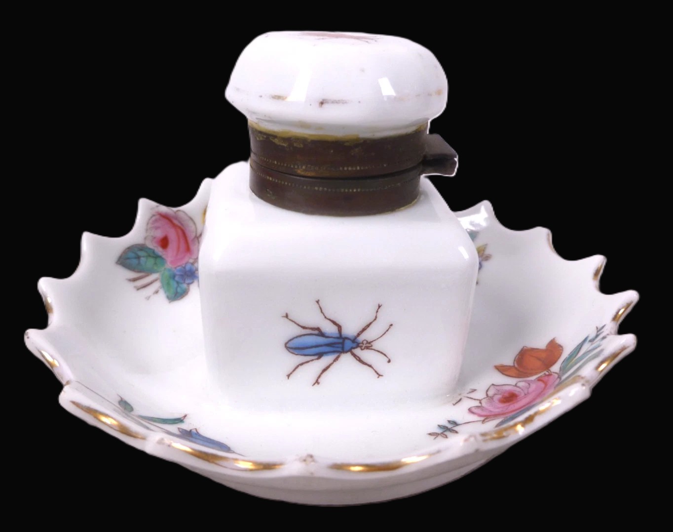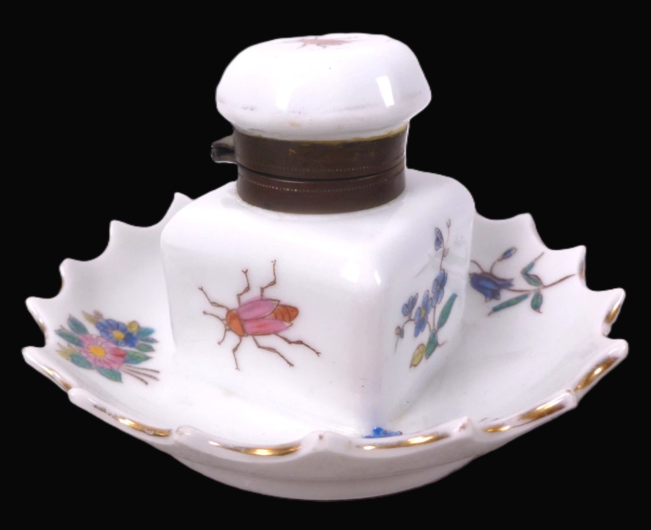 This is a charming porcelain inkwell, likely intended for a lady’s writing desk given its delicate size and whimsical “bug and blossom” theme.