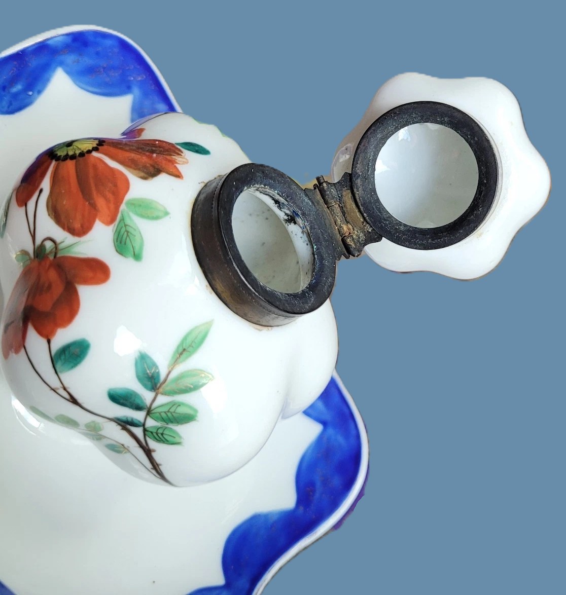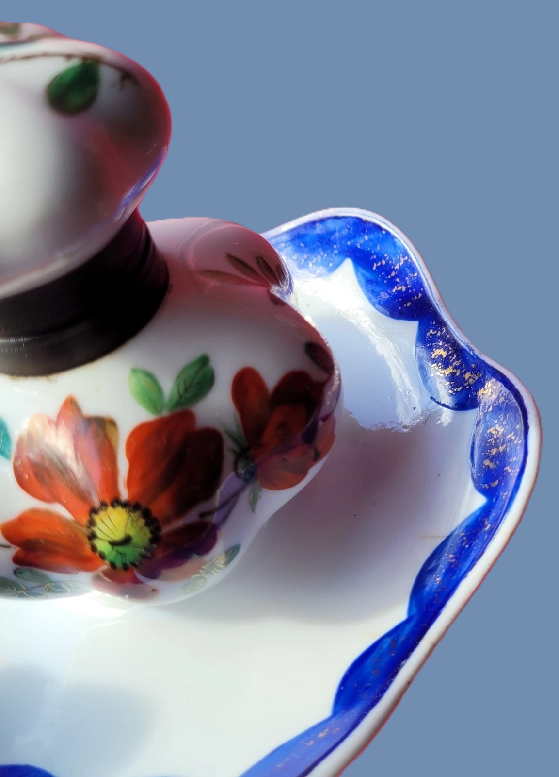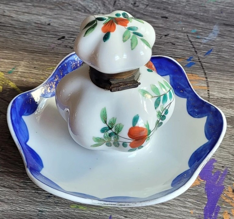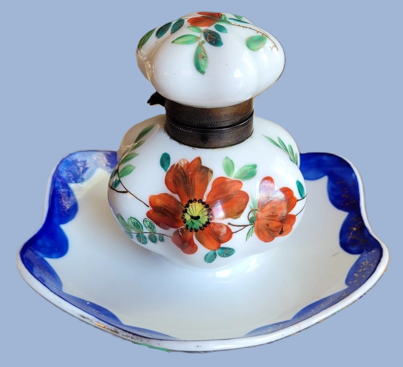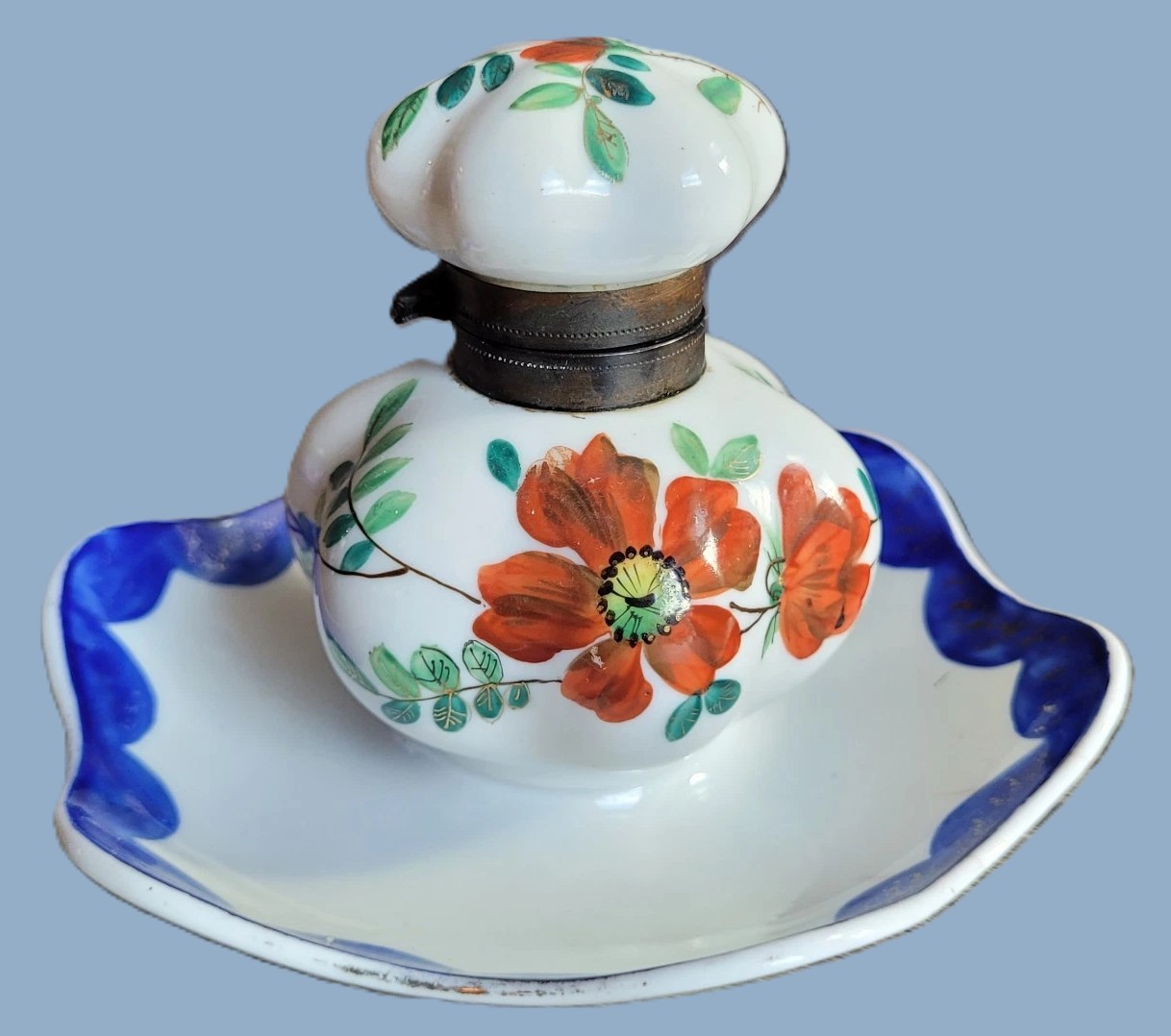 - Decoration: It is hand-painted with a vibrant orange poppy (or anemone) motif, accented by sage-green leaves and delicate gold-leaf highlights. The saucer and the lower rim of the inkwell feature a scalloped cobalt blue border, which was a popular decorative technique in the late 19th century.