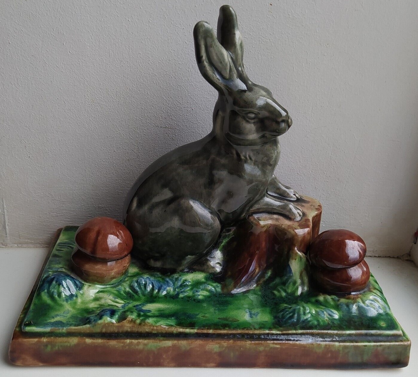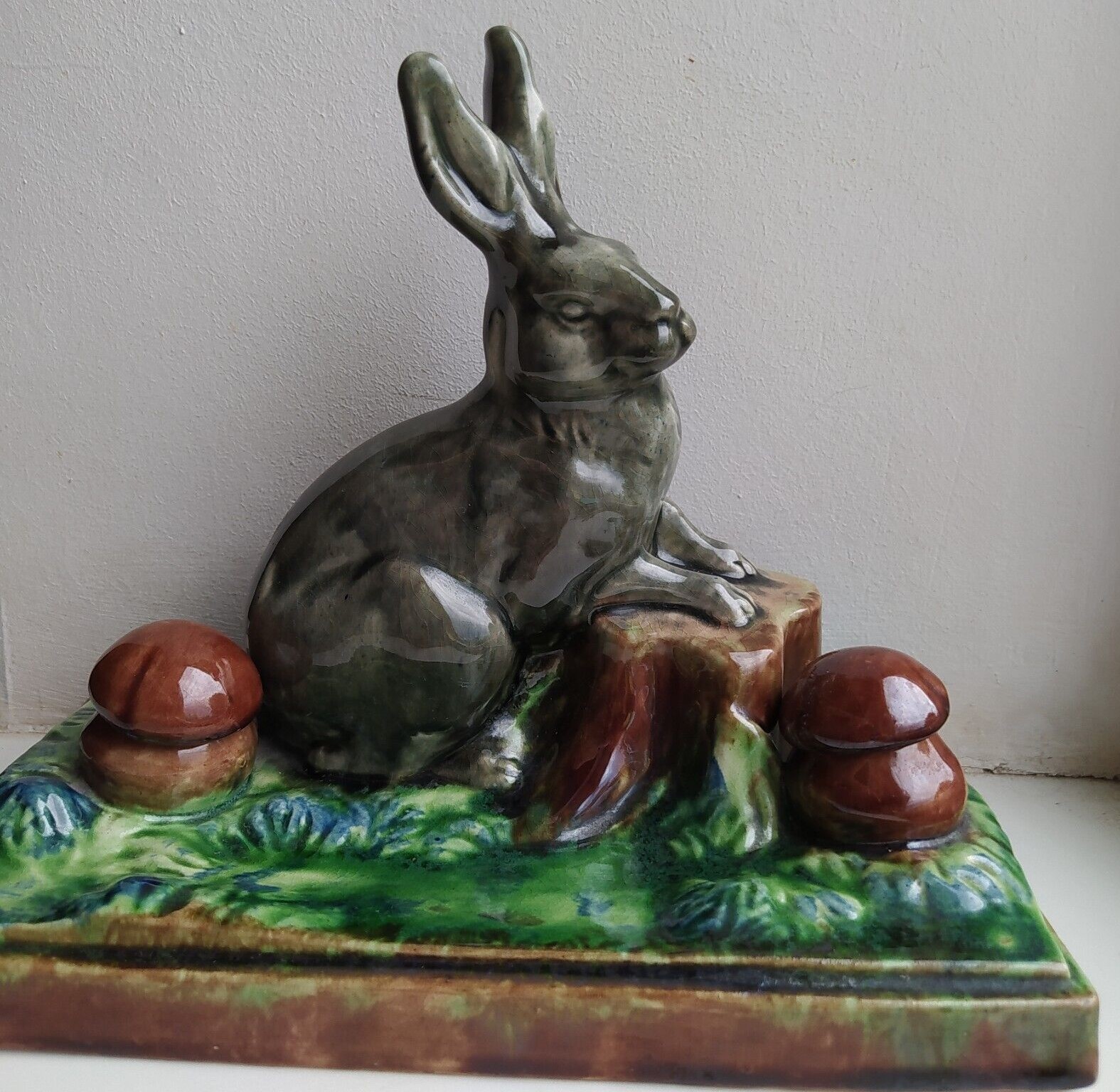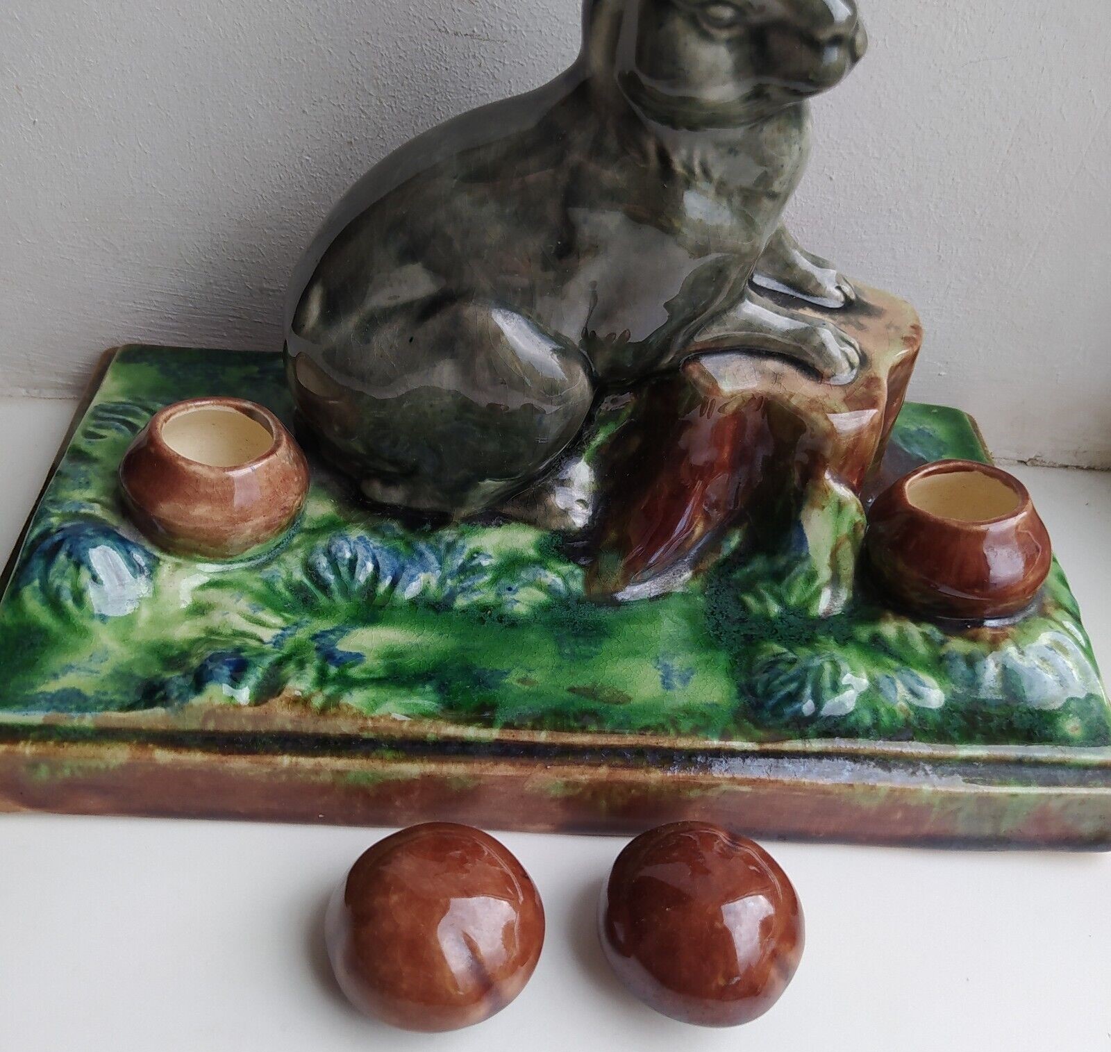 A porcelain inkstand with a rabbit (hare) sitting in the forest, front paws on a stump. In front of the rabbit are two mushrooms which are the inkwells. This piece was made in the 1930’s in Gzhel (then the Soviet Union) Russia.