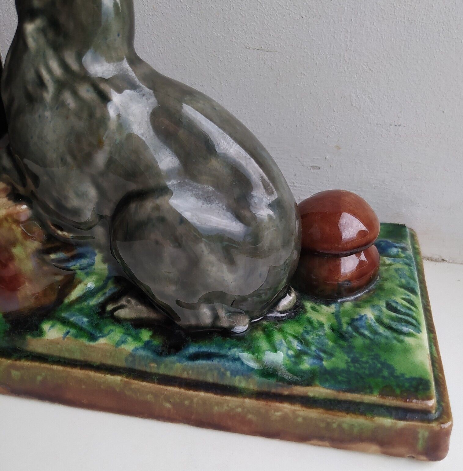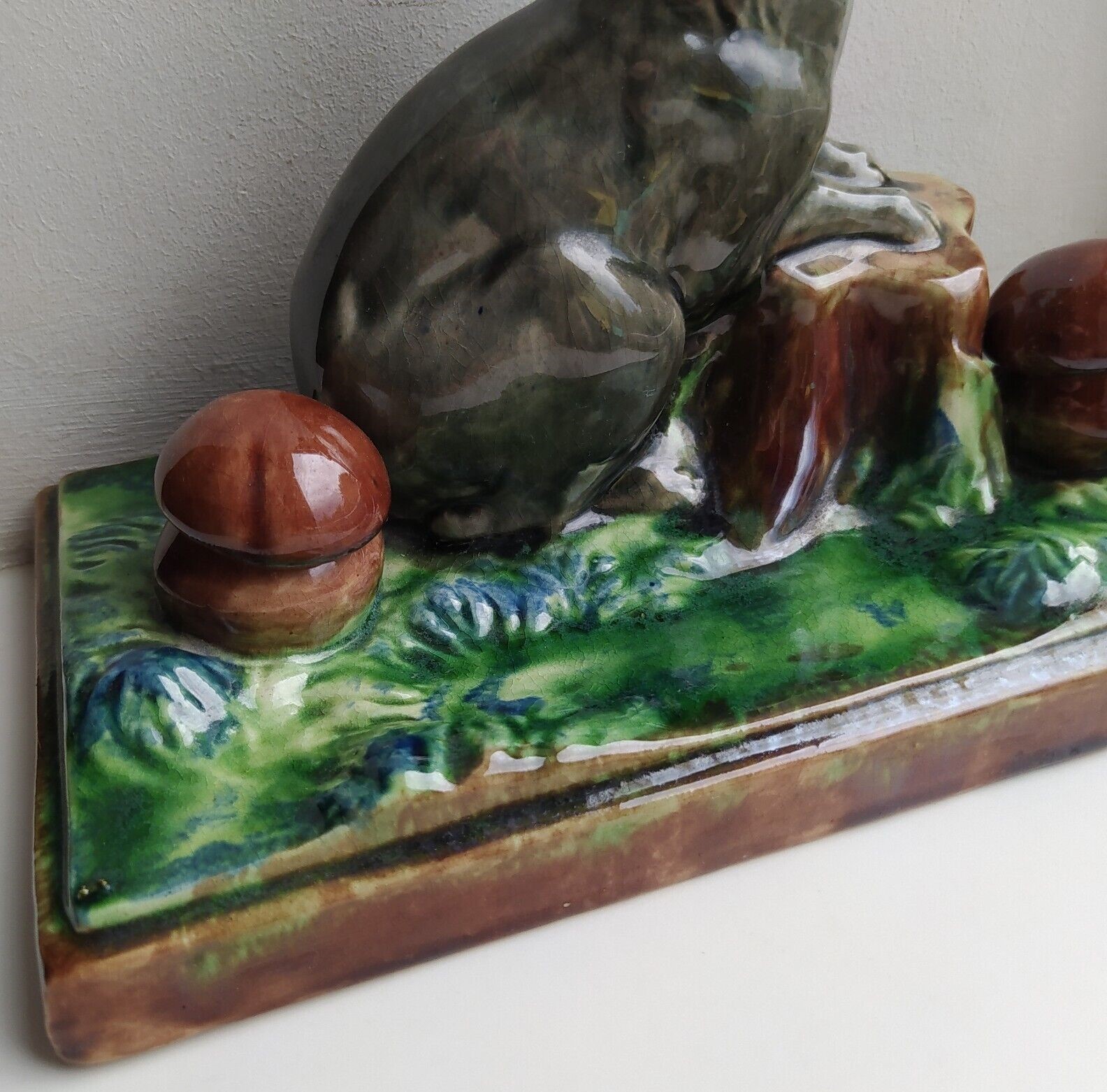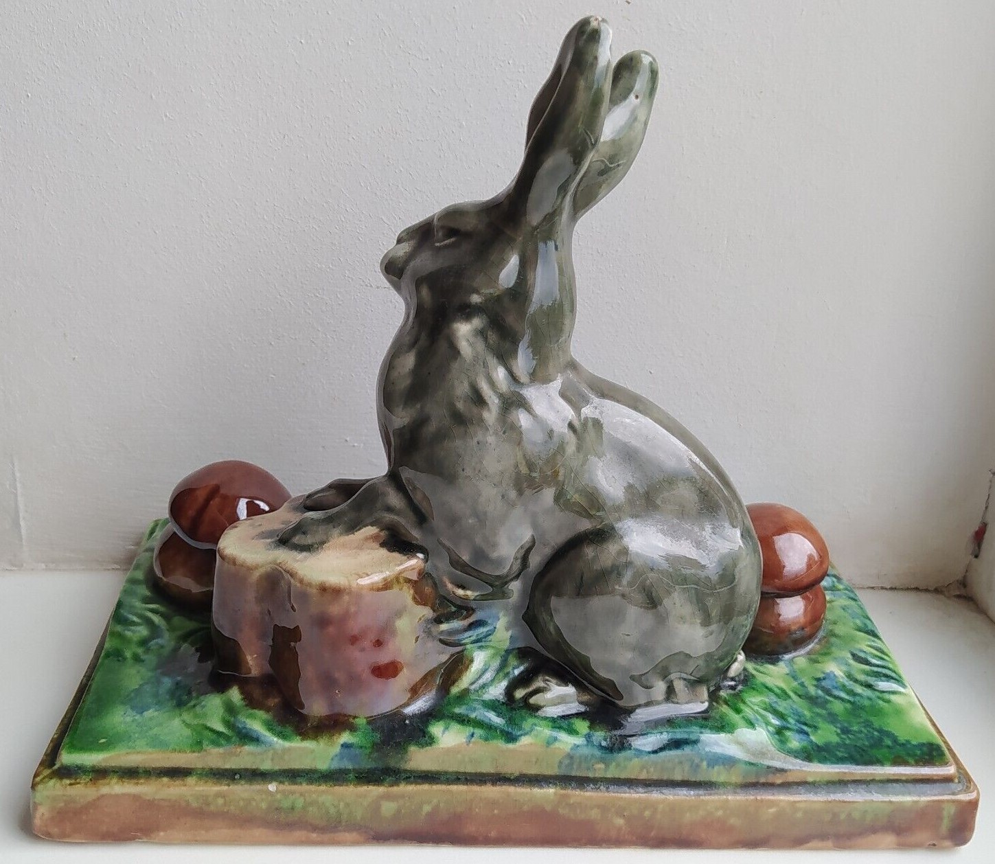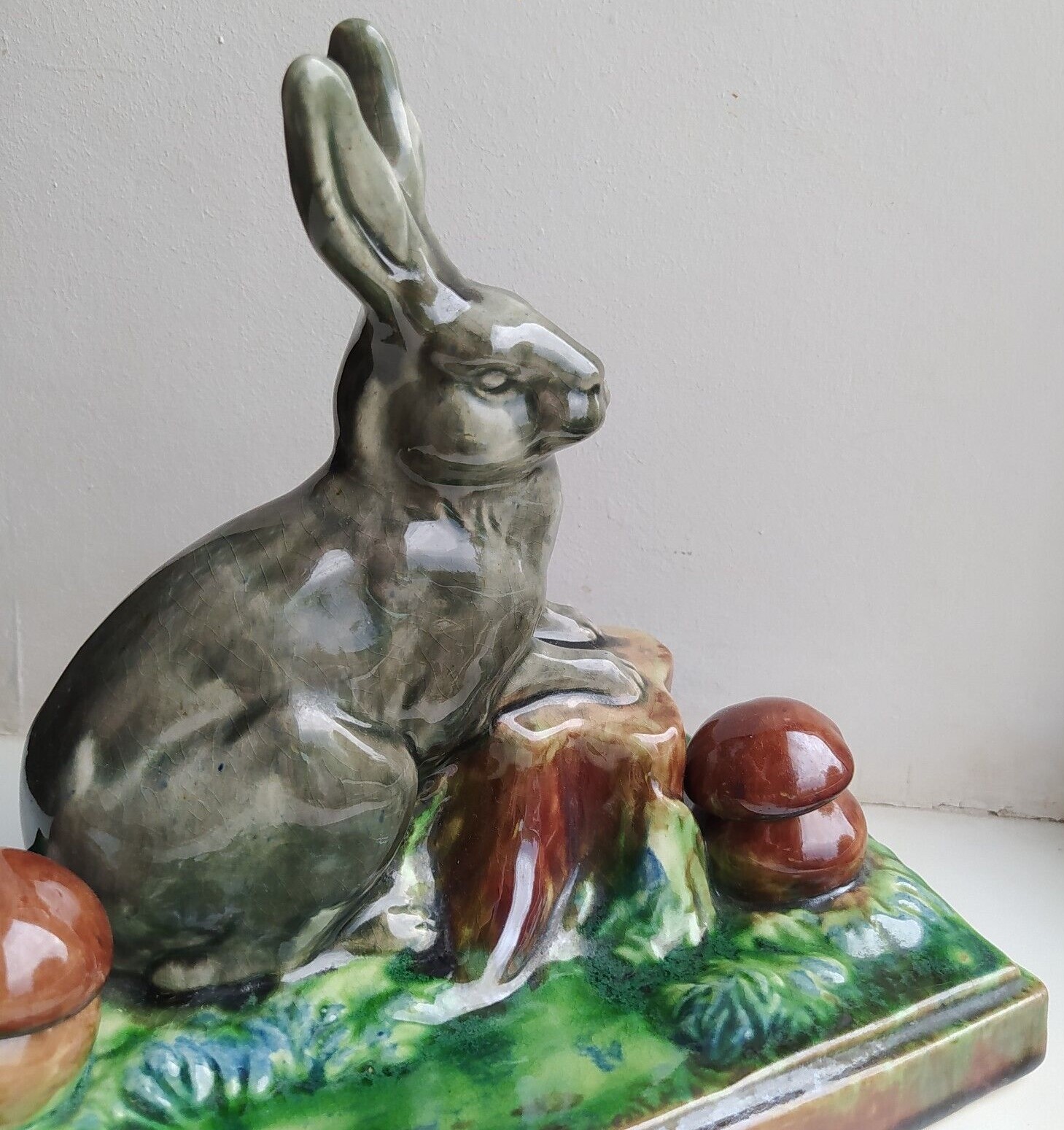 A porcelain inkstand with a rabbit (hare) sitting in the forest, front paws on a stump. In front of the rabbit are two mushrooms which are the inkwells. This piece was made in the 1930’s in Gzhel (then the Soviet Union) Russia.