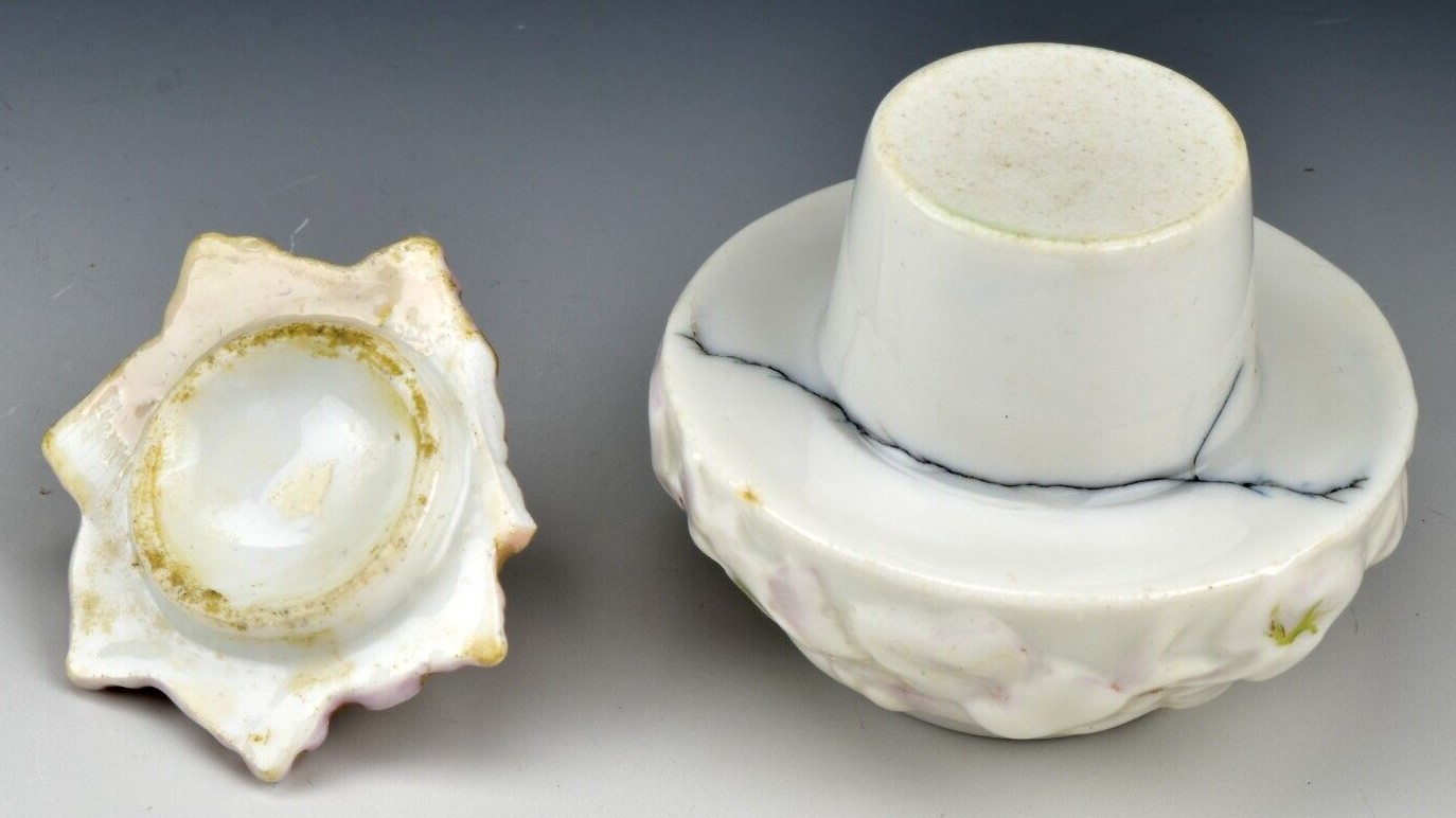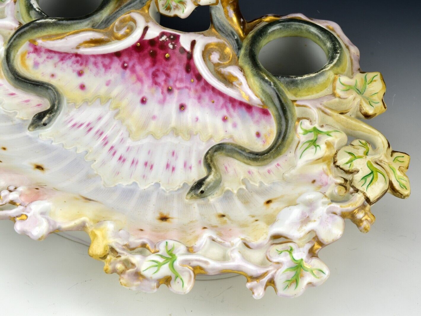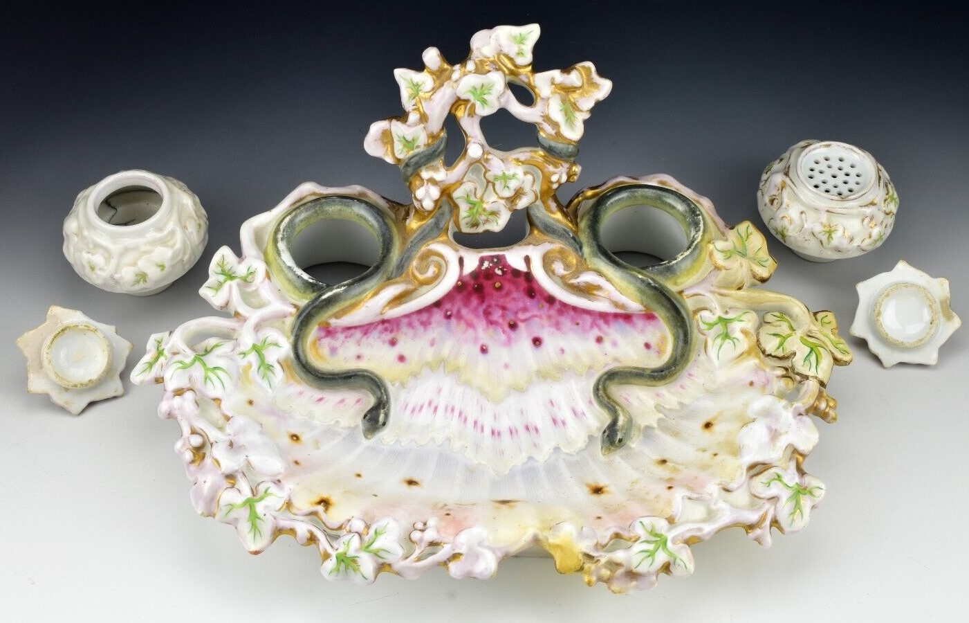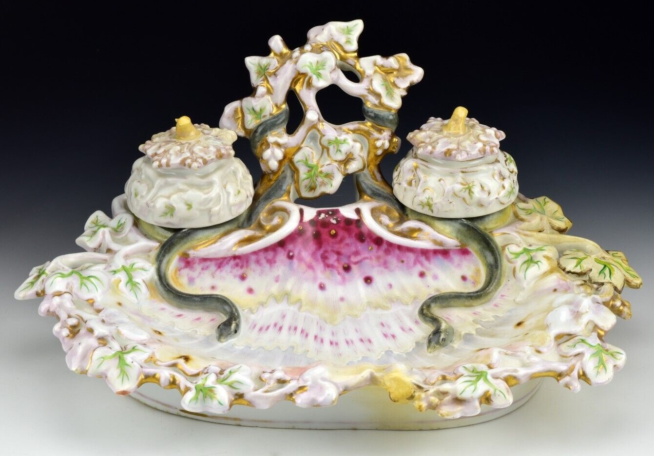 This rocaille Paris porcelain inkstand with a shell body, bordered with grapevines and leaves, and snakes slithering out from underneath the inkwell and sander, is unmarked but attributed to Jacob Petit.