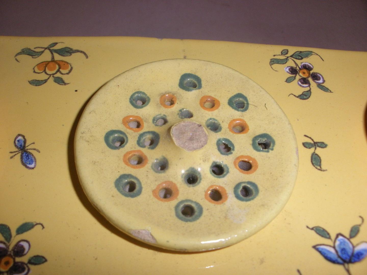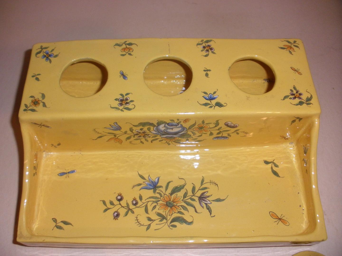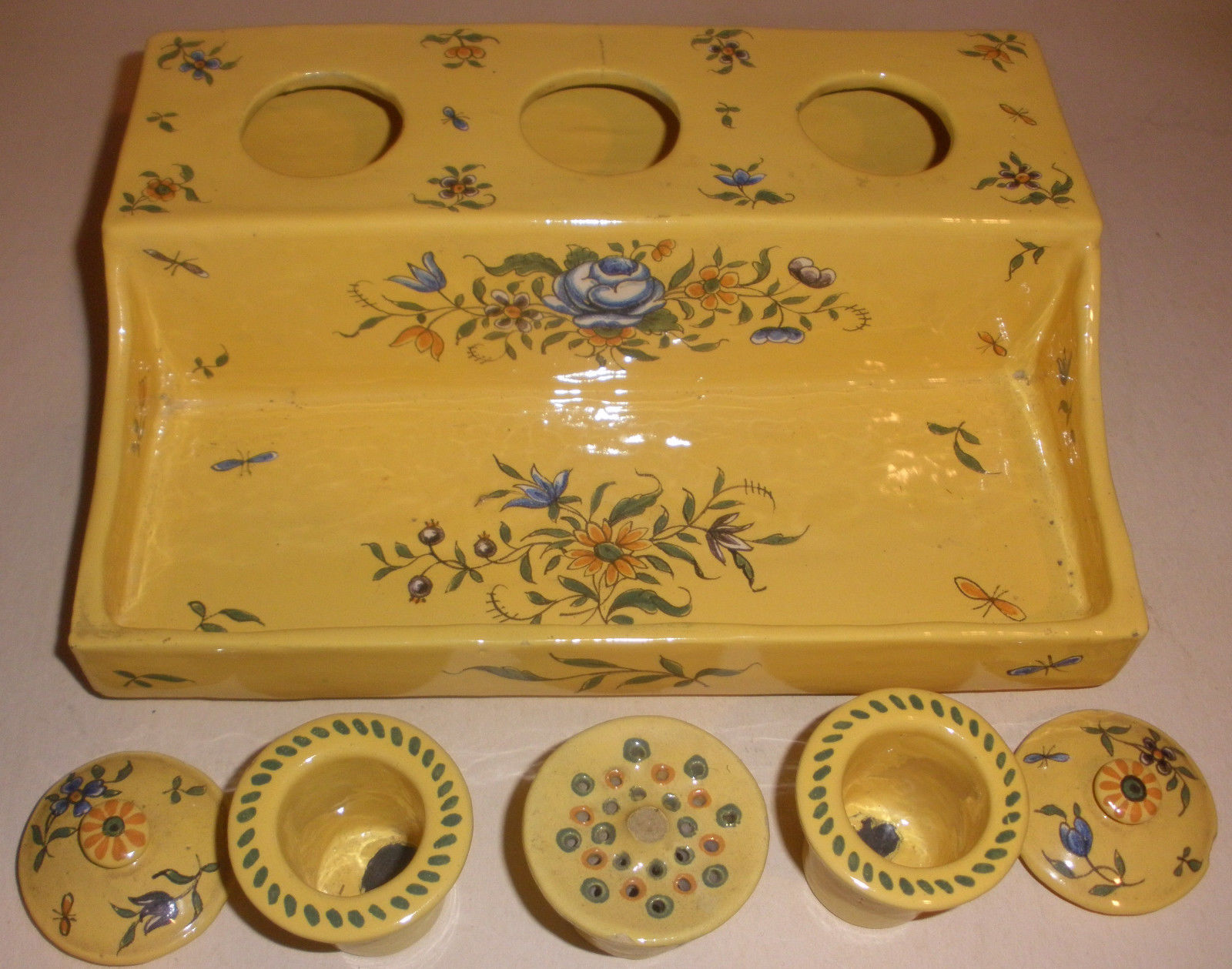 French faience with yellow glaze, rectangular with pen tray. Polychrome hand painted flowers and insects. Two inkwells and a sander (missing knob).