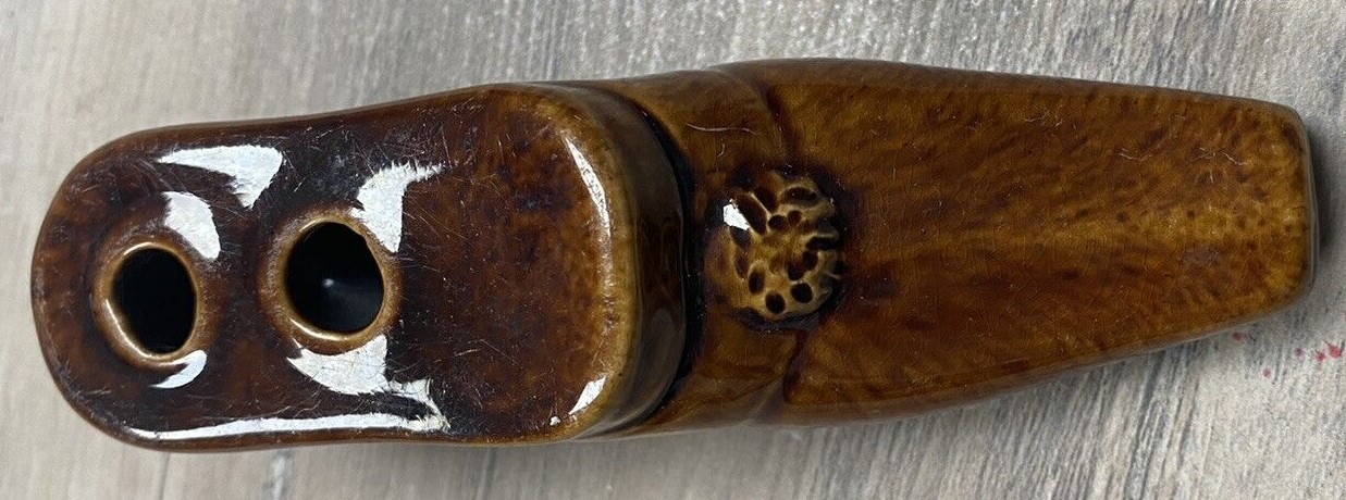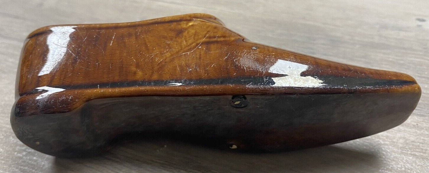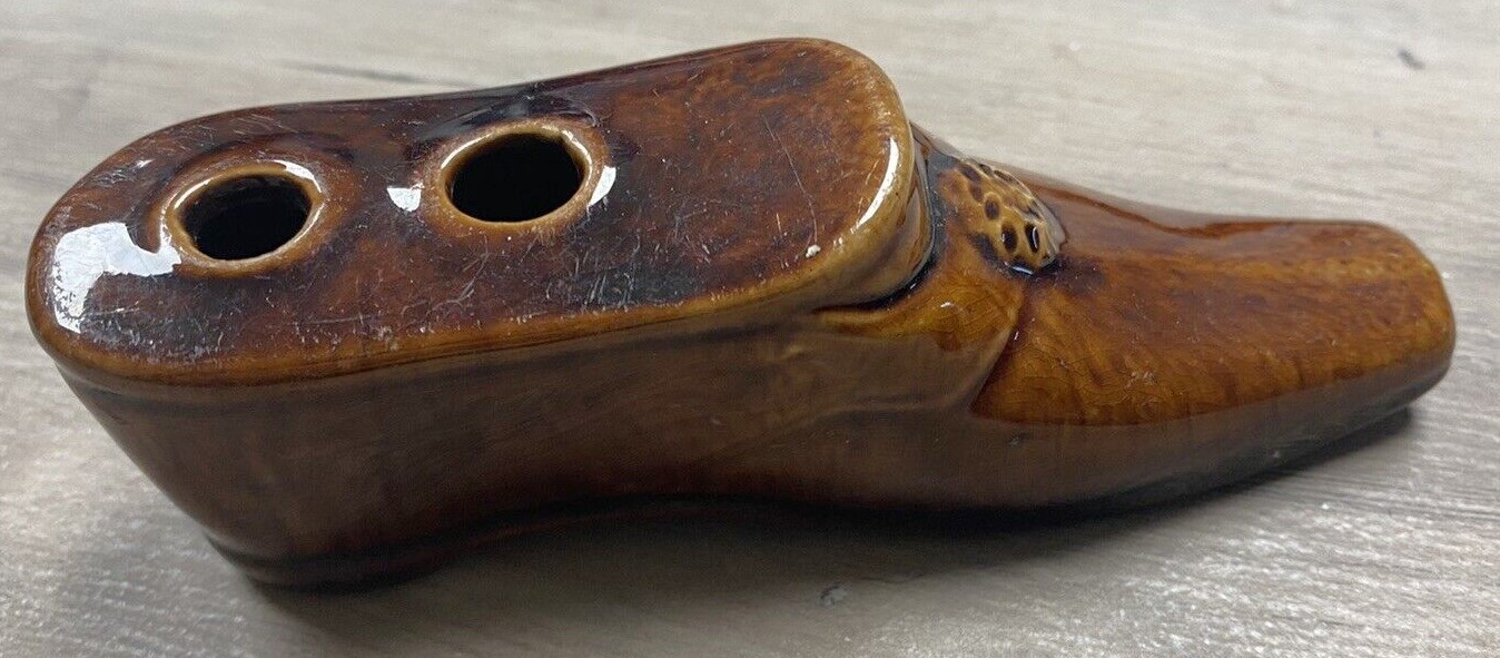 Rockingham brown glazed inkwell in the shape of a shoe. There are two holes in the top – one is for ink and the other is for a quill or pen.