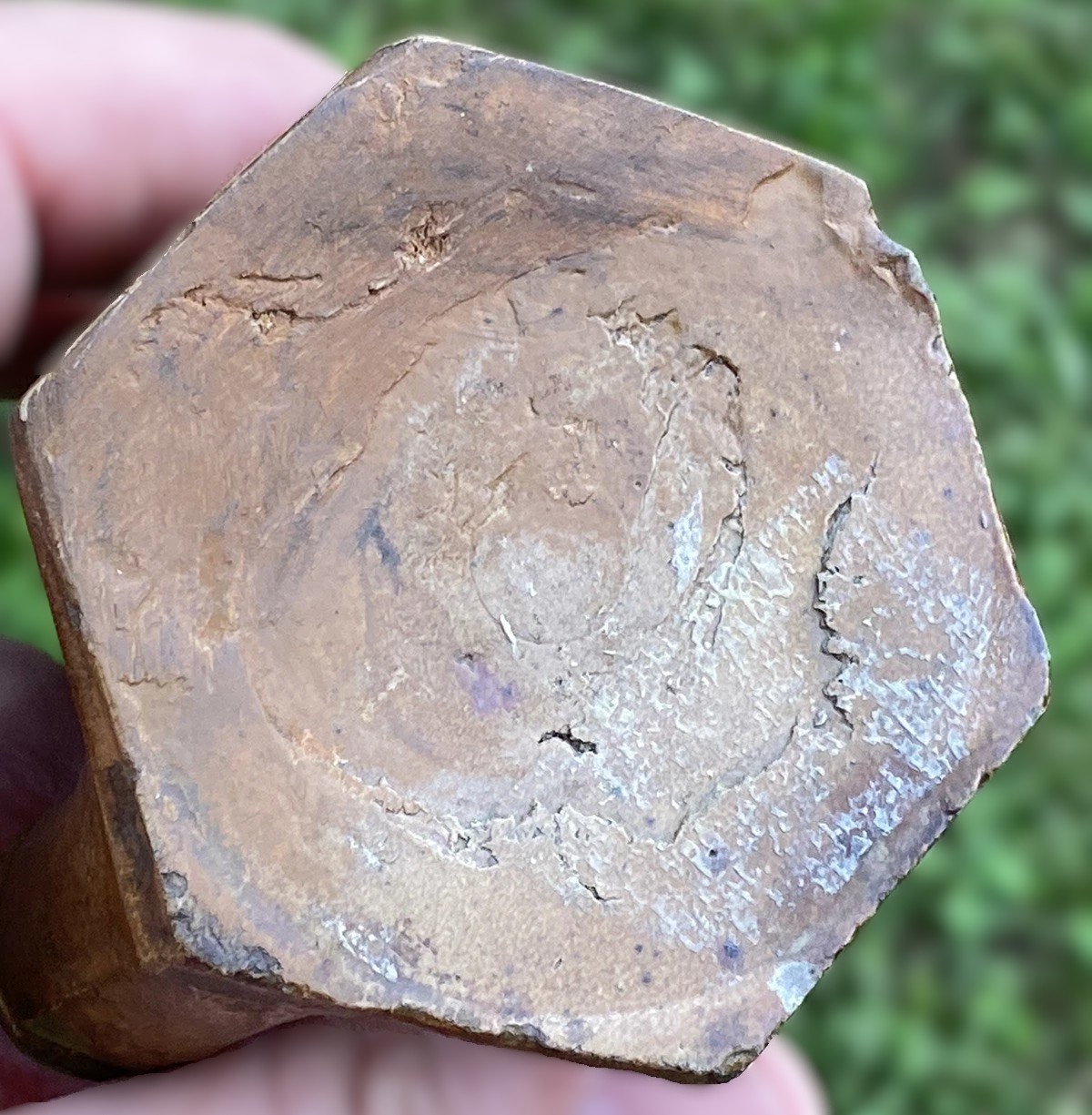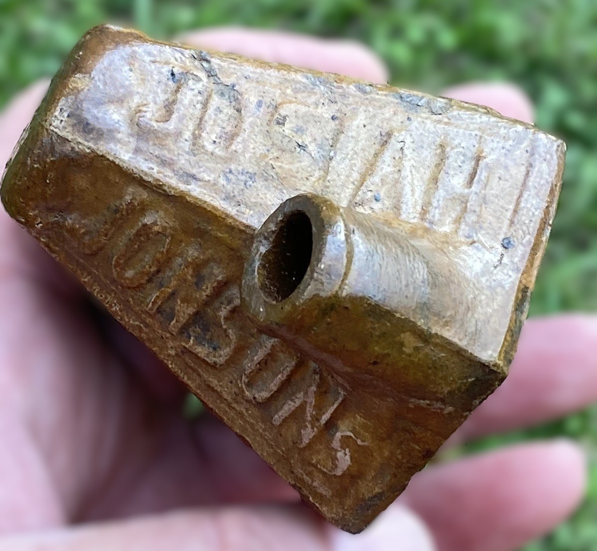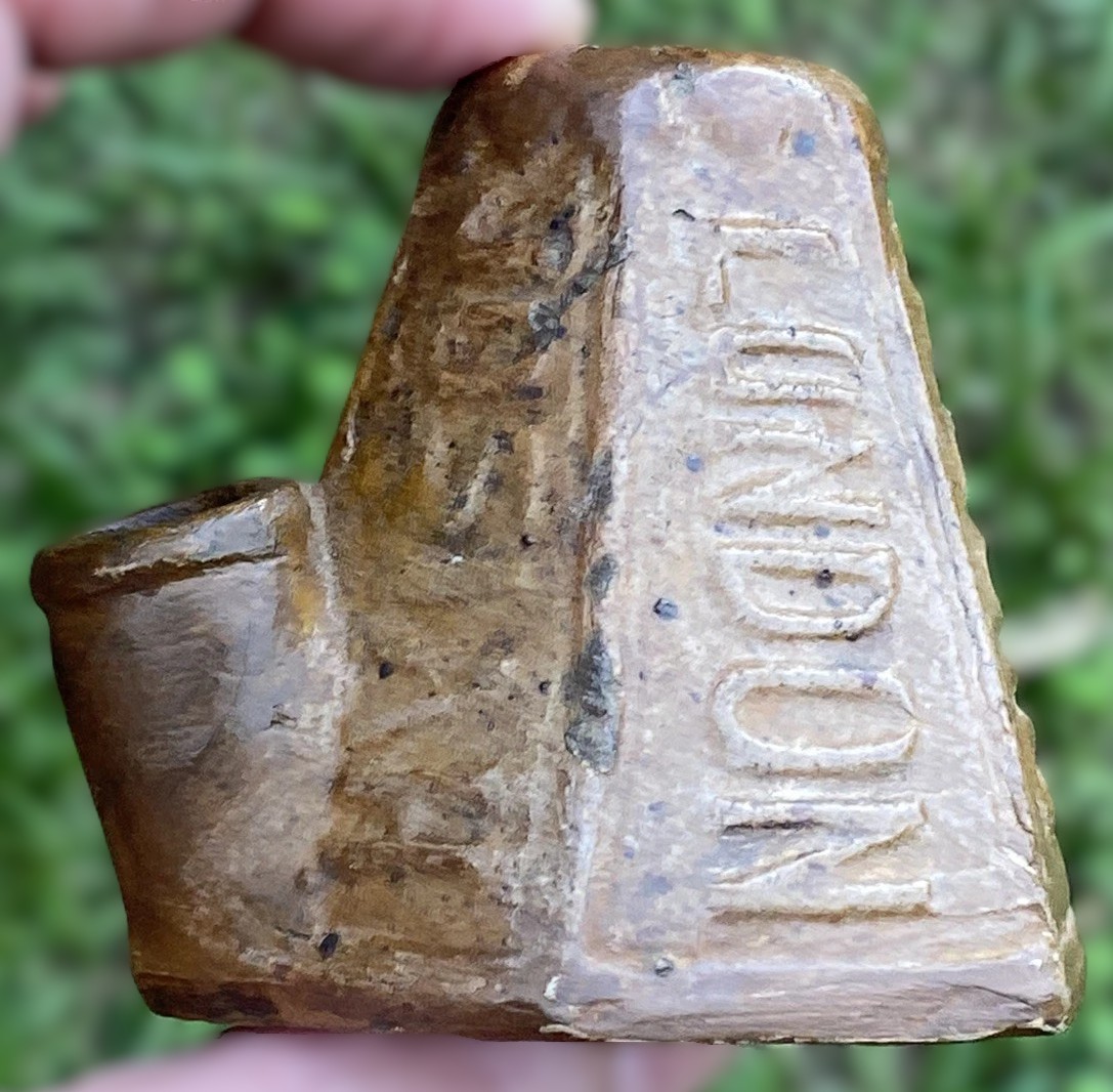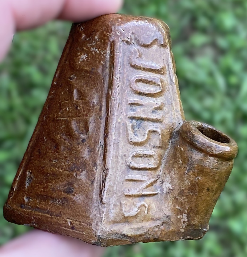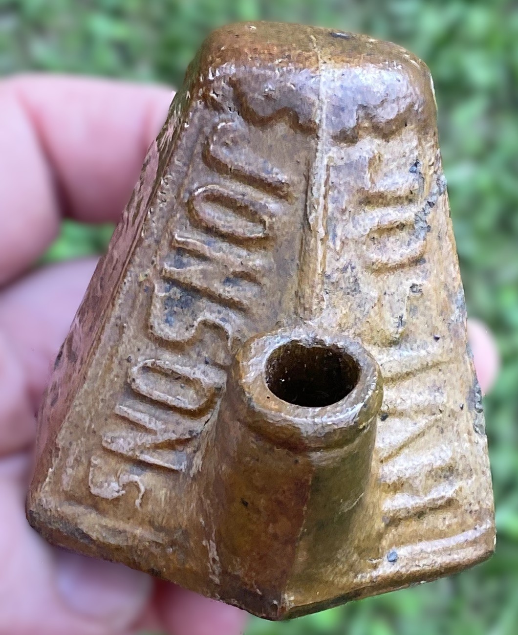 Salt glaze, six-sided teakettle ink bottle. Each panel is embossed with one word: “Josiah, Jonsons, Japan, Writing, Fluid, London”.