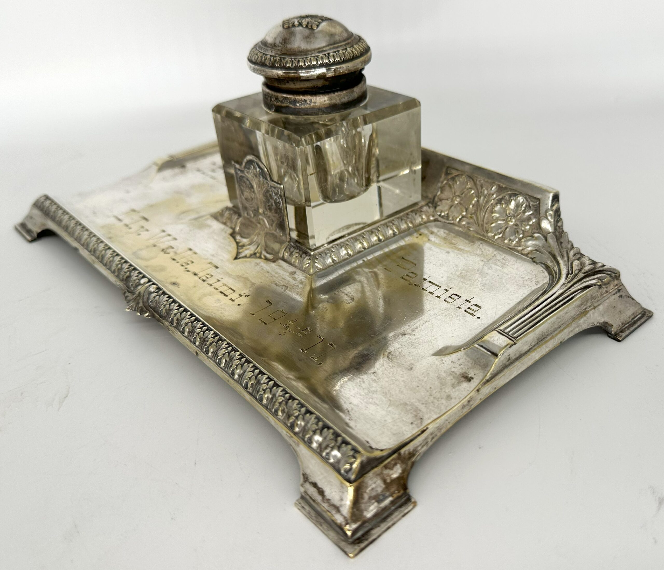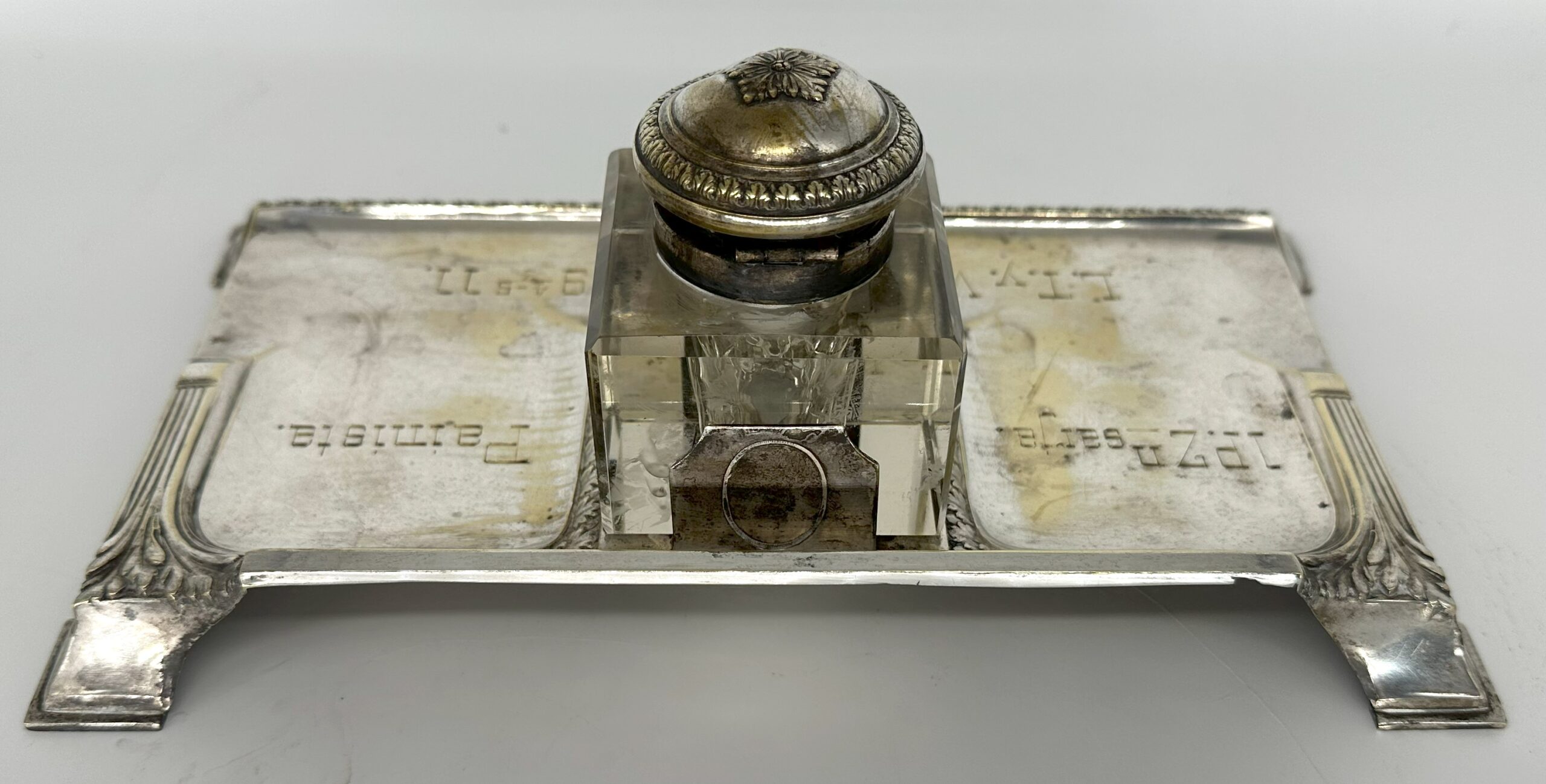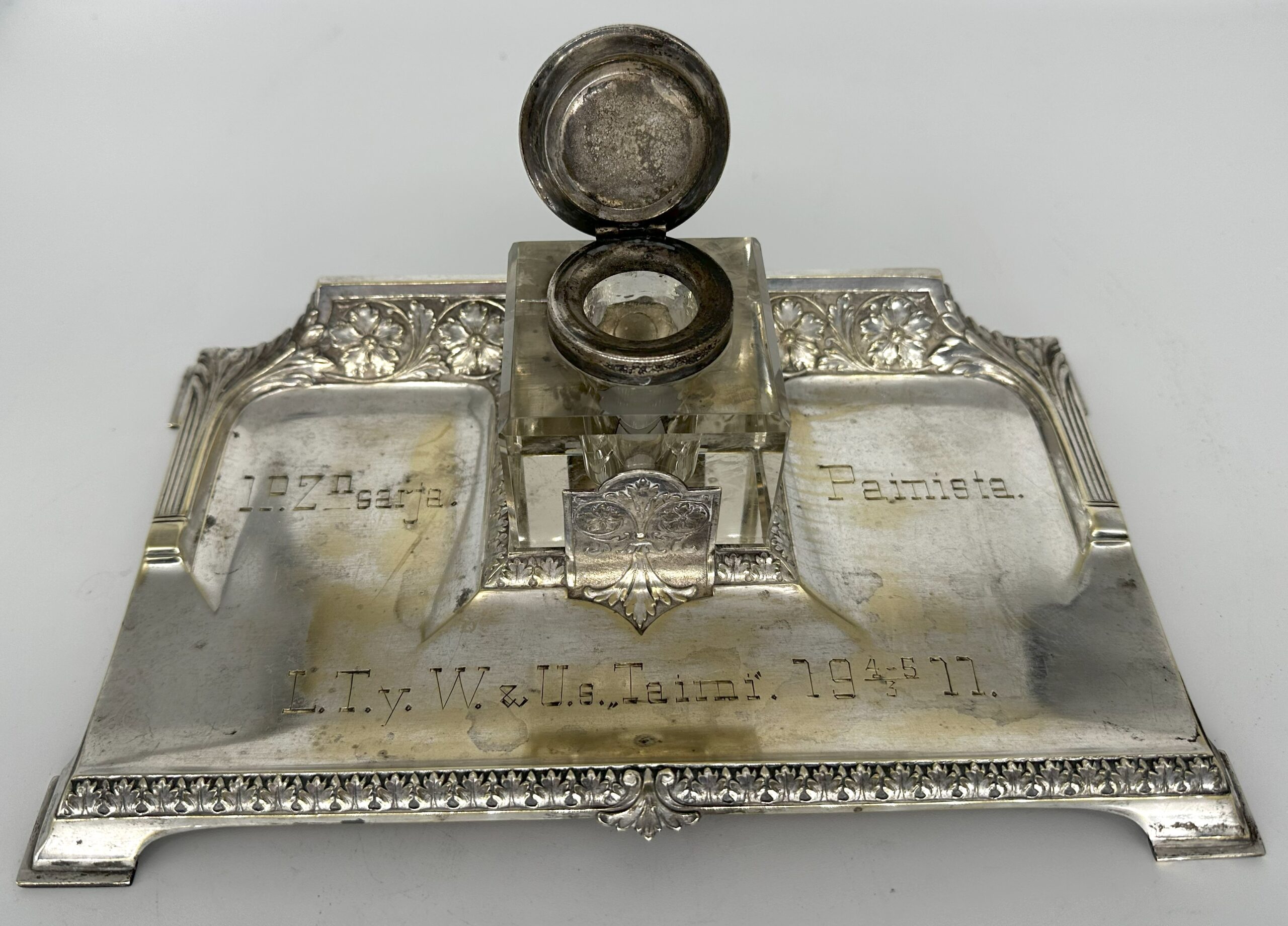 Large silverplate inkstand awarded to the 1st place finisher in wrestling dated 1911.