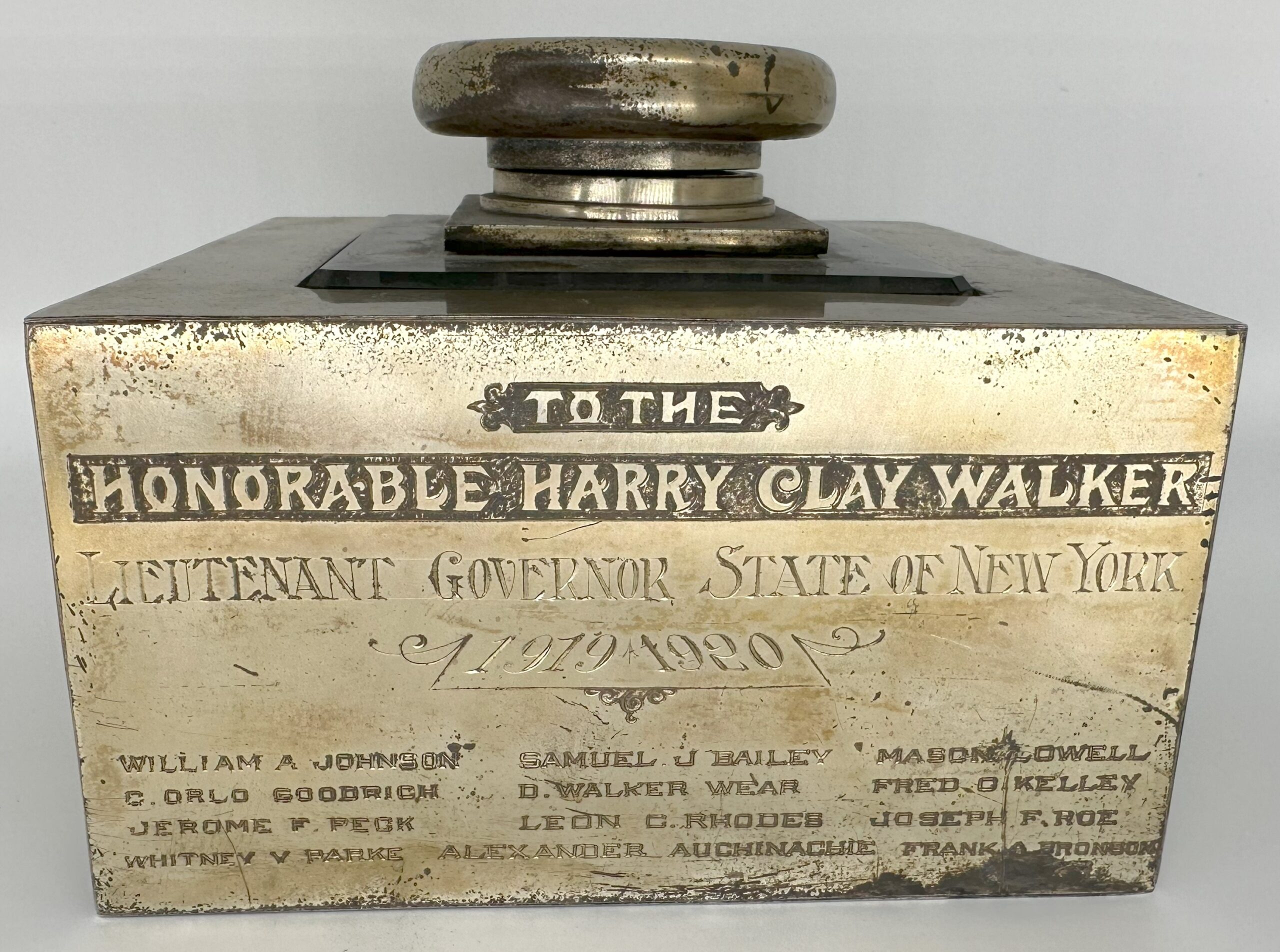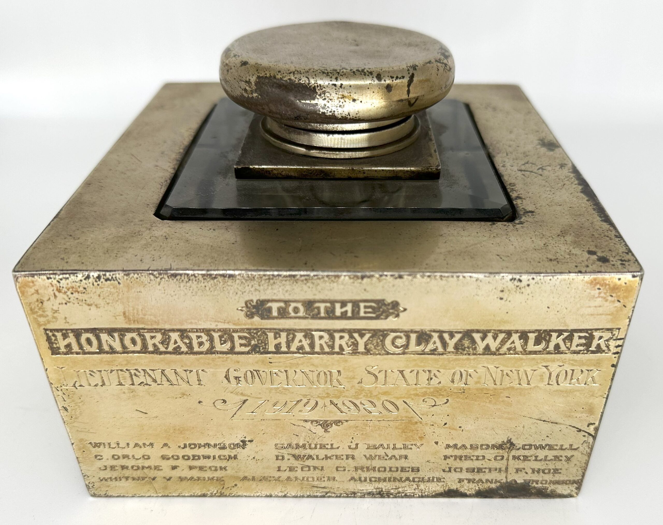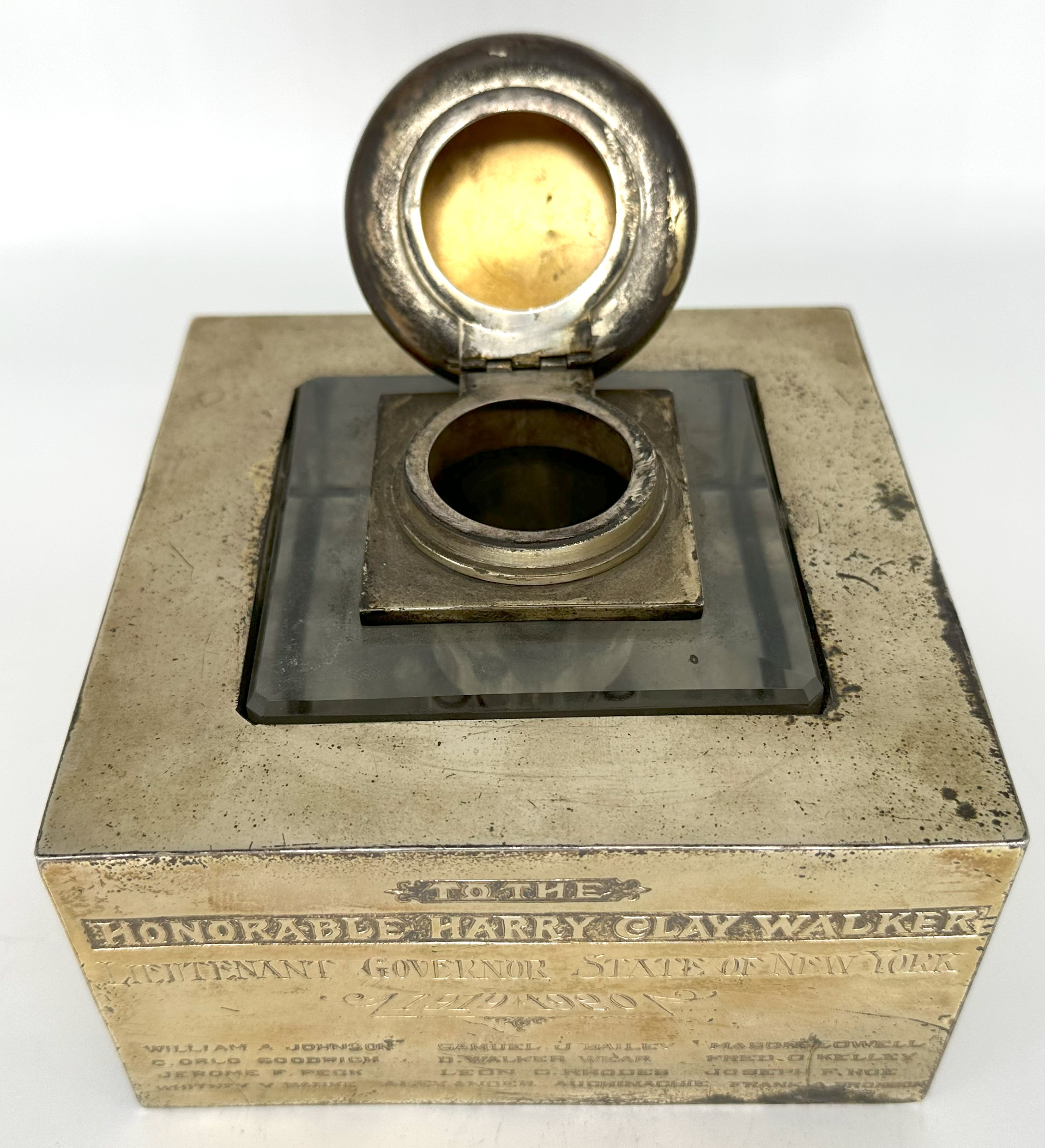 Antique silver and glass inkwell (square glass inkwell encased in a heavy silverplated base) with an inscription that reads “To the Honorable Harry Clay Walker, Lieutenant governor state of New York, 1919-1920.” Names of the signators are inscribed below the inscription. Intriguing piece of history, the piece weighs about 9 lbs.