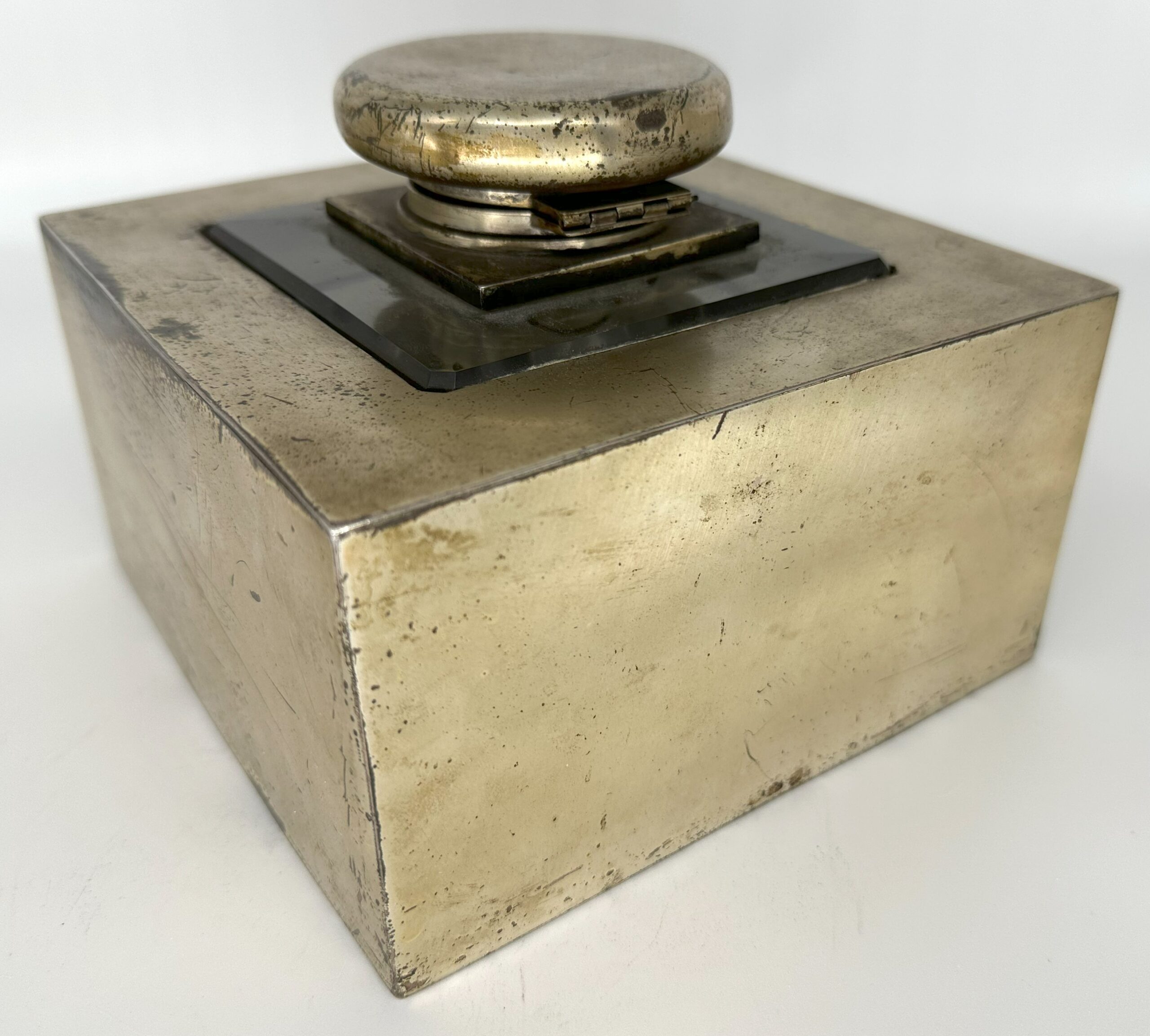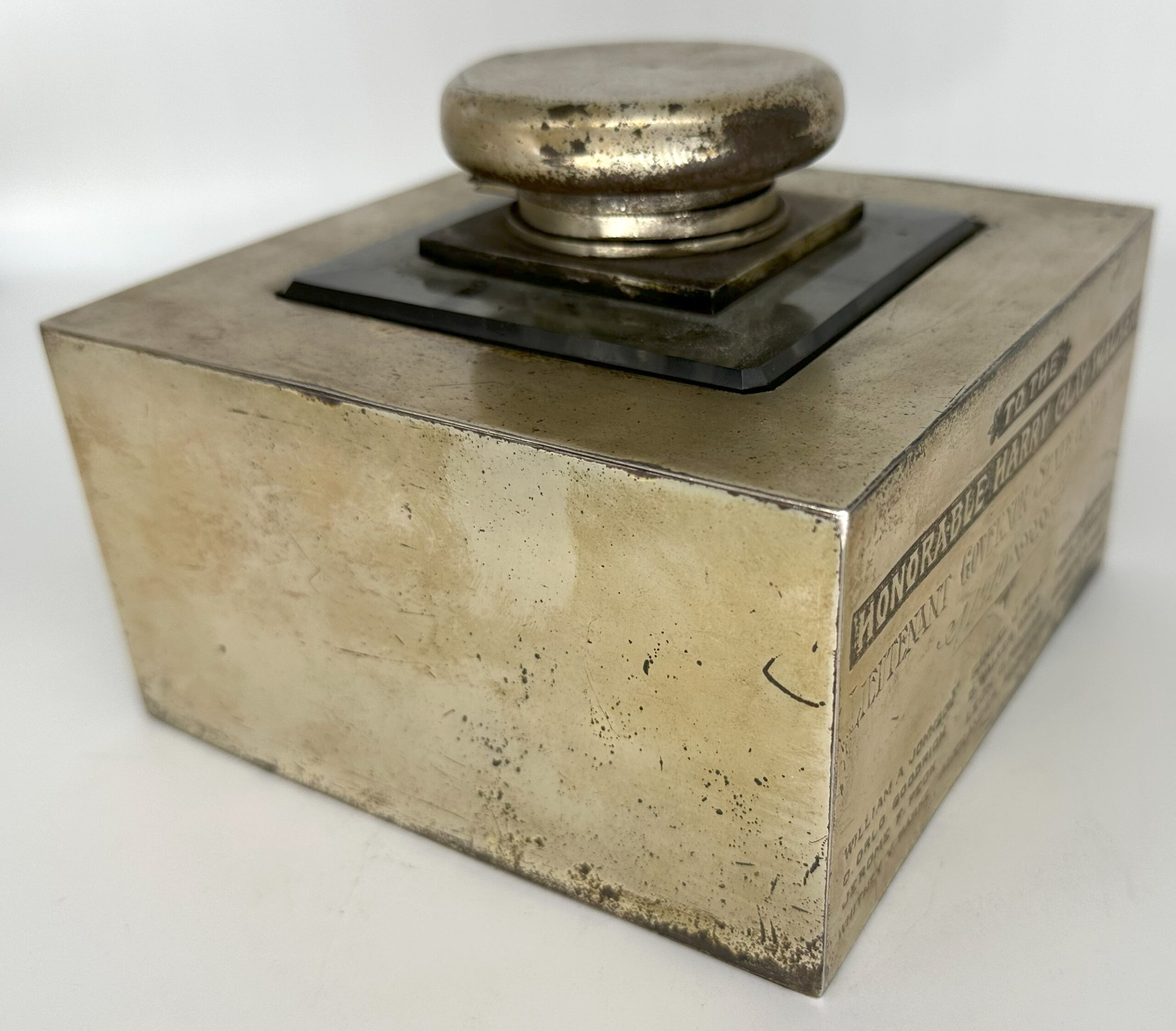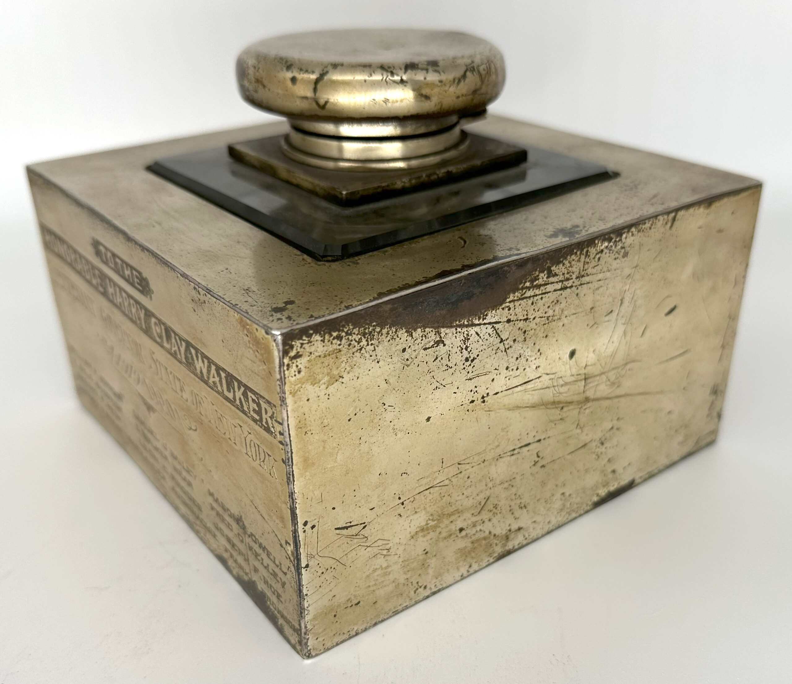 Antique silver and glass inkwell (square glass inkwell encased in a heavy silverplated base) with an inscription that reads “To the Honorable Harry Clay Walker, Lieutenant governor state of New York, 1919-1920.” Names of the signators are inscribed below the inscription. Intriguing piece of history, the piece weighs about 9 lbs.