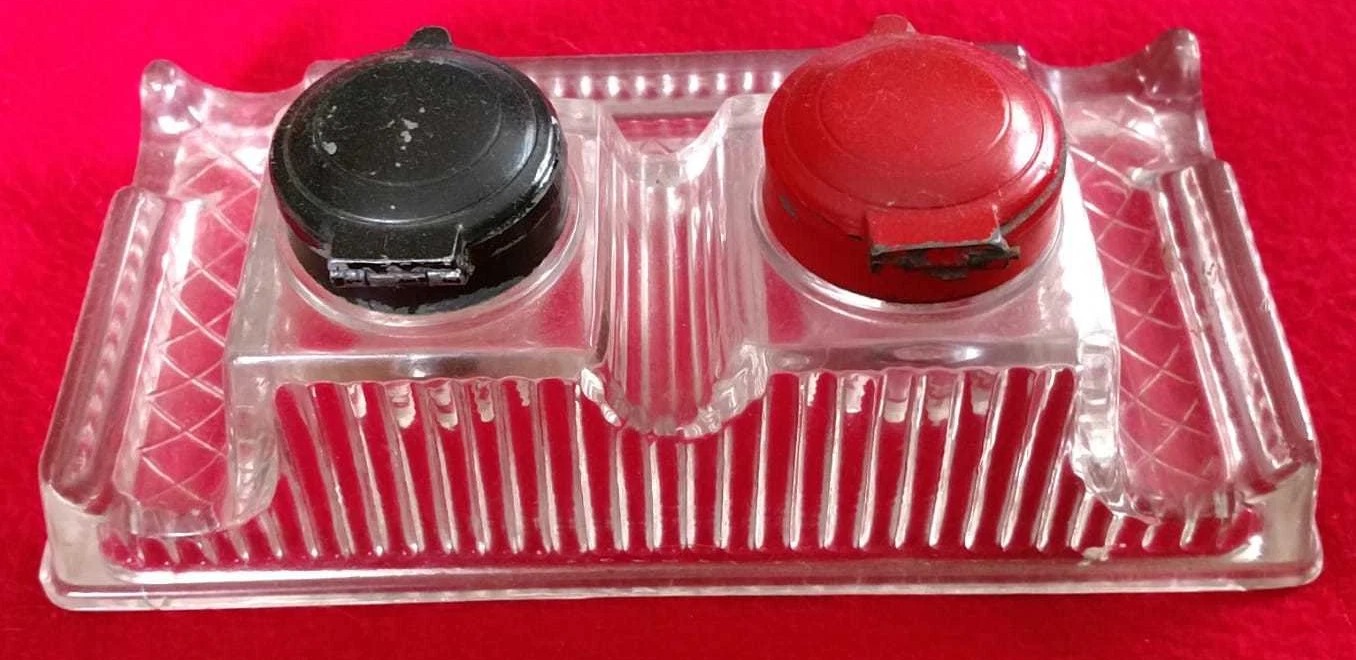 This double inkstand is made of clear pressed glass. The base is rectangular, with two wells to hold the ink. The inkstand is made to hold a pens with its semi-circular grooves on the sides and in front.