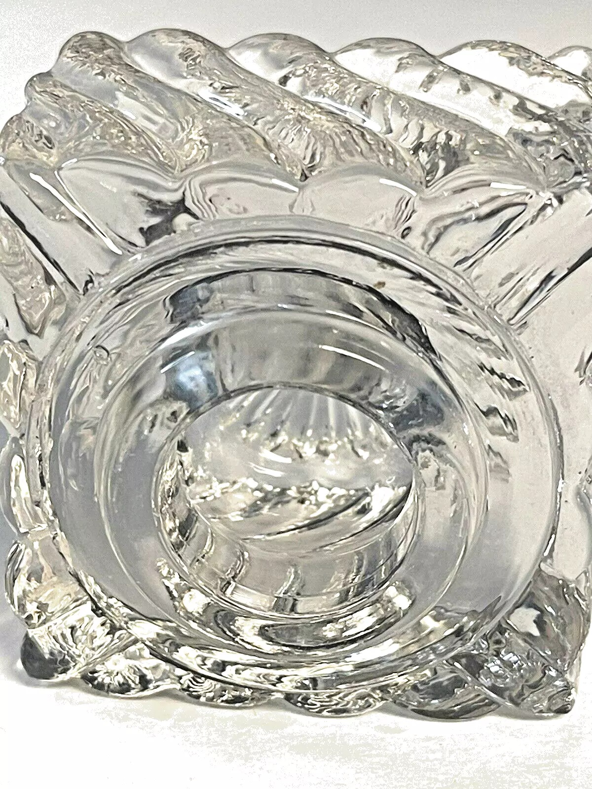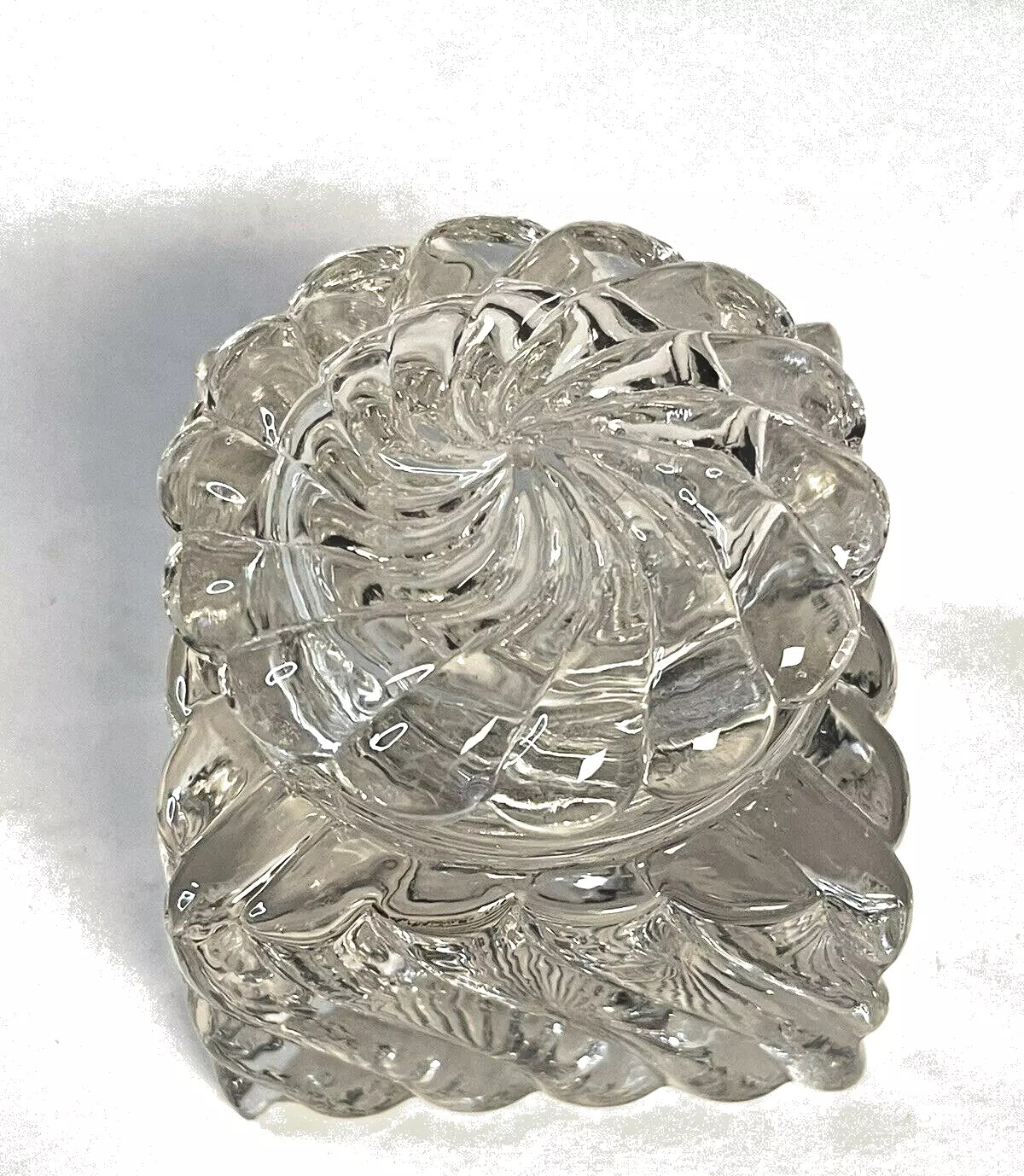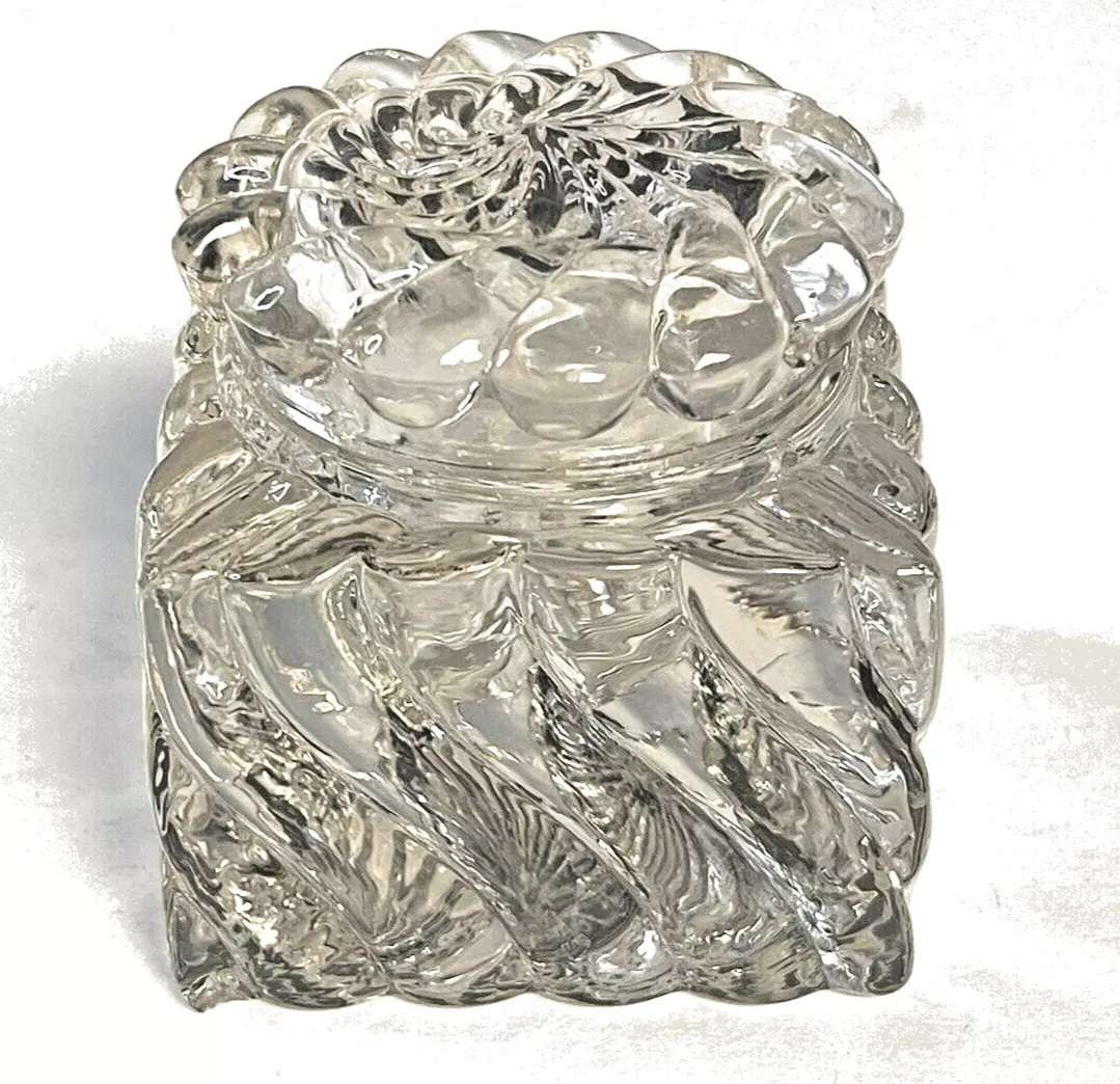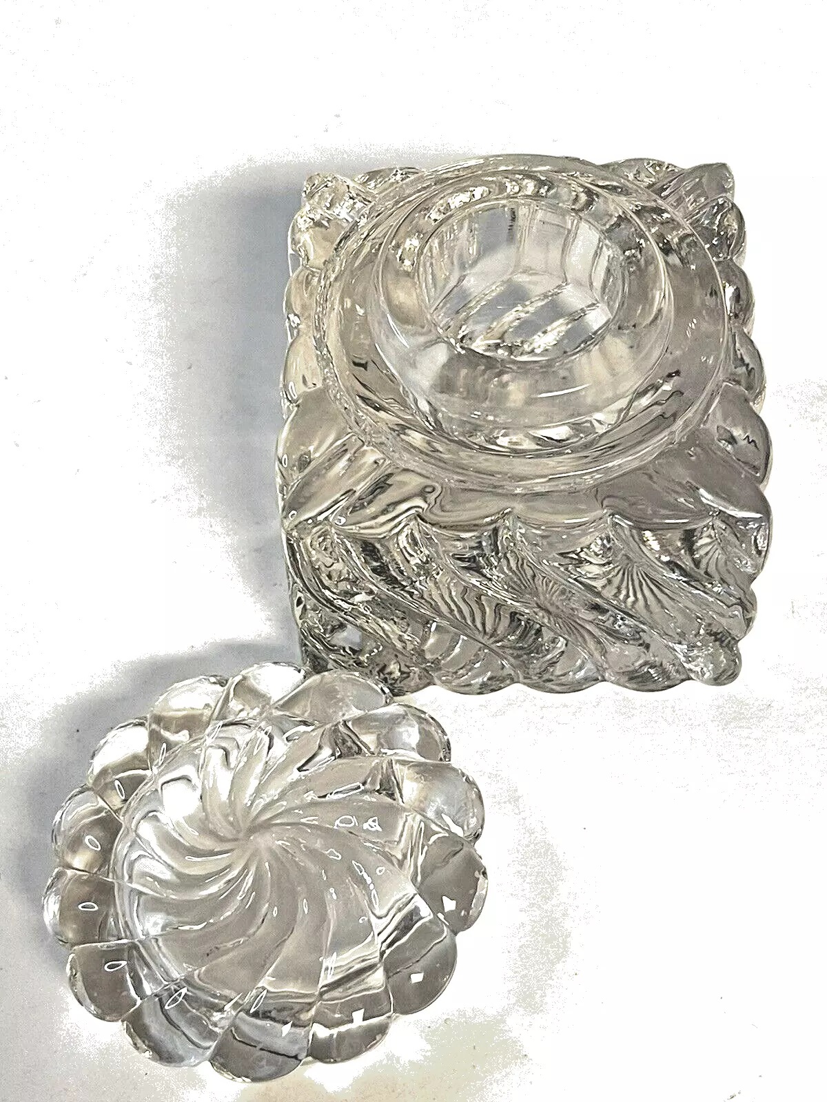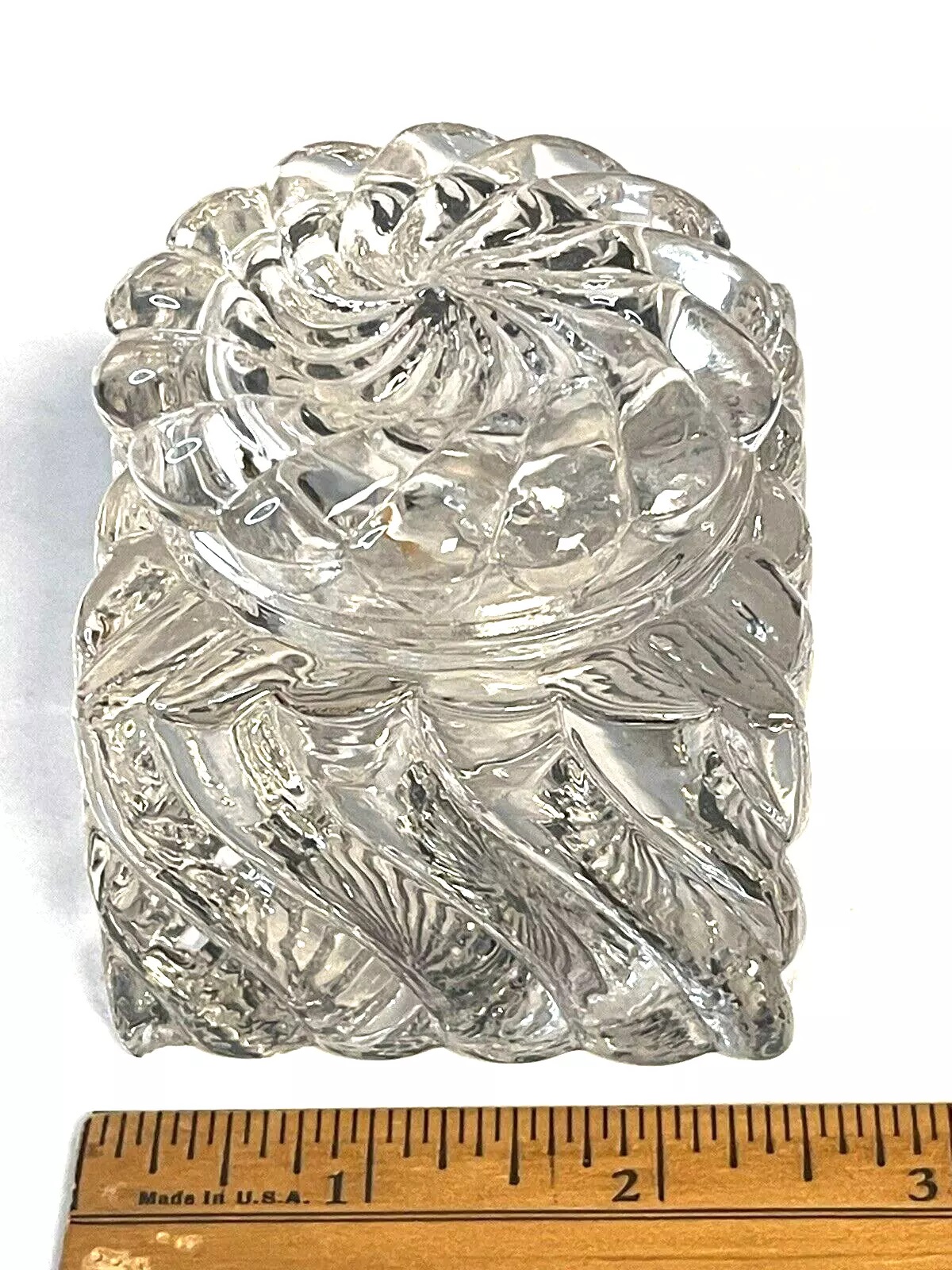 A pressed glass inkwell in a swirl design with a separate matching cover.