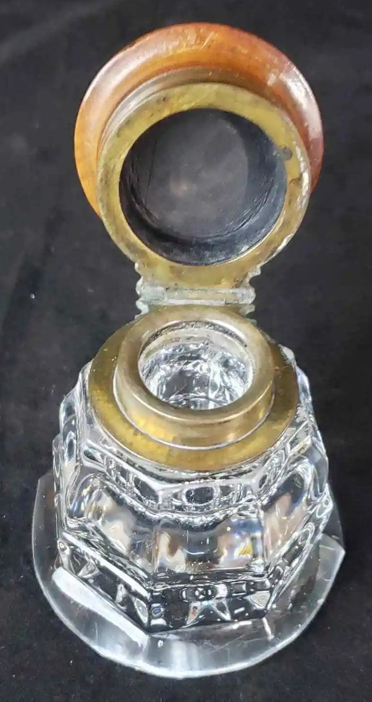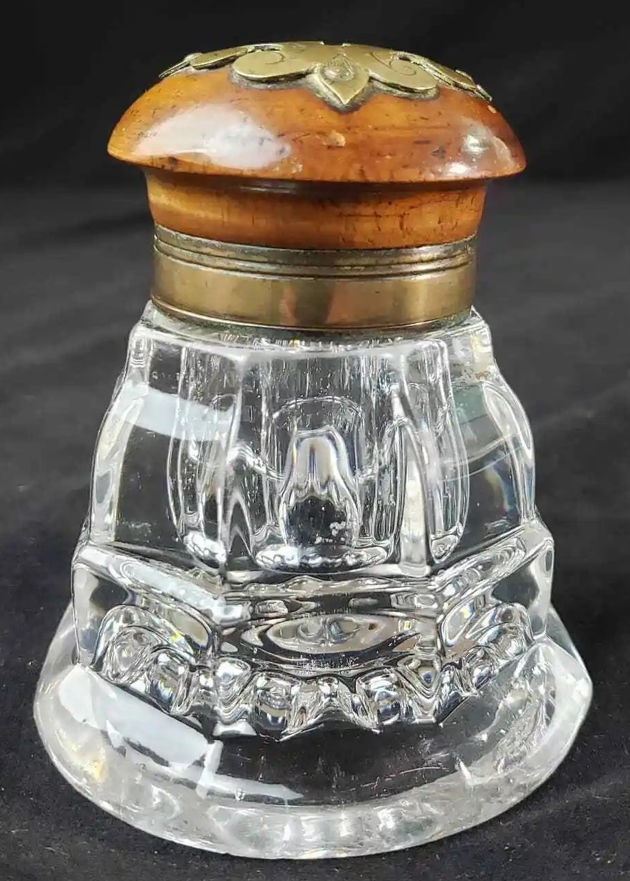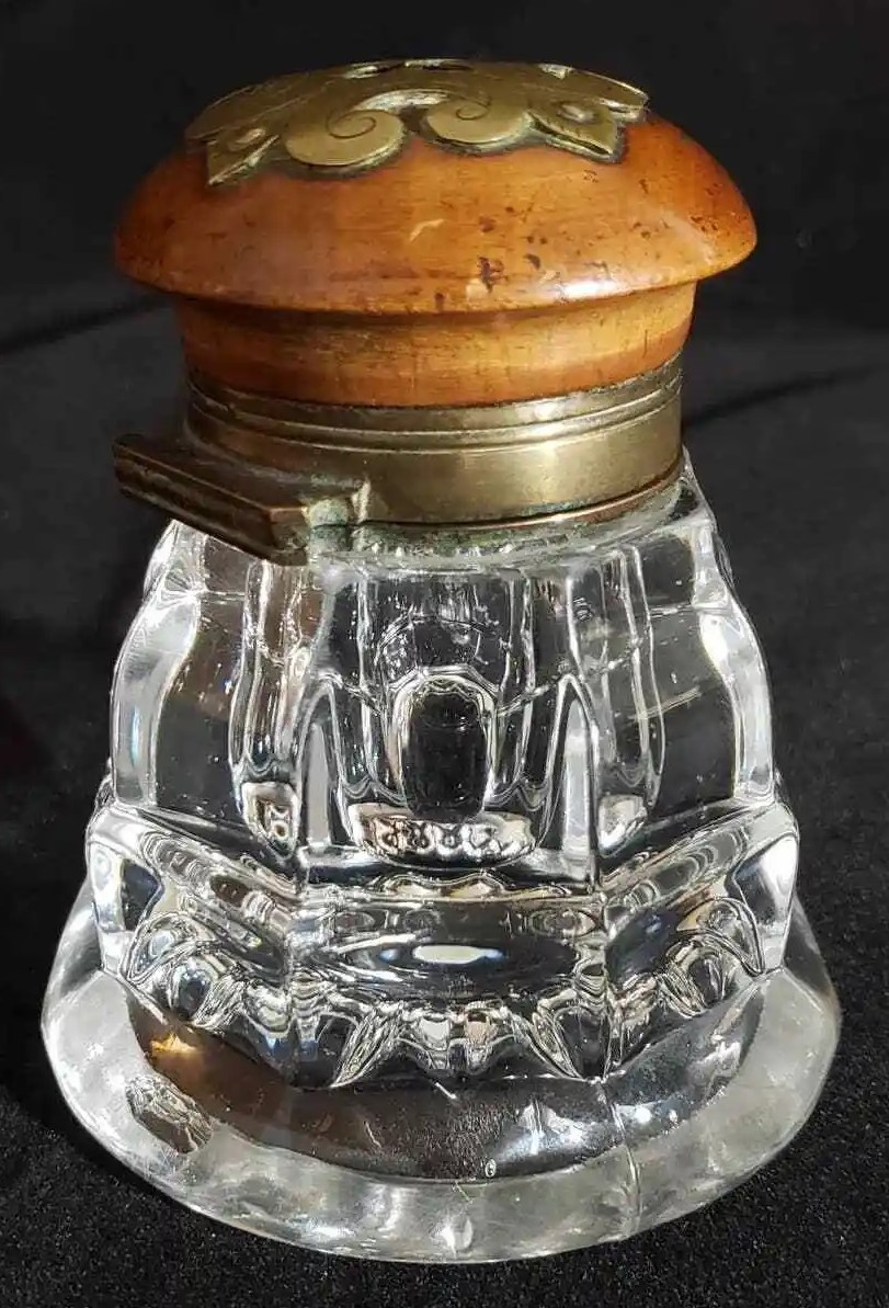 Pressed Glass Inkwell with Wood and Brass Lid