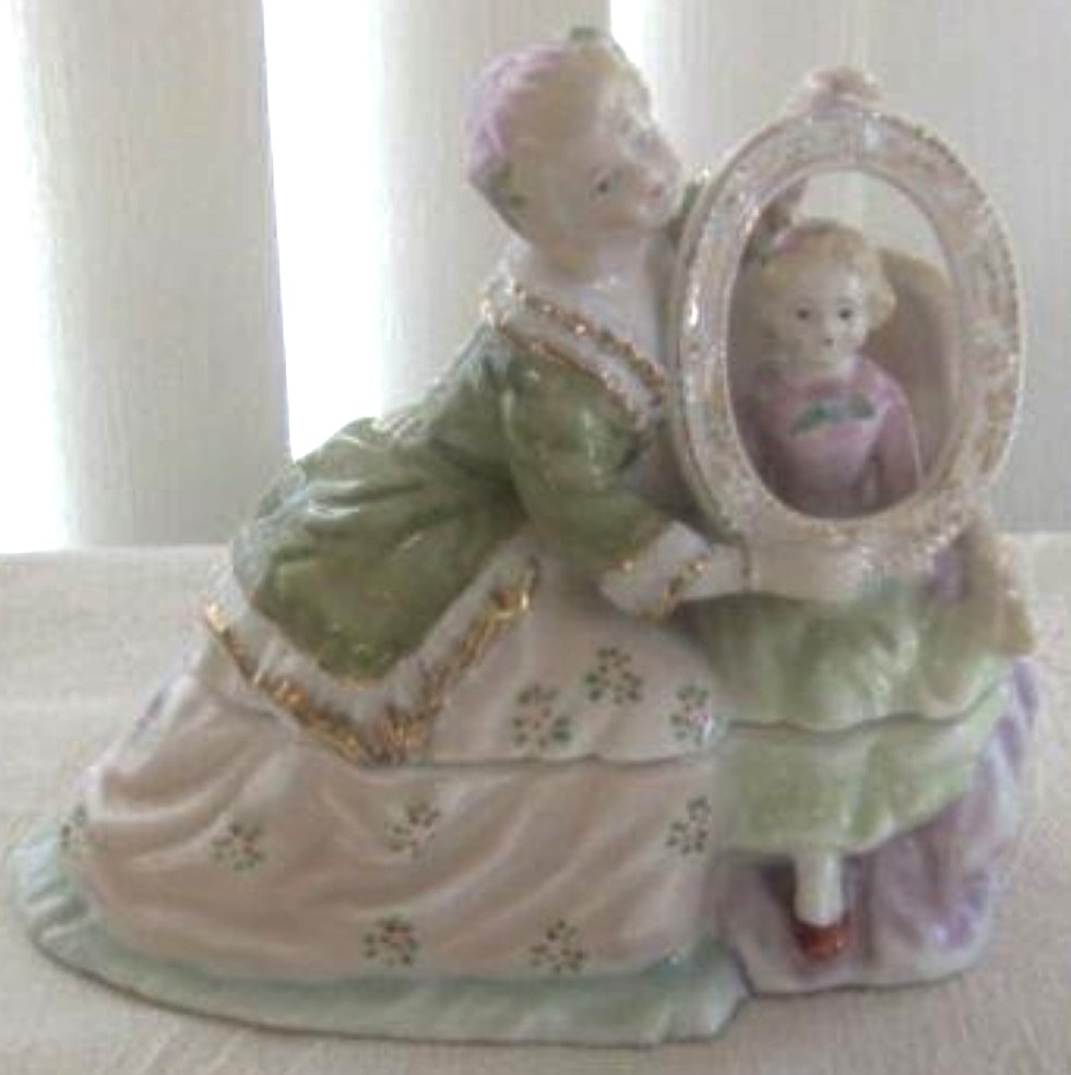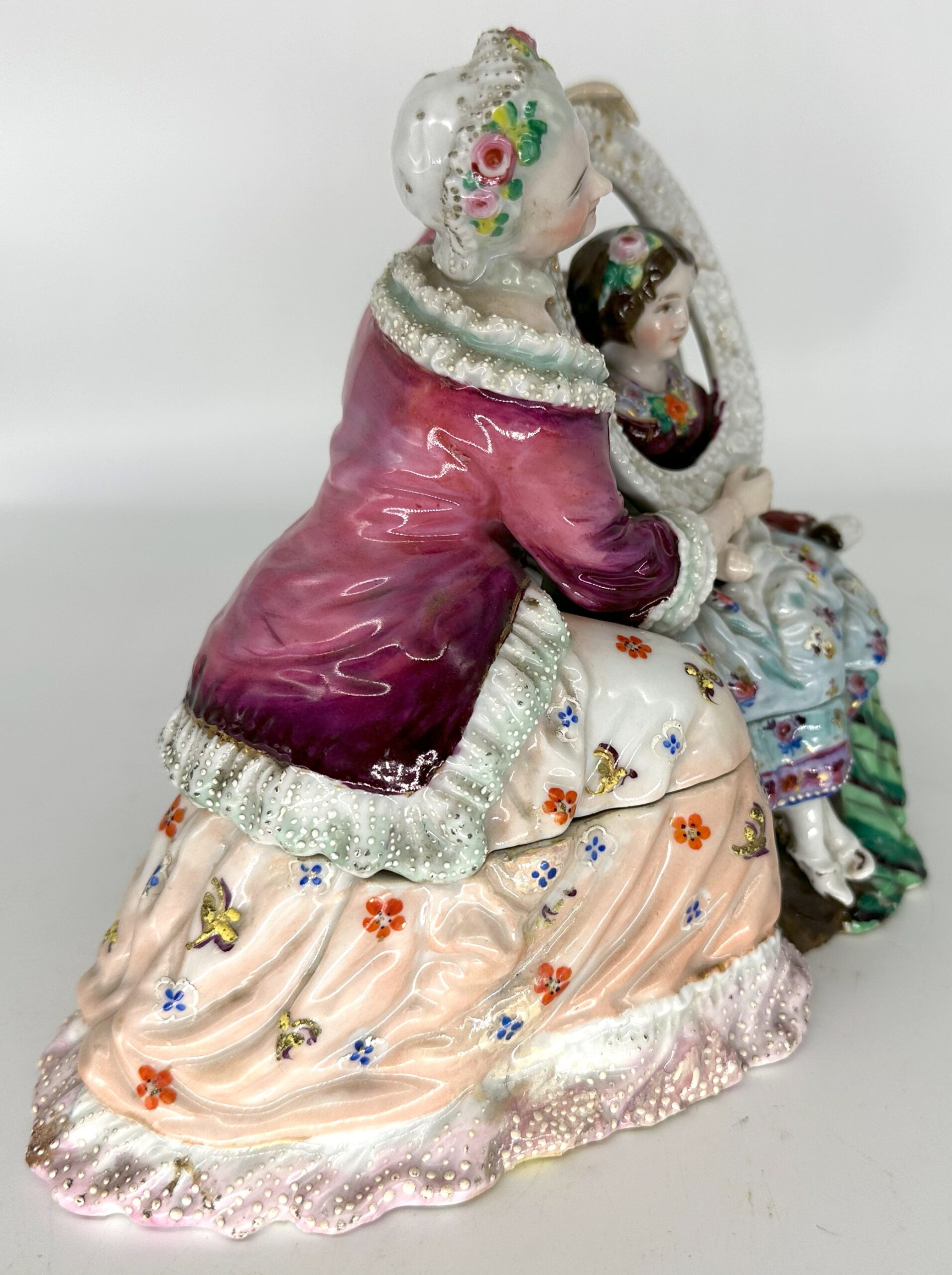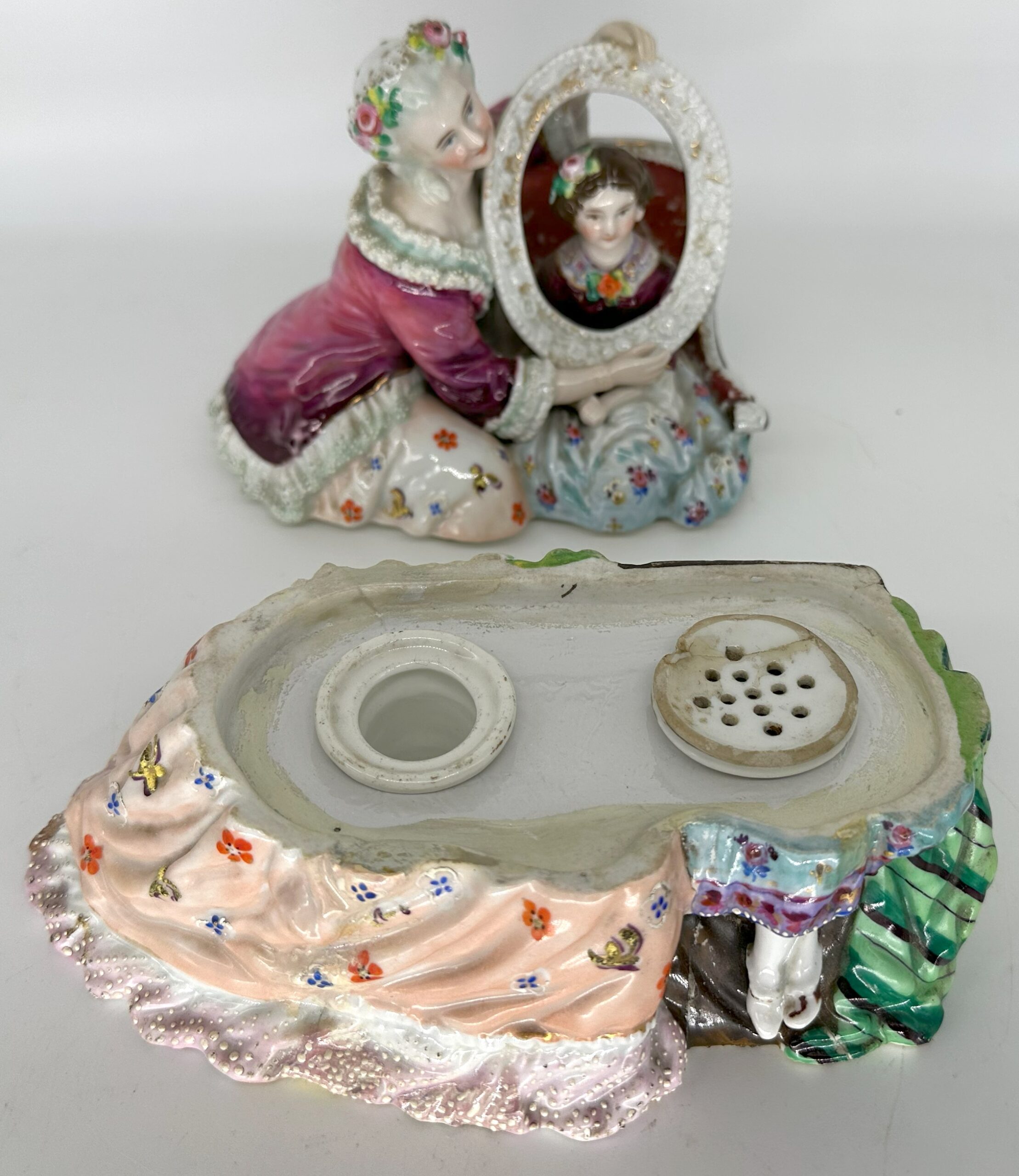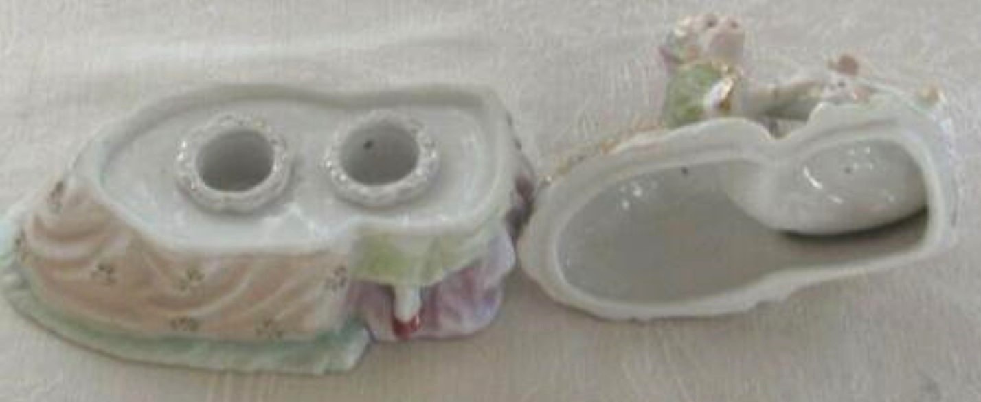 This inkstand features two porcelain figures – a mother and her daughter. The mother holds up an object (a picture frame? a mirror?) that frames the child’s face. The piece was crafted with amazing detail – note the beading, ruffles, lace, patterns on the clothing. The top lifts off to access the ink pot and sander underneath. Conta Boehme (Germany) made this inkstand.